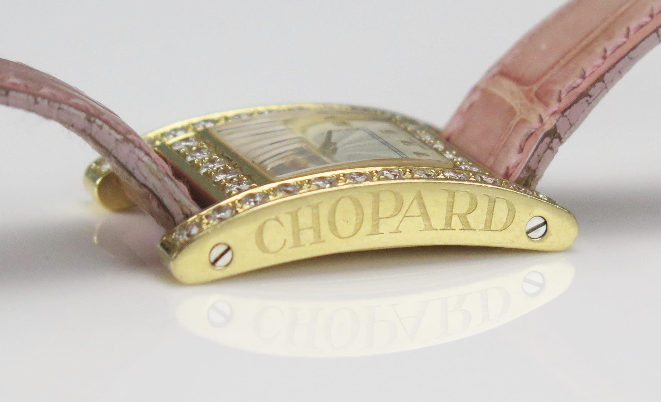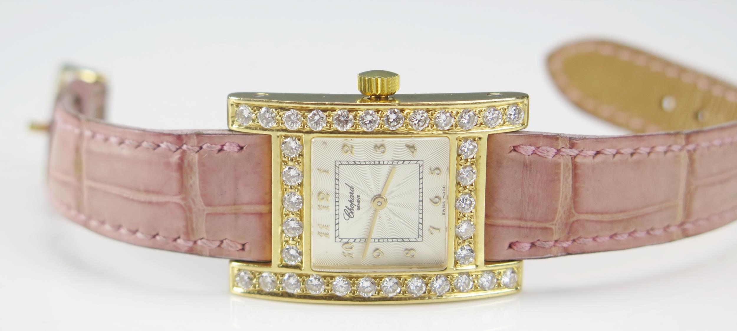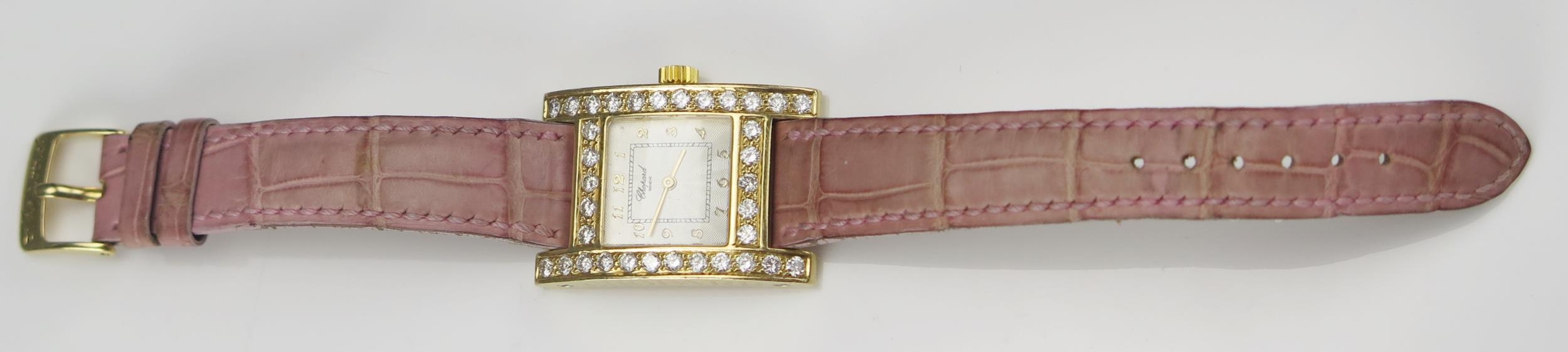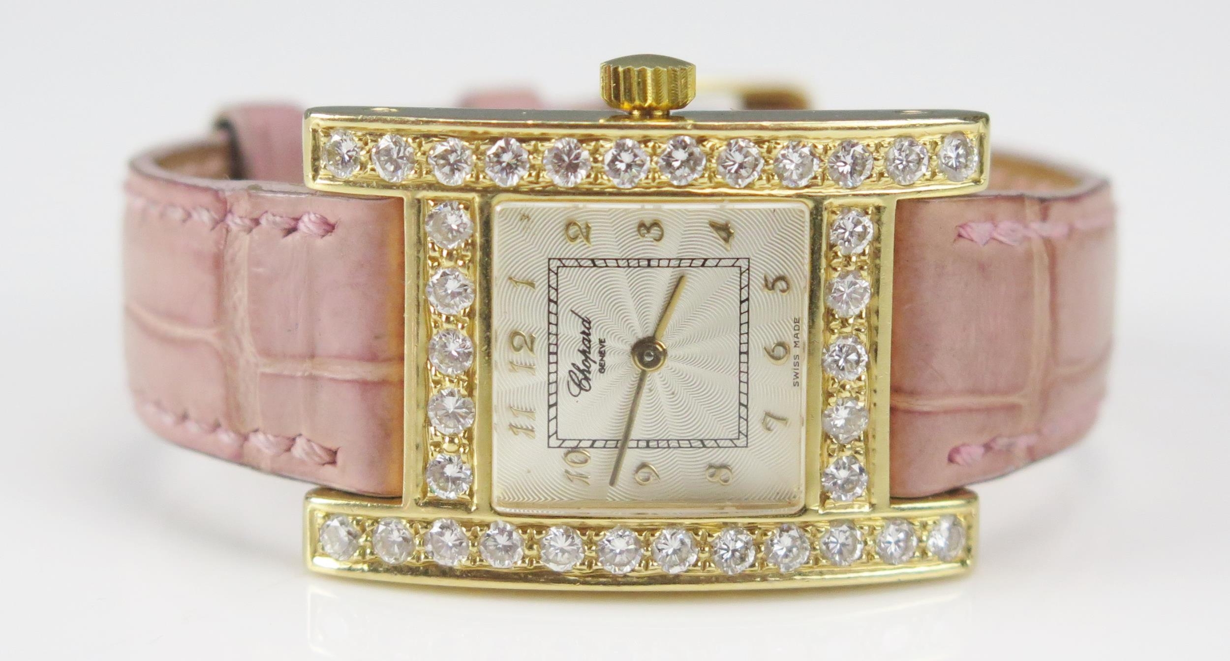 A Chopard 18ct Gold and Diamond Lady's Wristwatch set with c. 3.5ct of diamonds, c. 25.2x24.4mm, case no. 531619 445 1 11/7406 and on a Chopard pink leather strap with 18ct gold clasp