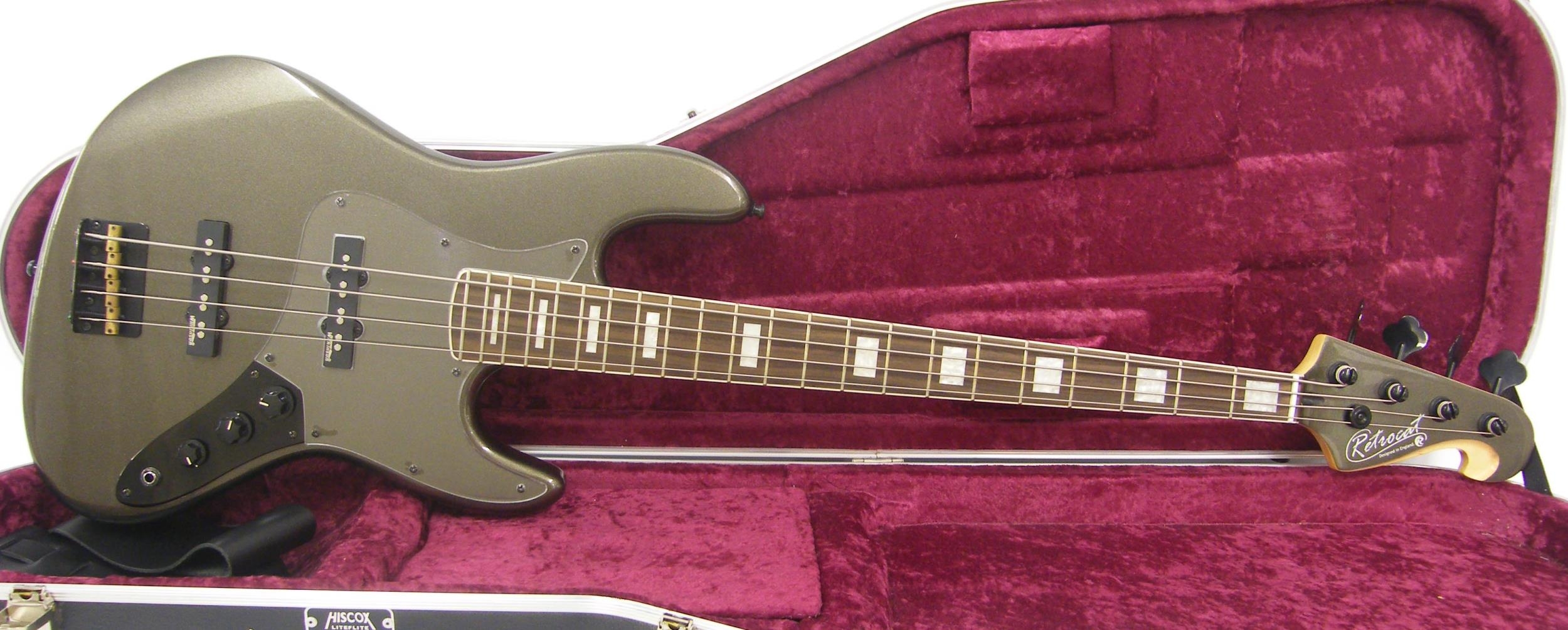 RMI Retrocat bass guitar, metallic pewter finish, electrics in working order, Hiscox hard case, condition: good