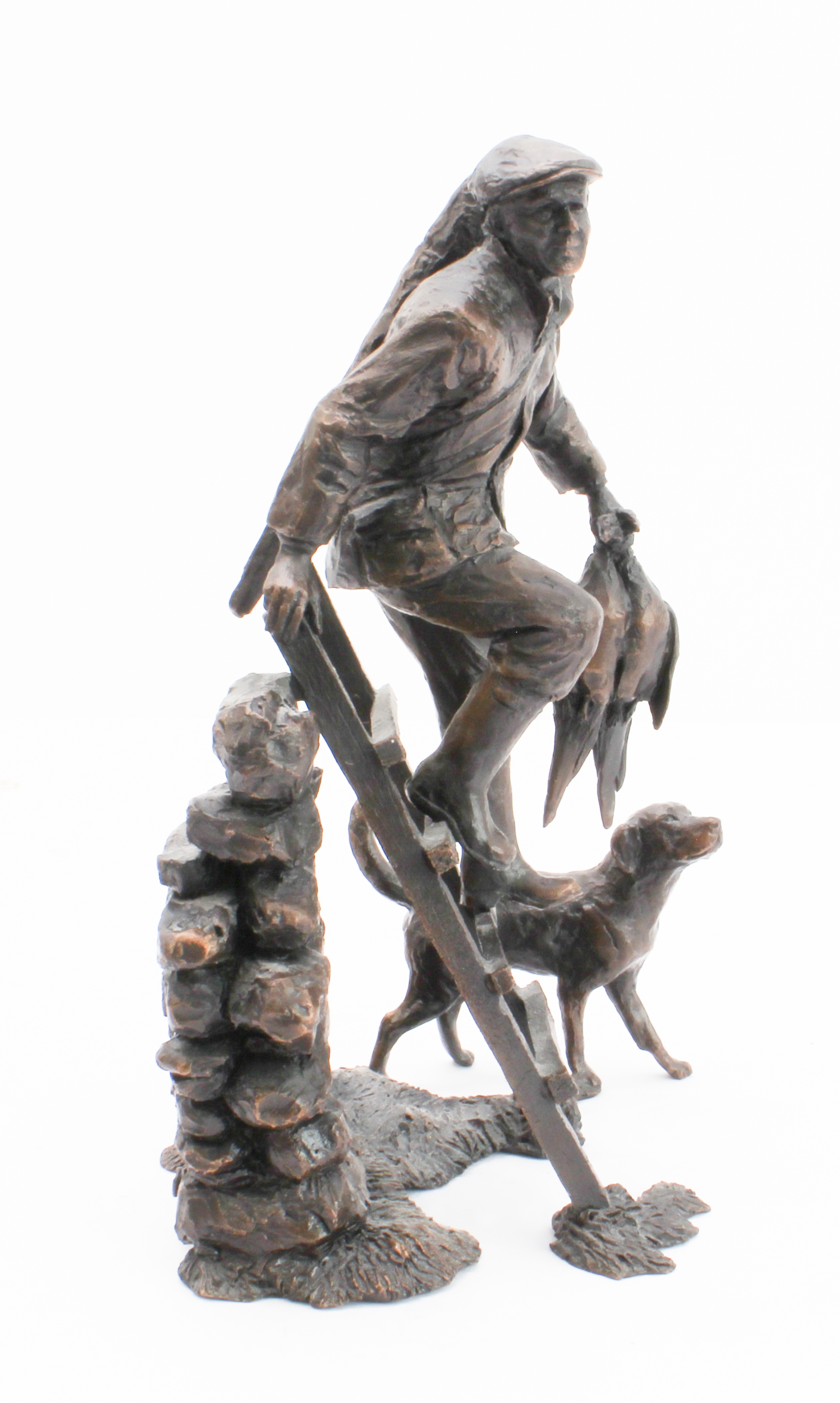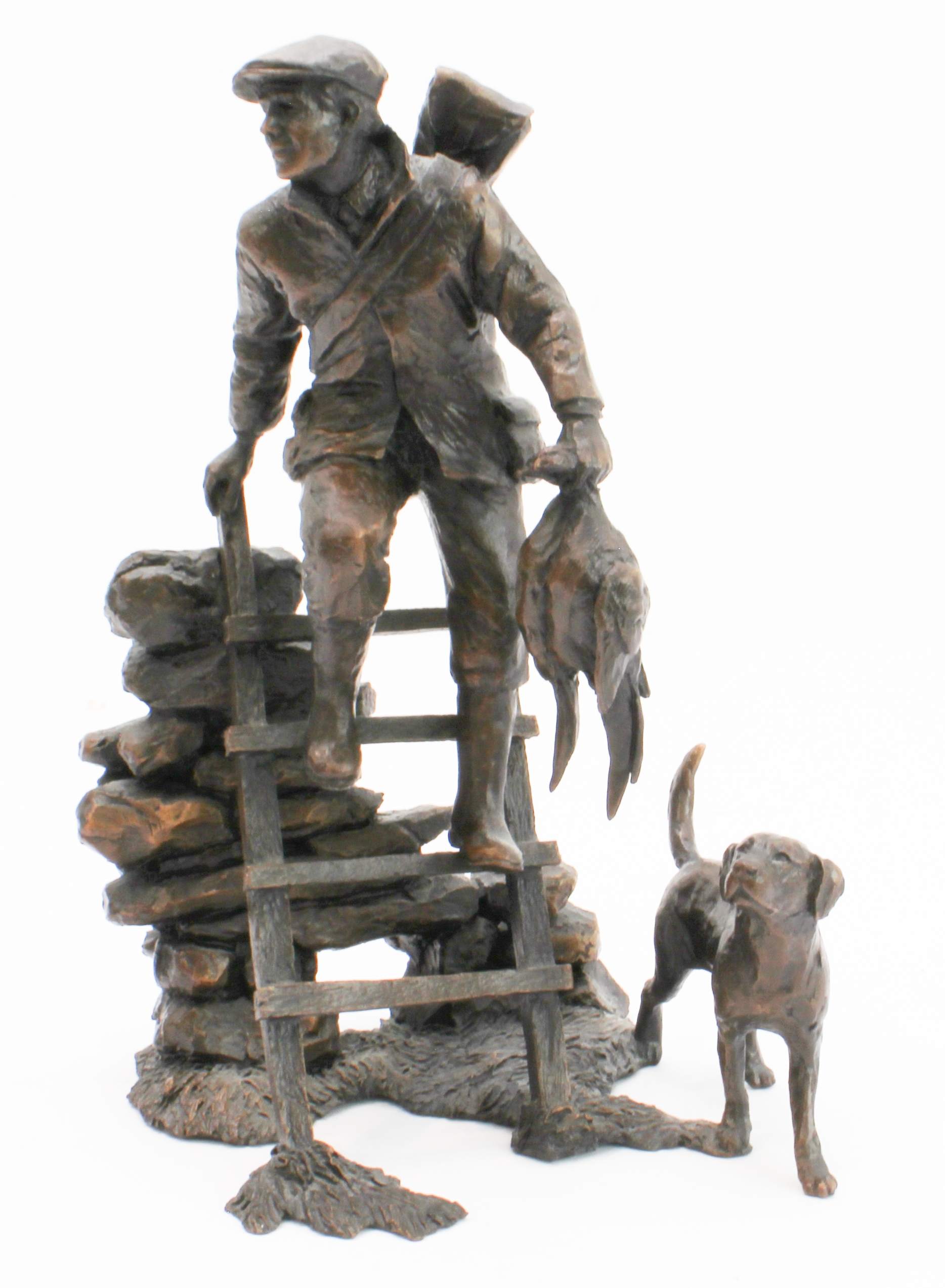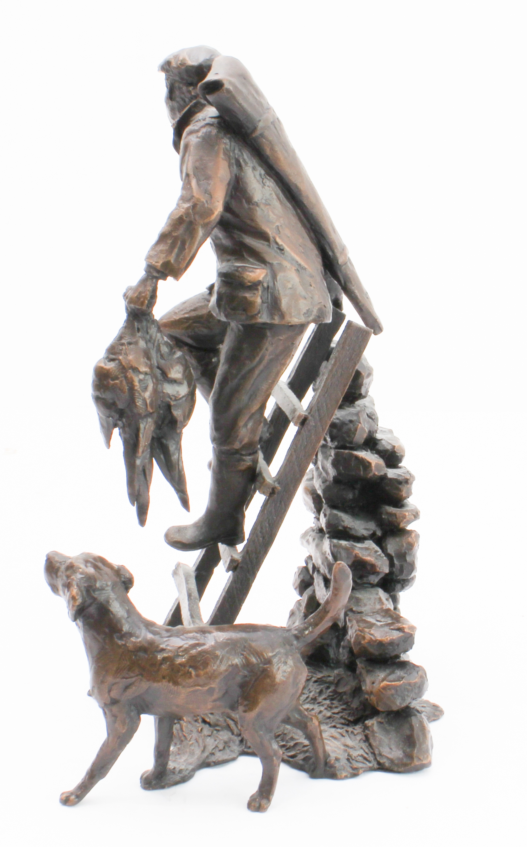 1. Gun and gundog climbing overa wall - limited edition bronze (4 of 75) with maker's stamp to lower back, (17 cm high).