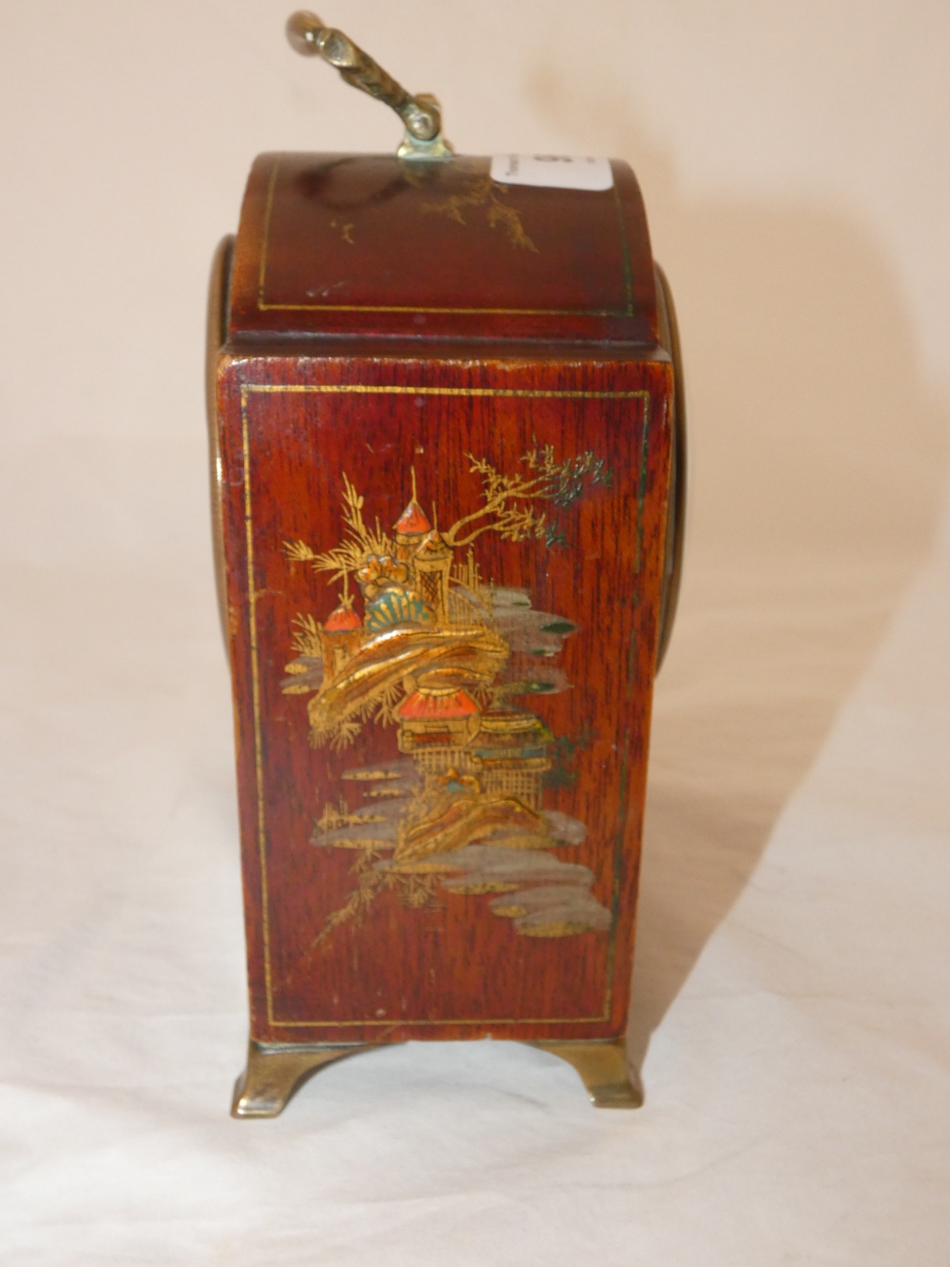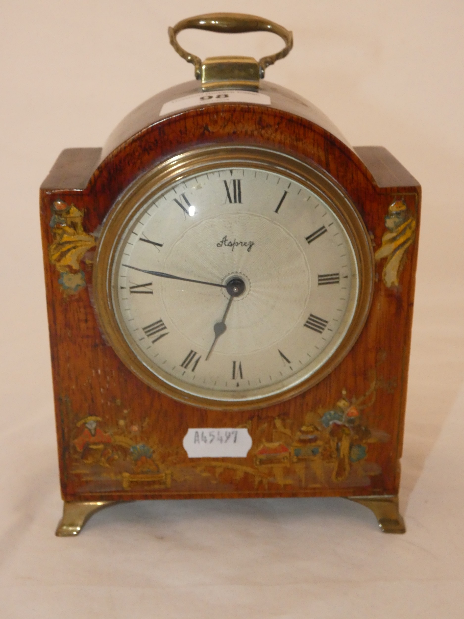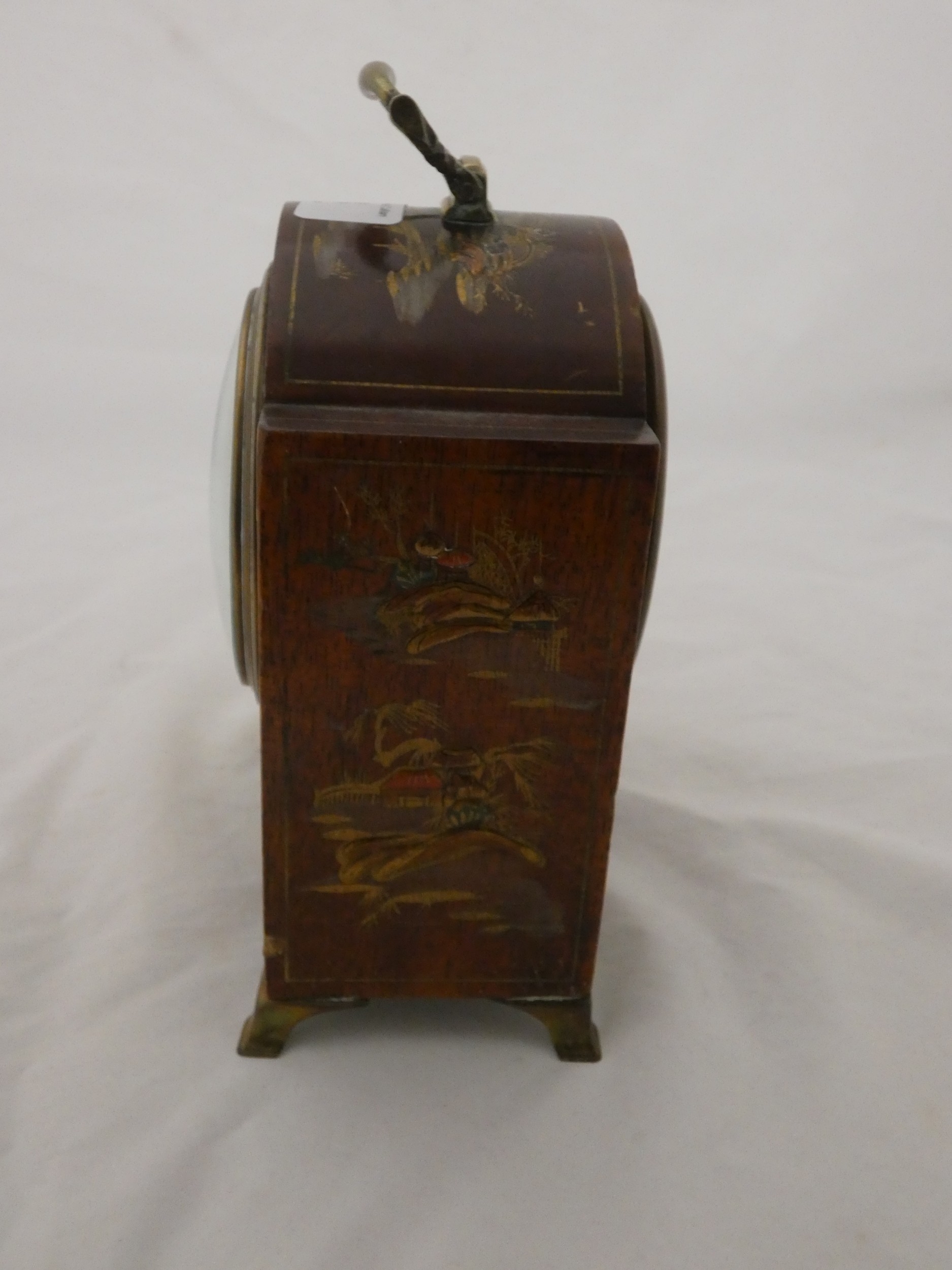 Asprey chinoiserie mantel clock with gilt feet and handle. Height approx. 17cms.