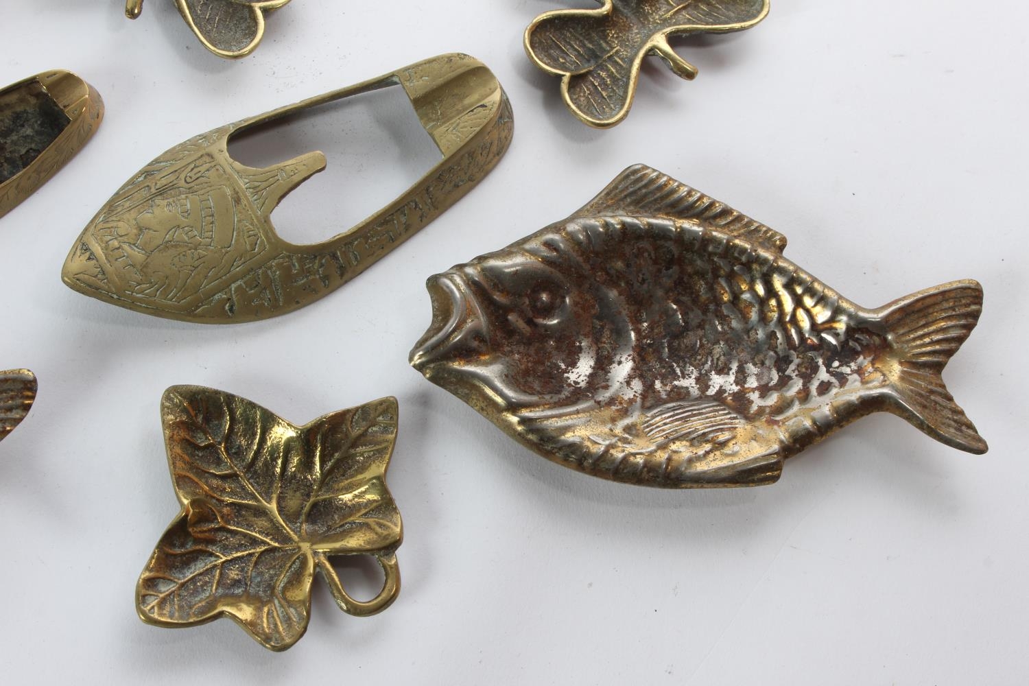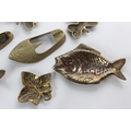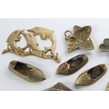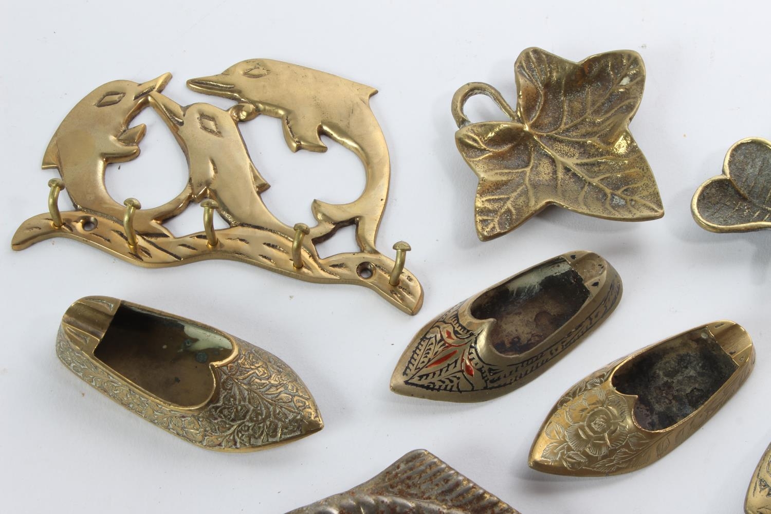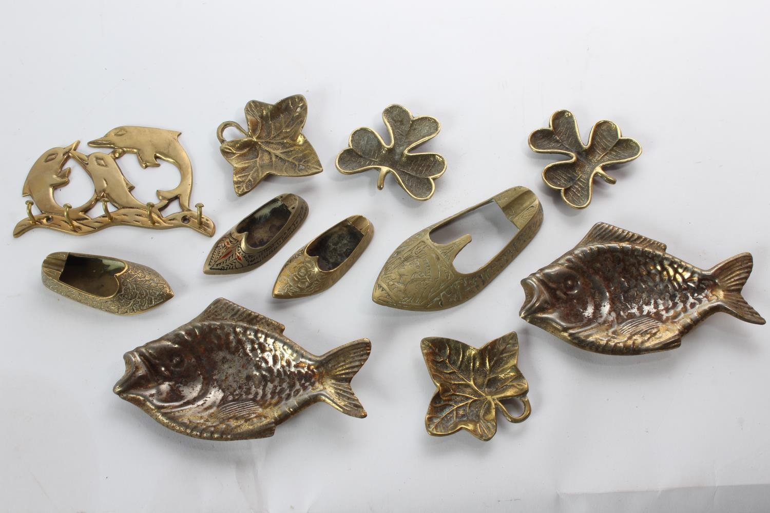 A collection of vintage brass to include Shamrock ashtrays, a dolphin key holder and more.