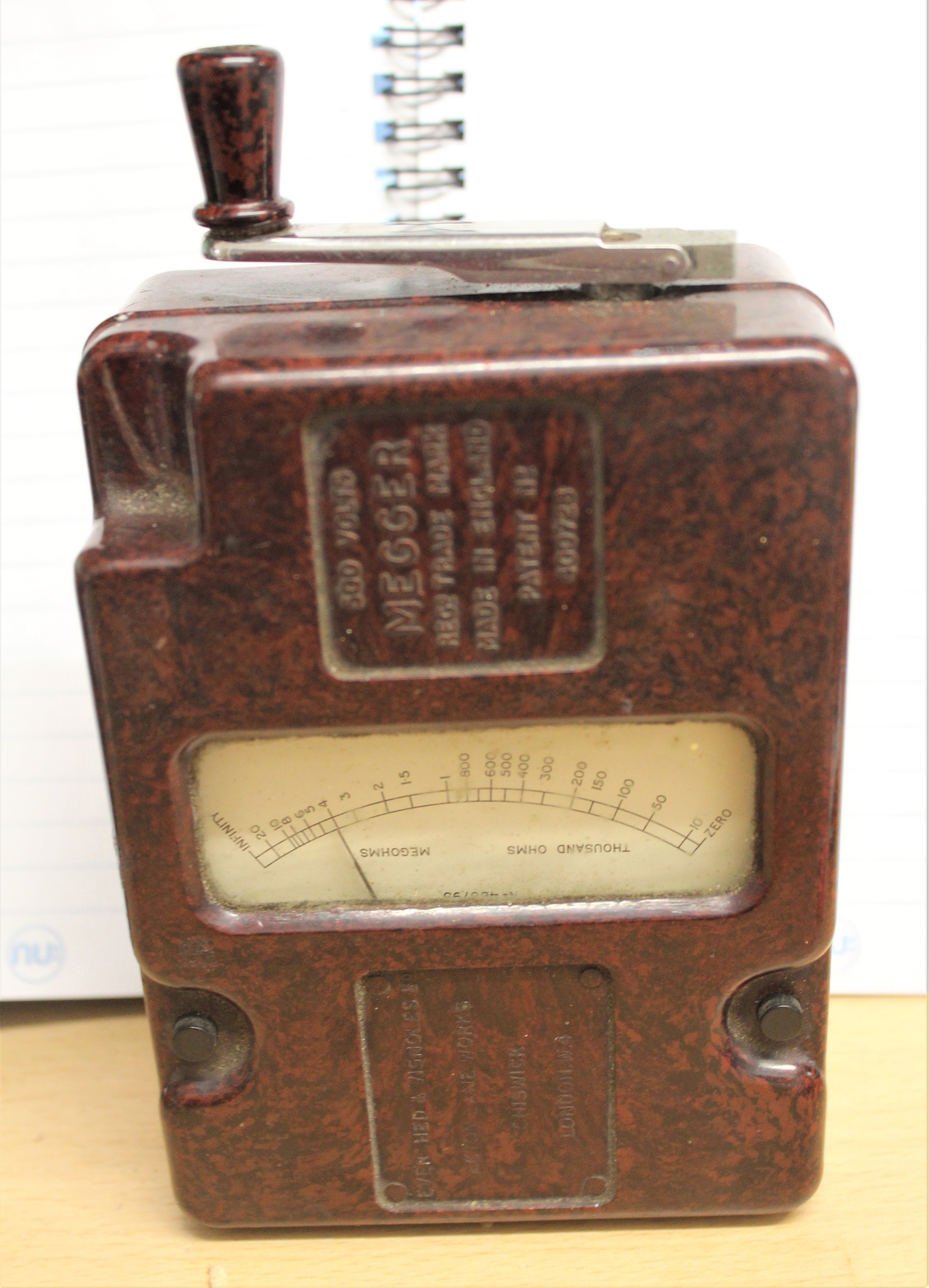Vintage 250 Volts Megger Meter by Evershed & Vignoles, Bakelite 1940s 50s - fashioned in red bakelite and features an analogue display with a chromium crank handle. Made in the Acton Lane works, Chiswick, London, England.