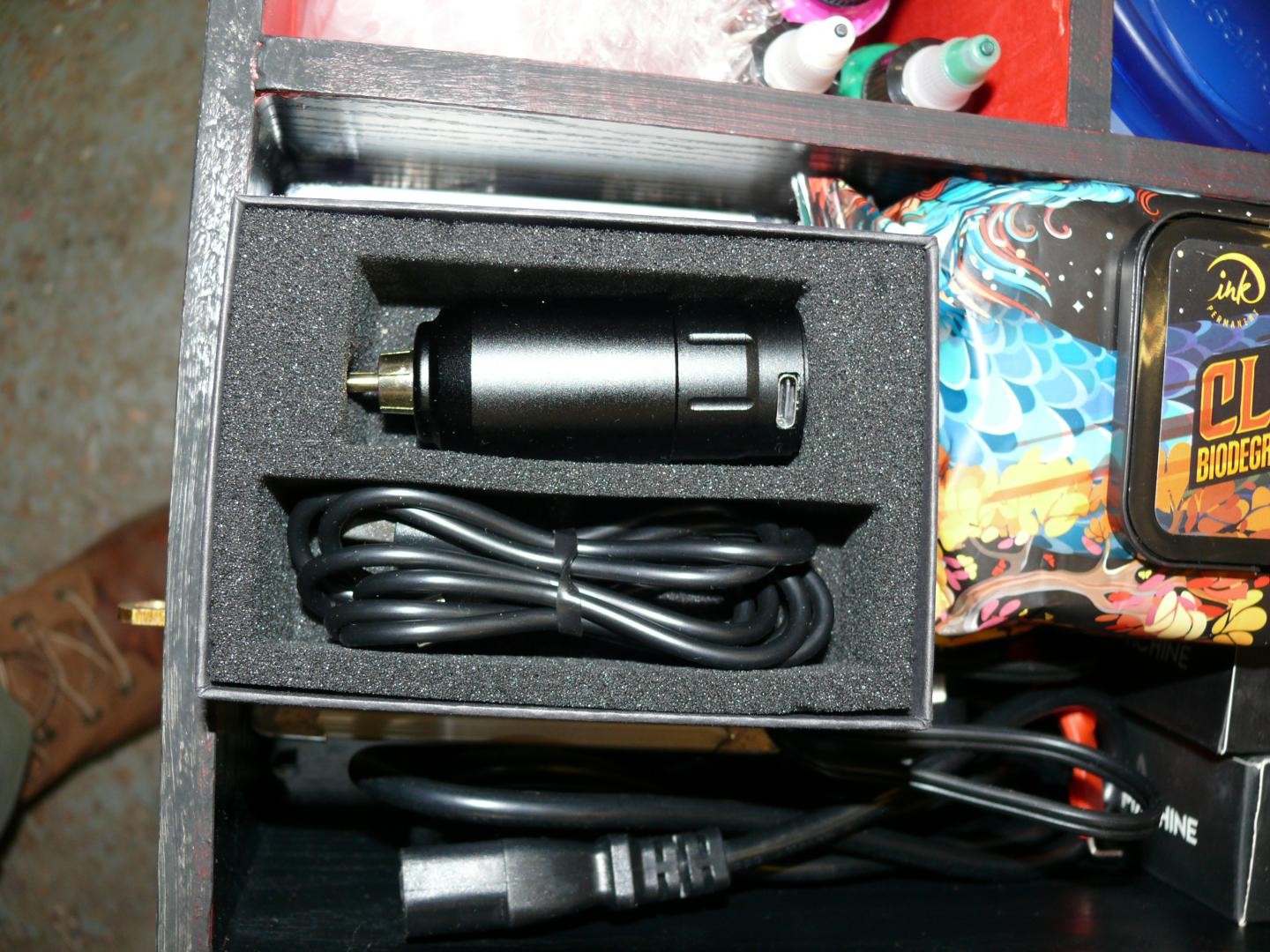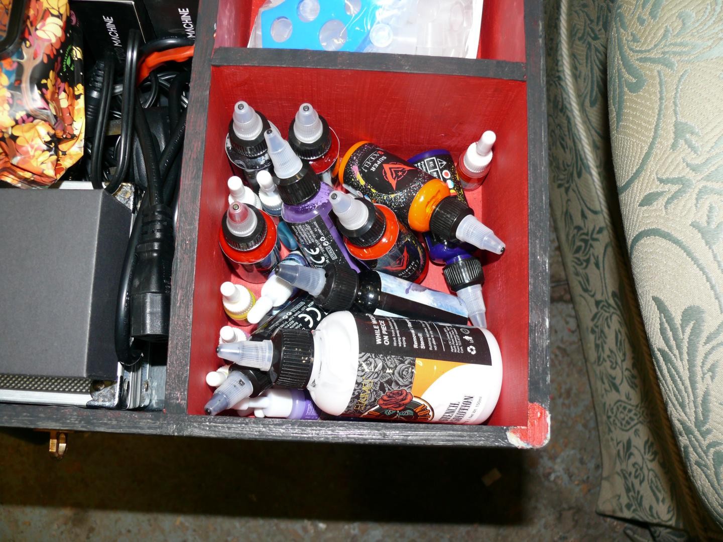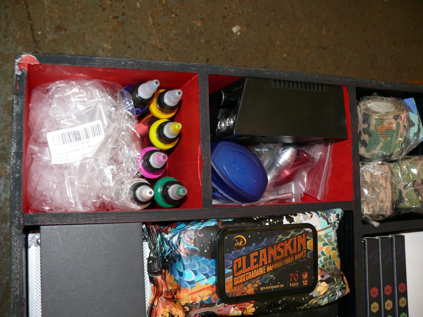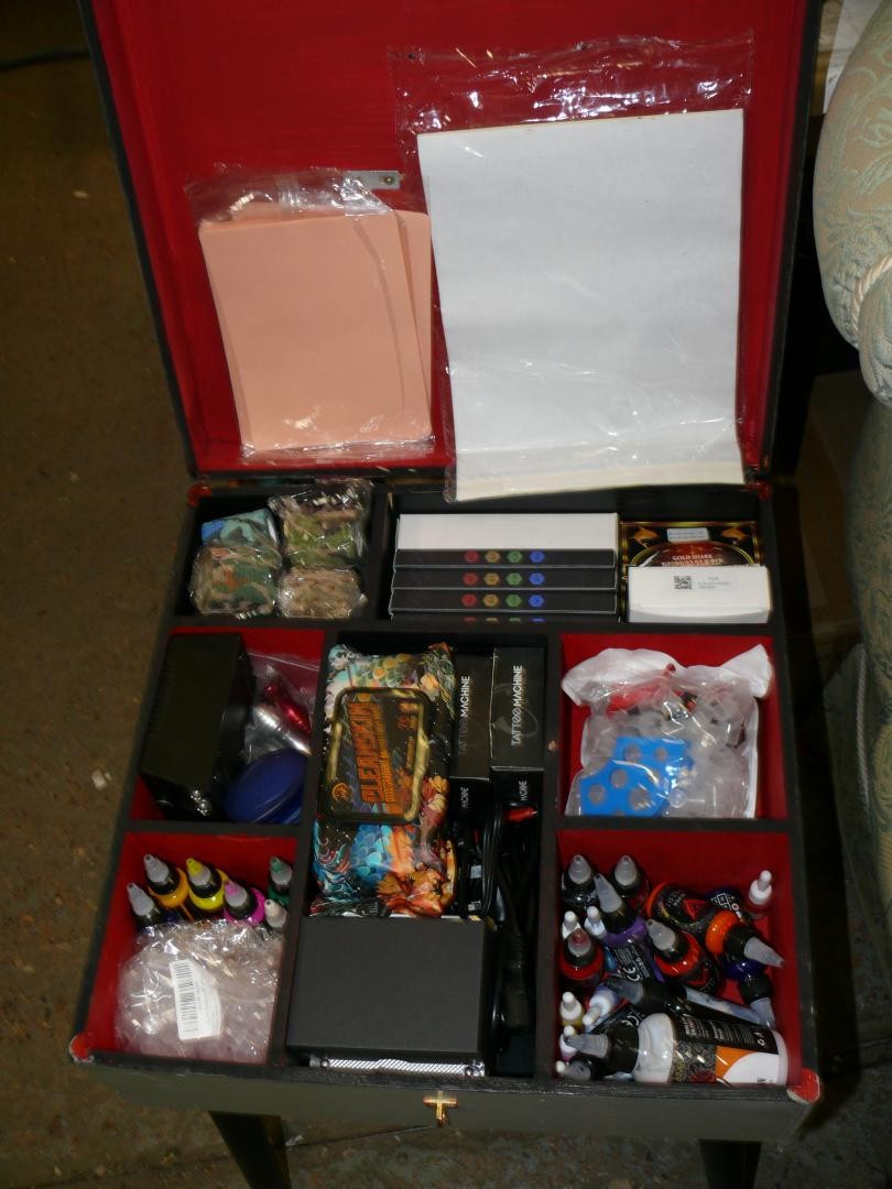 LOVELY BOX WITH LIFT UP LID AND CONTENTS OF TATTOO EQUIPMENT GUNS, INKS, NEEDLES ETC