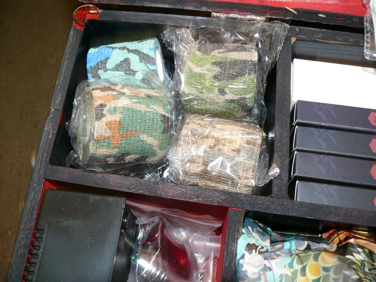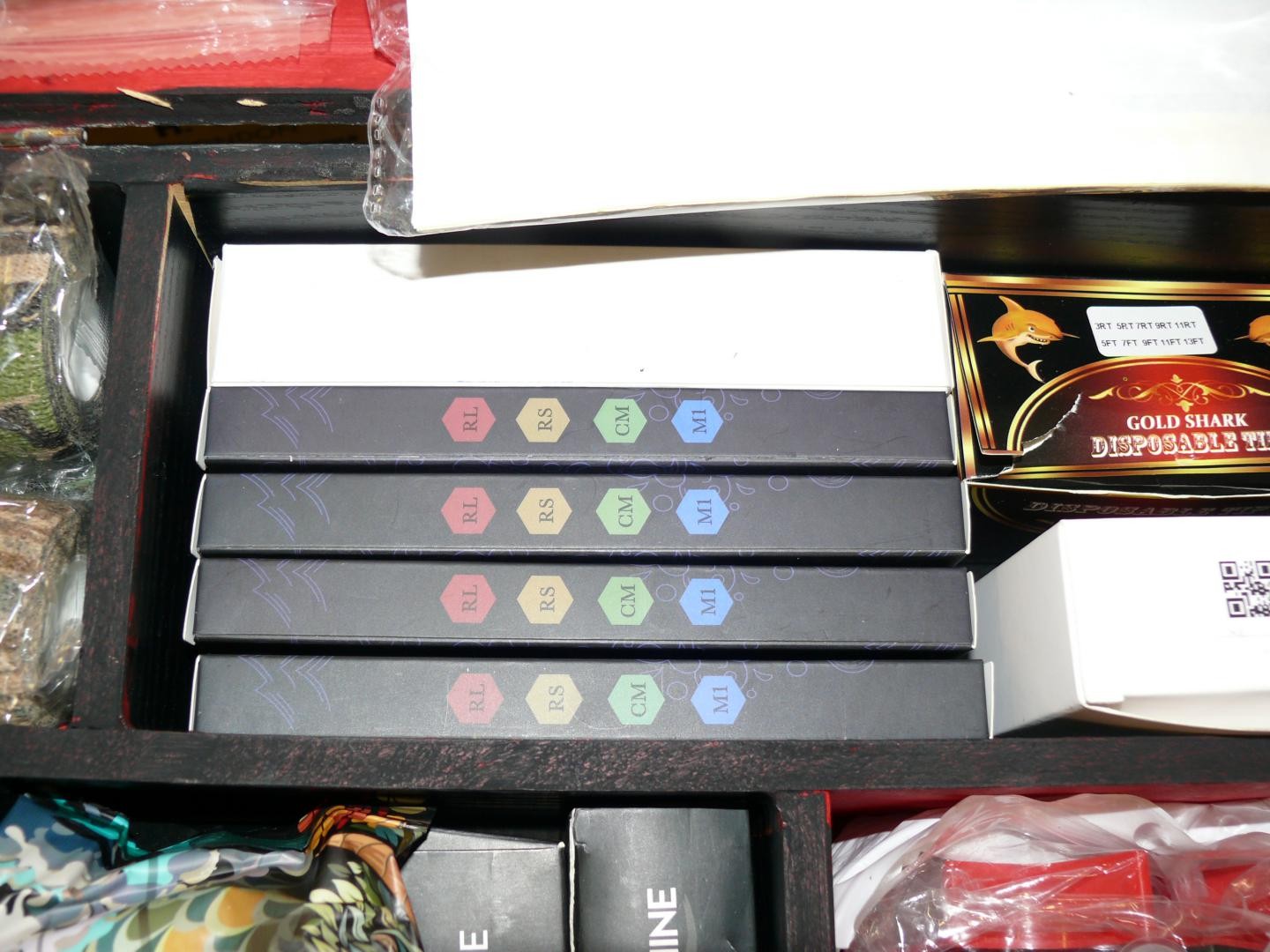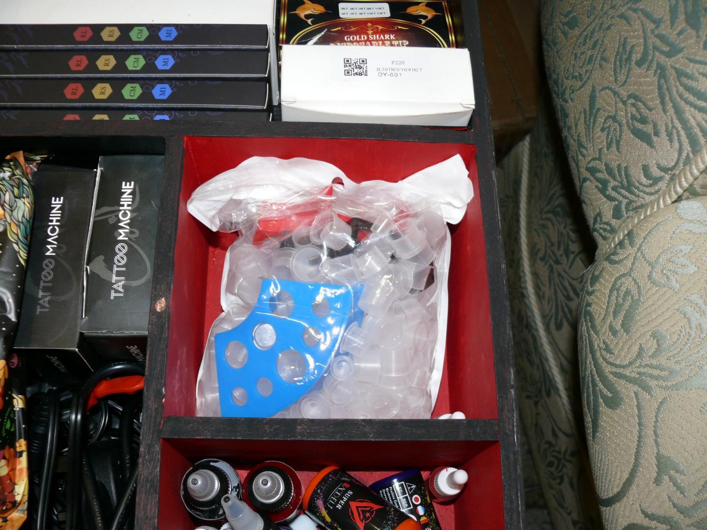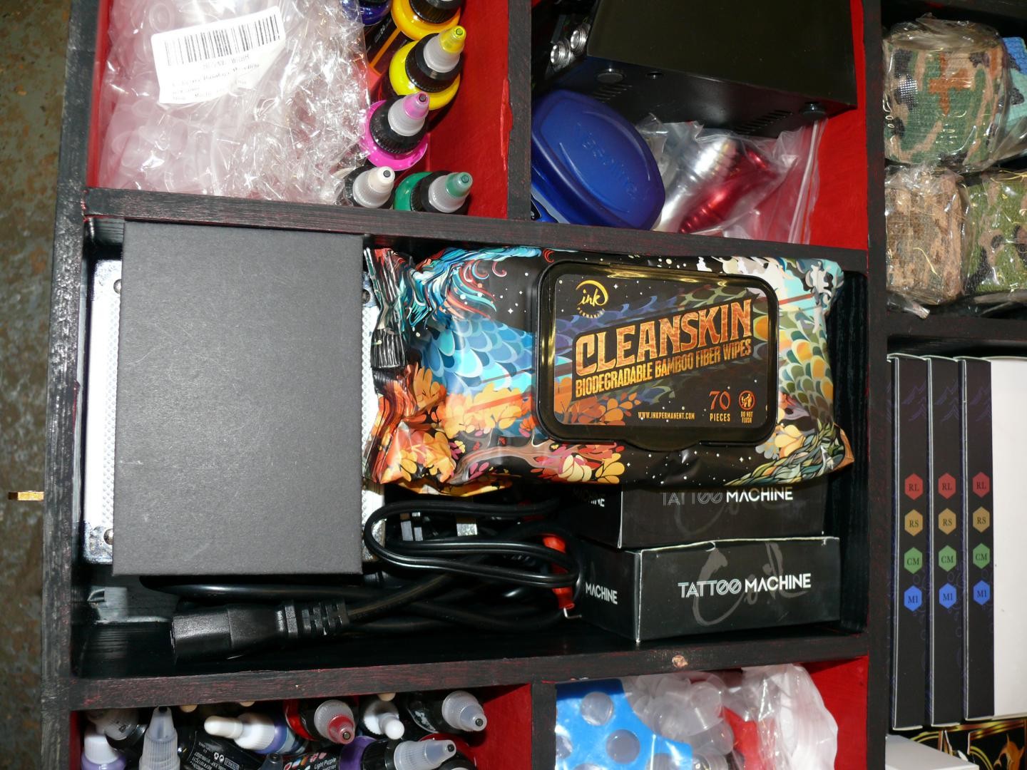 LOVELY BOX WITH LIFT UP LID AND CONTENTS OF TATTOO EQUIPMENT GUNS, INKS, NEEDLES ETC
