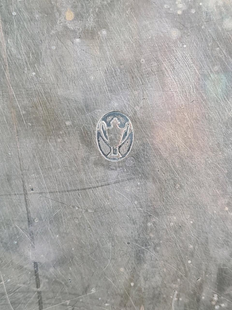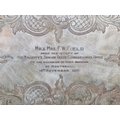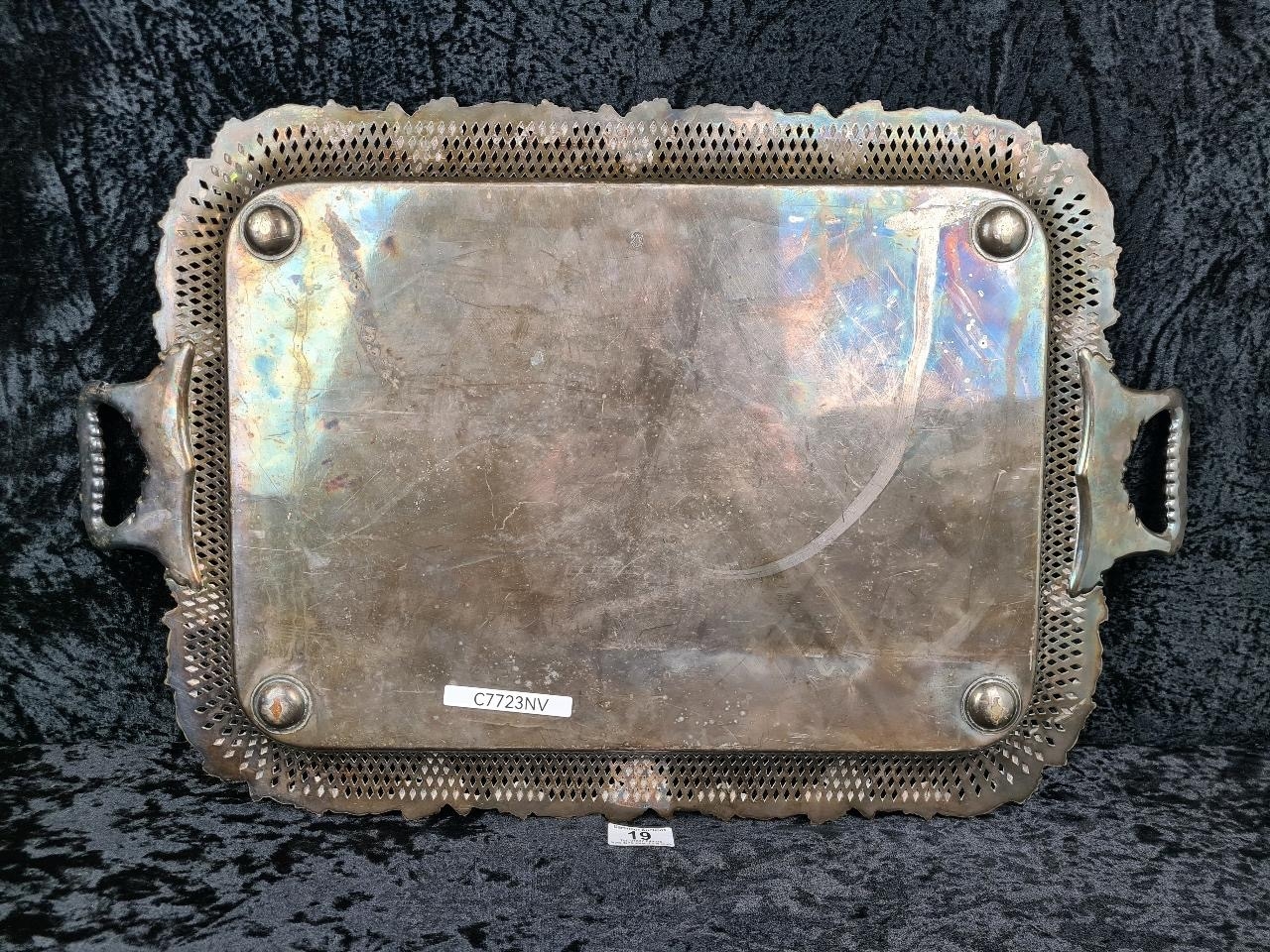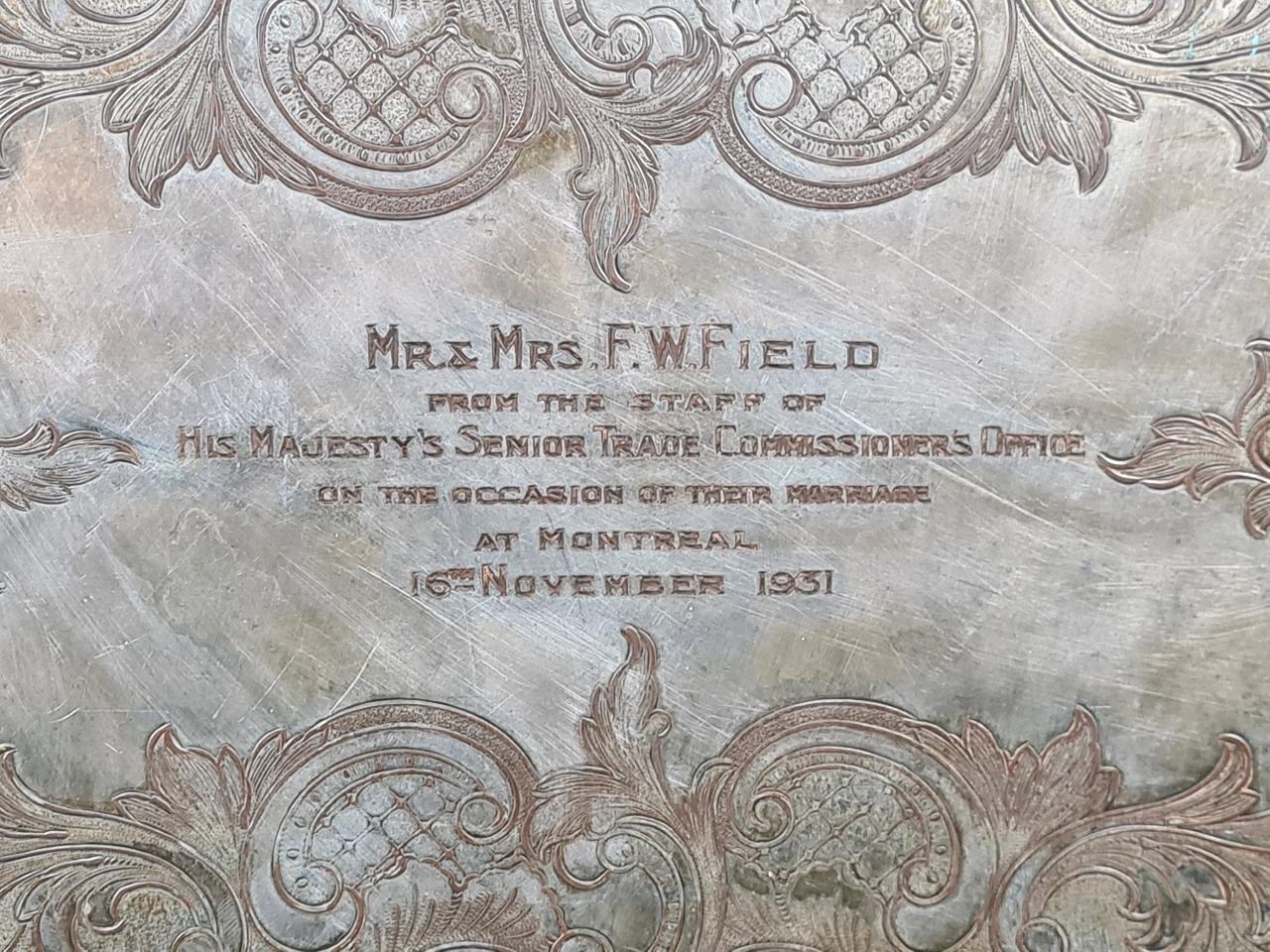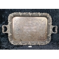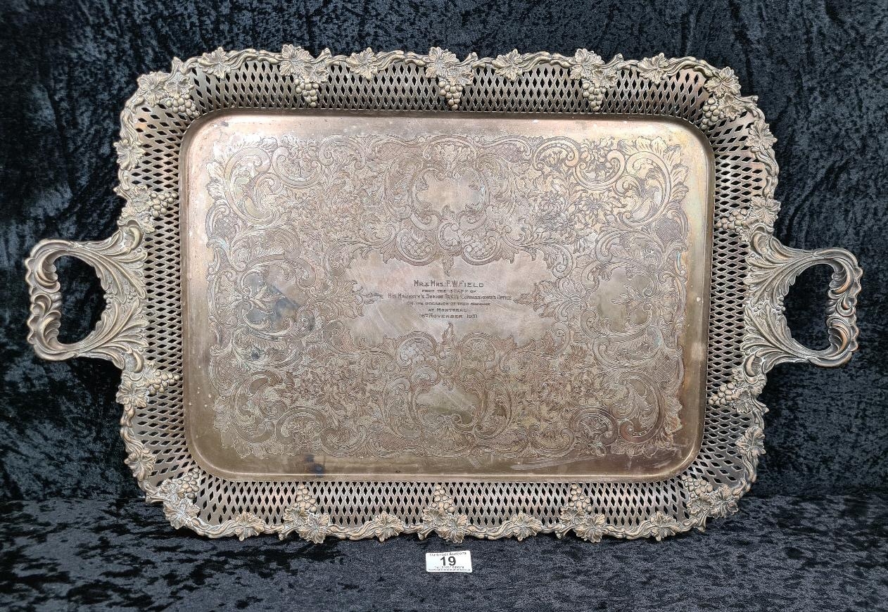 1930s decorative silver-plate tray with a pierced border and scrollwork handles. Enscribed with the words ‘From the staff of His Majesty's Senior Trade Commissioner’s Office’. Approx H 43 x W69cm.