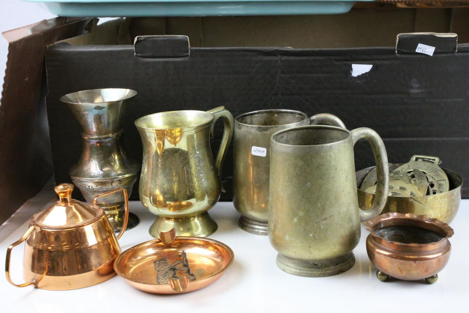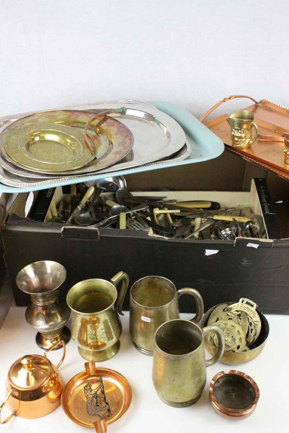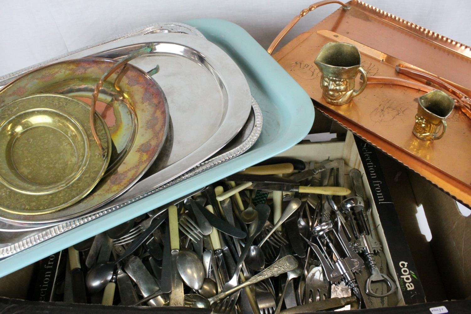 Box of Assorted Metal ware and Cutlery to include Silver Plate / Copper / Brass, etc