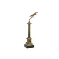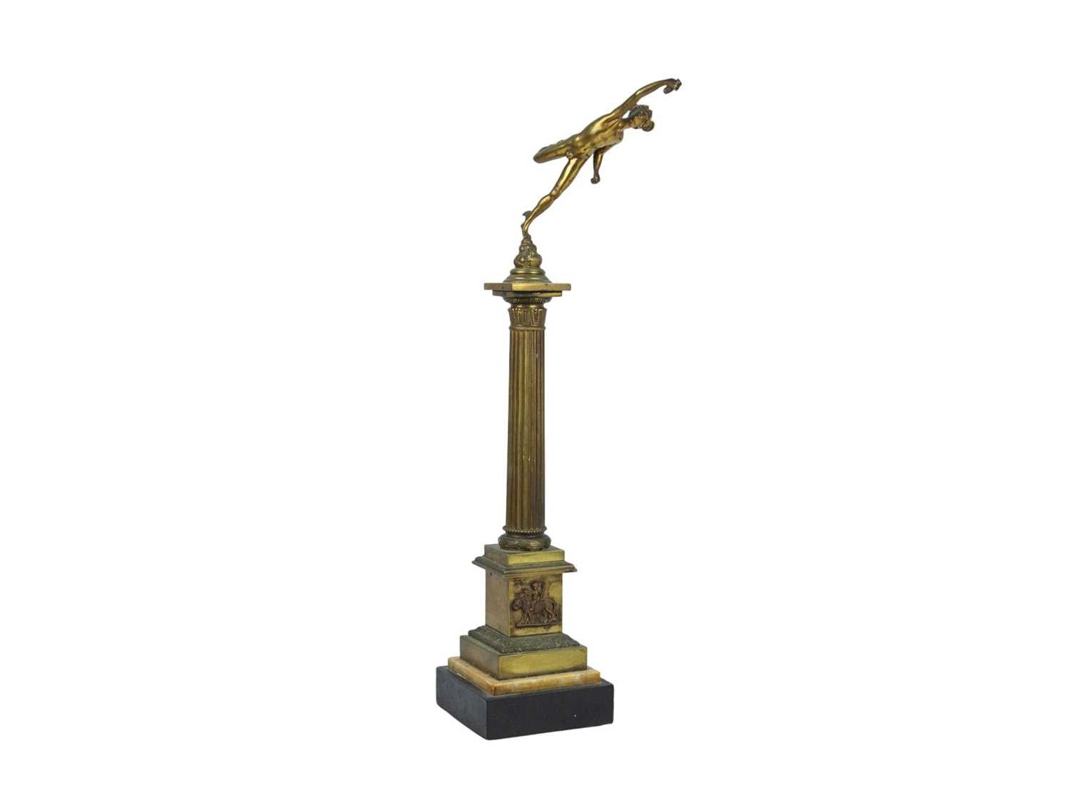 A brass statue of the Roman god Mercury. A 19th century Grand Tour memento of column form, with two relief decorations of Cupid on a lion and lioness, on a stepped marble base, height 48cm.