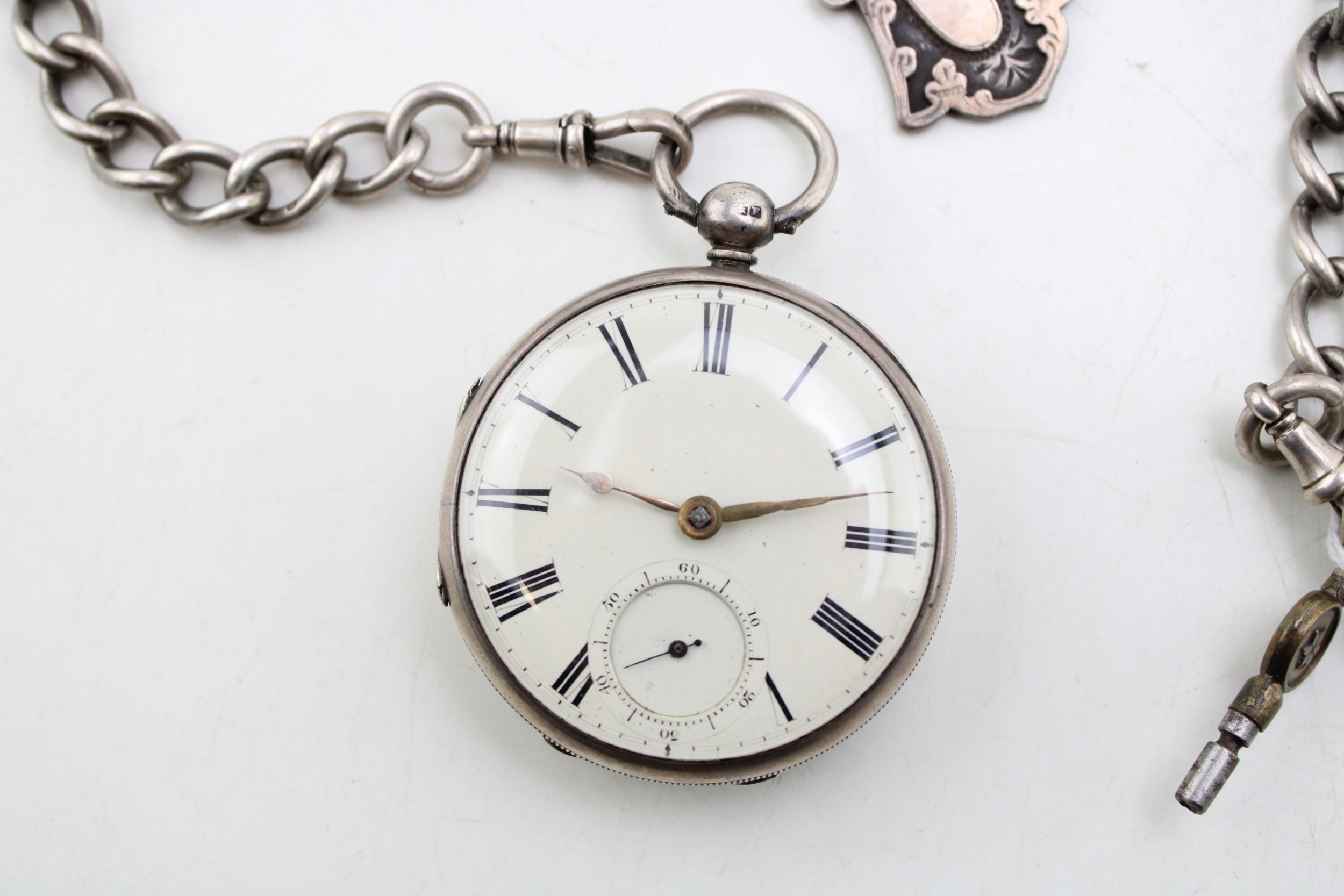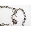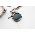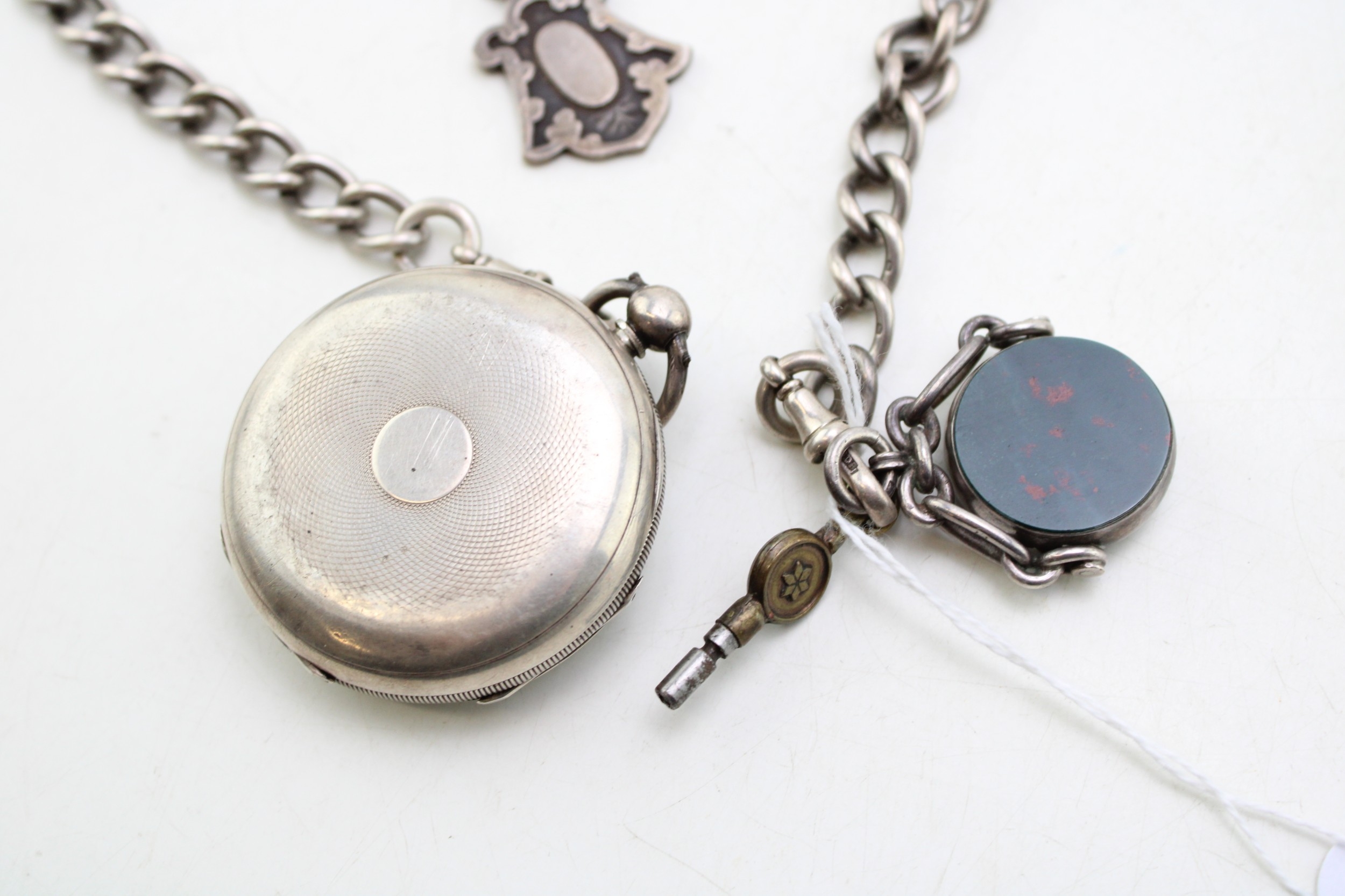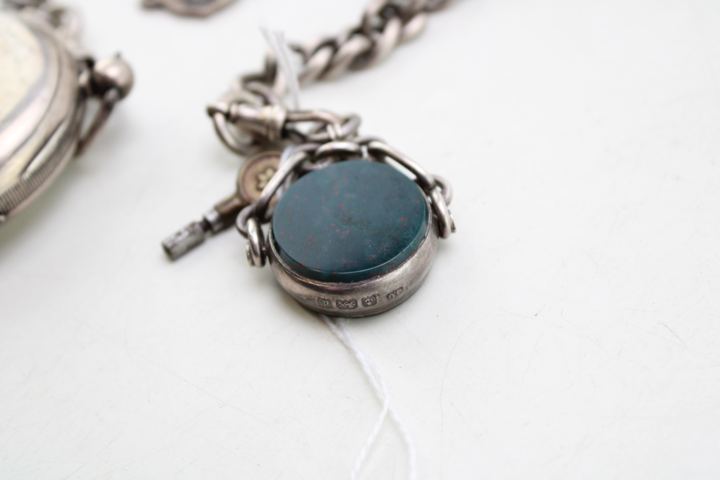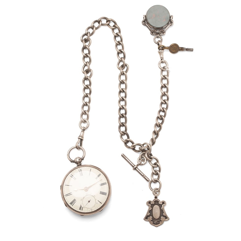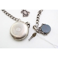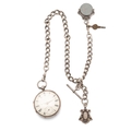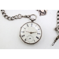 Silver open faced pocket watch, Chester 1899, Roman numeral hour markers, subsidiary dial for seconds with key, together with silver Albert chain, graduated links, with fob, T bar and clasp, (77.3g) together with a bloodstone spinner fob.
