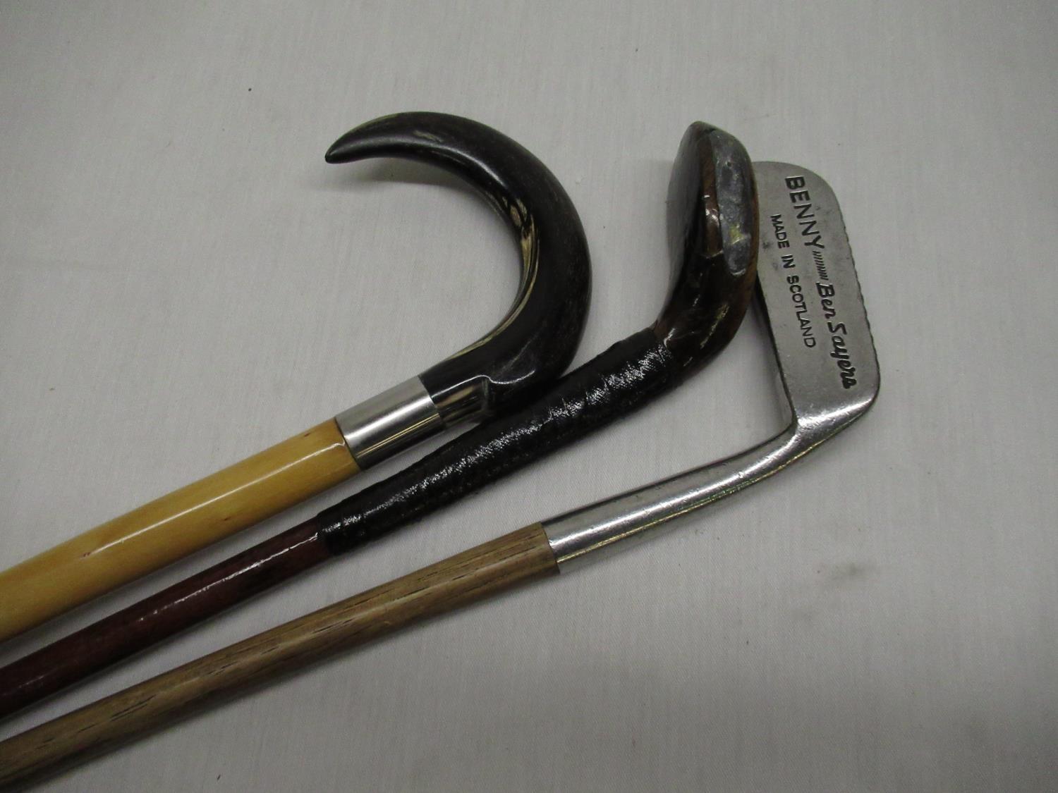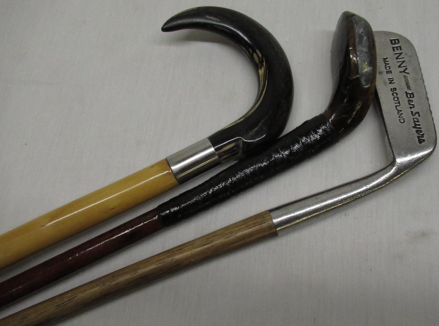 Early C20th Sunday stick with horned foot & leaded weight. L81cm, Ben Sayers "Bemmy" golf club with hickory shaft & leather grip, Alpine style walking stick with horn handle and stainless steel mount.
