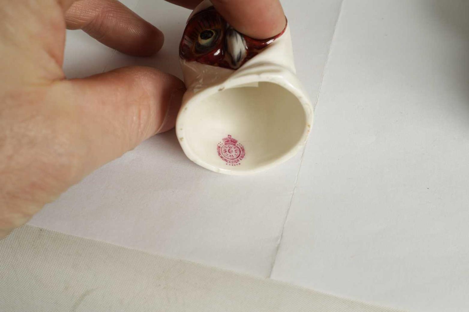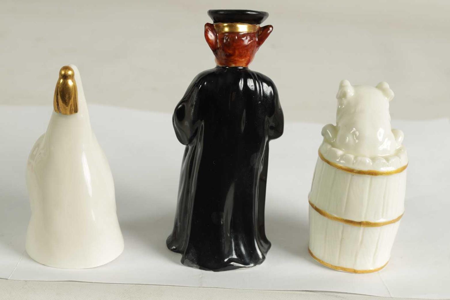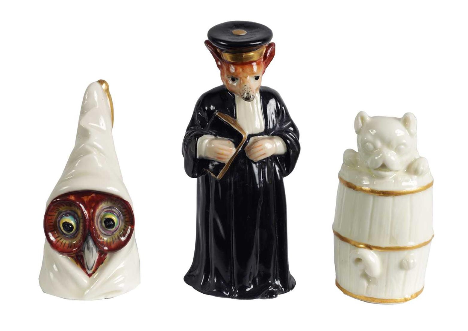 A COLLECTION OF ROYAL WORCESTER CANDLE EXTINGUISHERS circa 1880, 1909 and 1925 comprising of Dog in a Barrel, Owl, and Monsieur Reynard with green and puce marks to underside (3) - illustrated on pages 27, 39 and 63 of Distinguished Extinguishers by Tony Horsley (Tallest 10.2cm high )