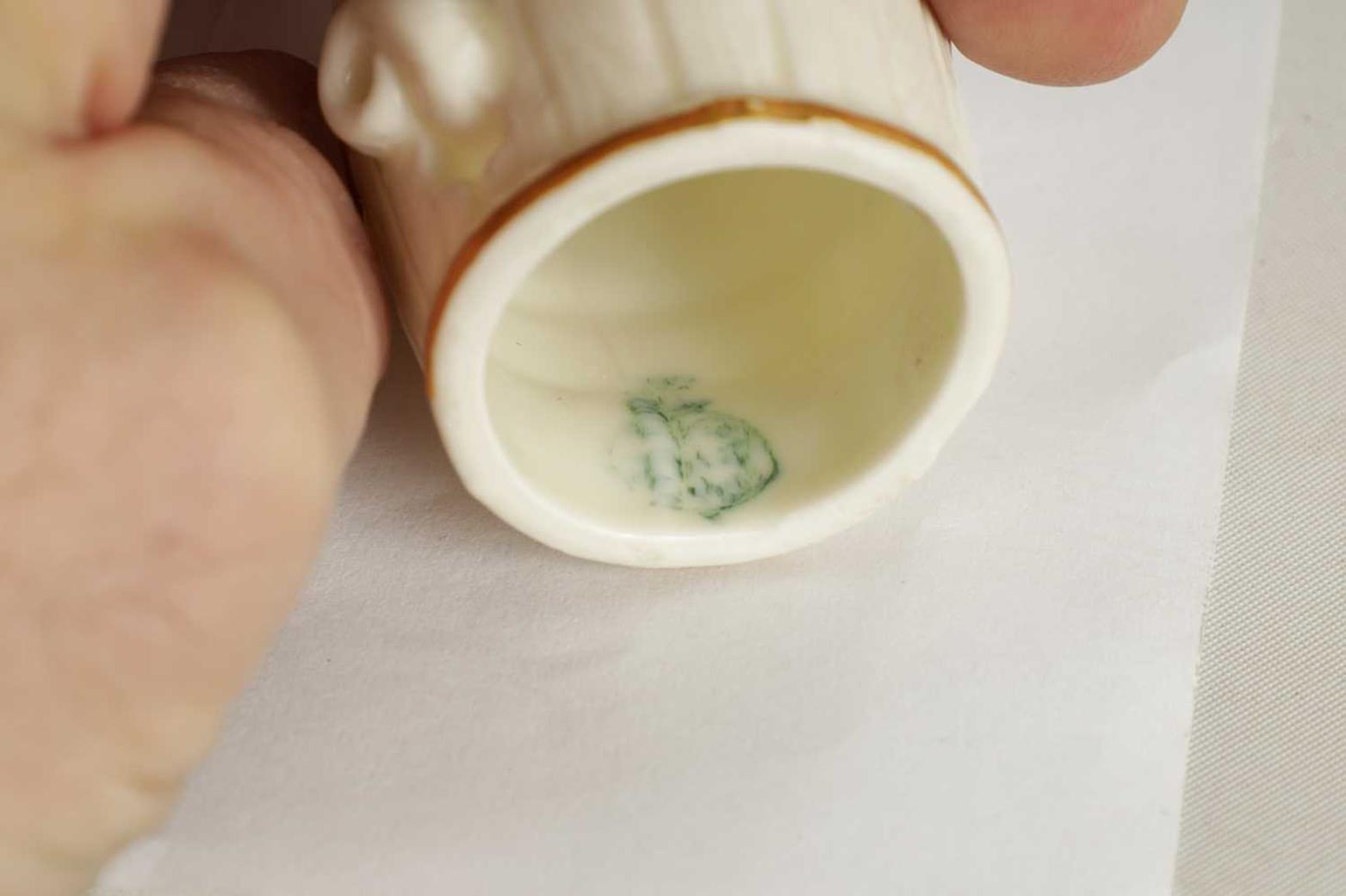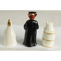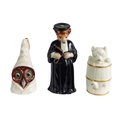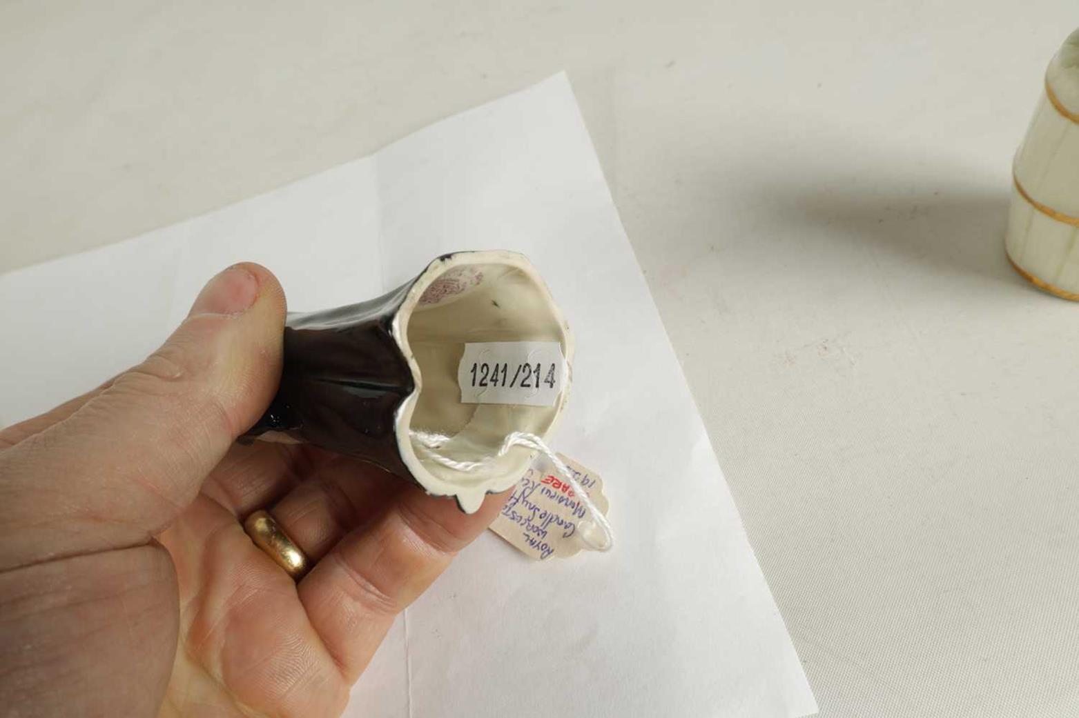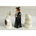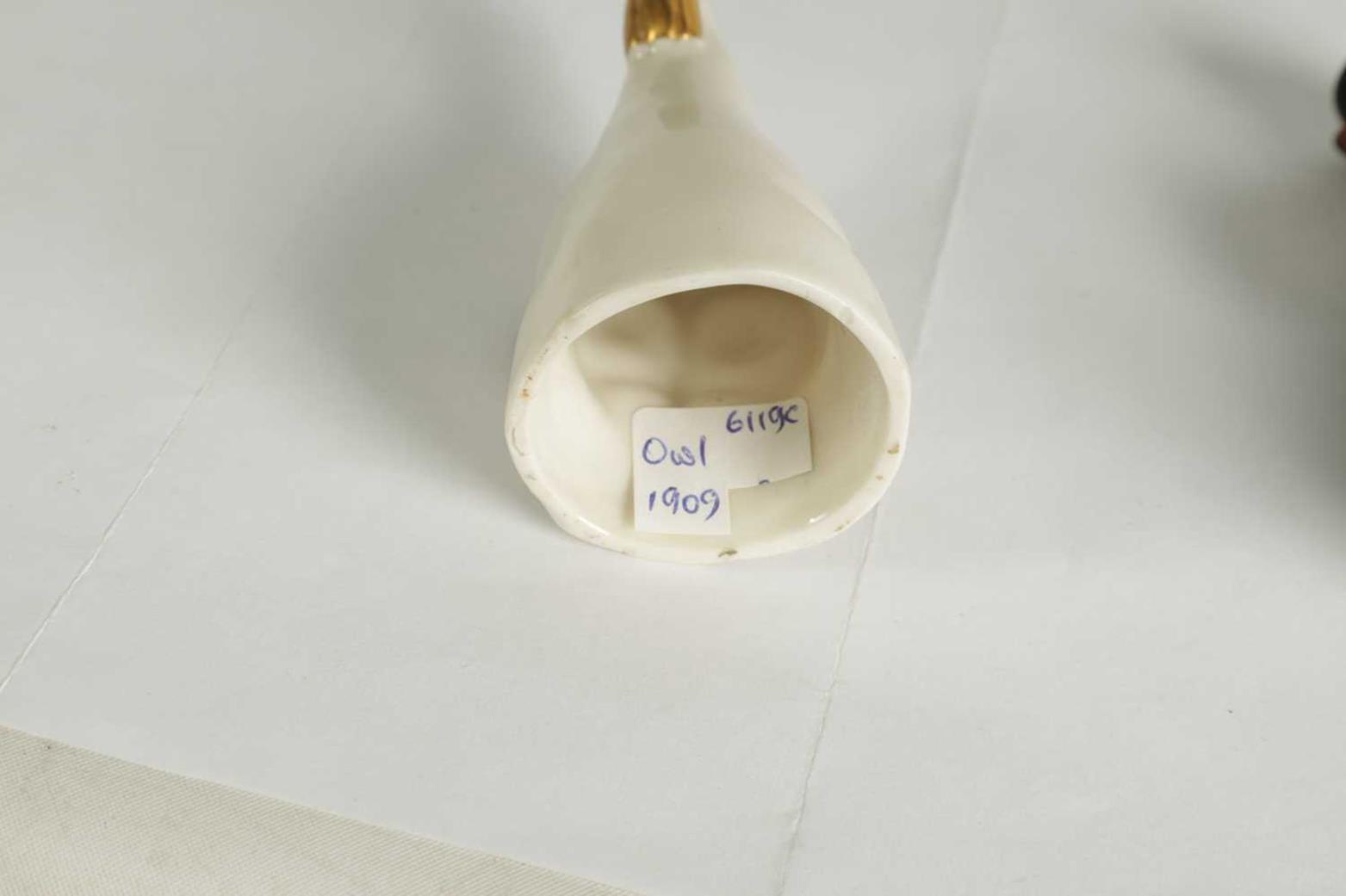 A COLLECTION OF ROYAL WORCESTER CANDLE EXTINGUISHERS circa 1880, 1909 and 1925 comprising of Dog in a Barrel, Owl, and Monsieur Reynard with green and puce marks to underside (3) - illustrated on pages 27, 39 and 63 of Distinguished Extinguishers by Tony Horsley (Tallest 10.2cm high )