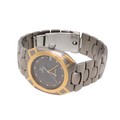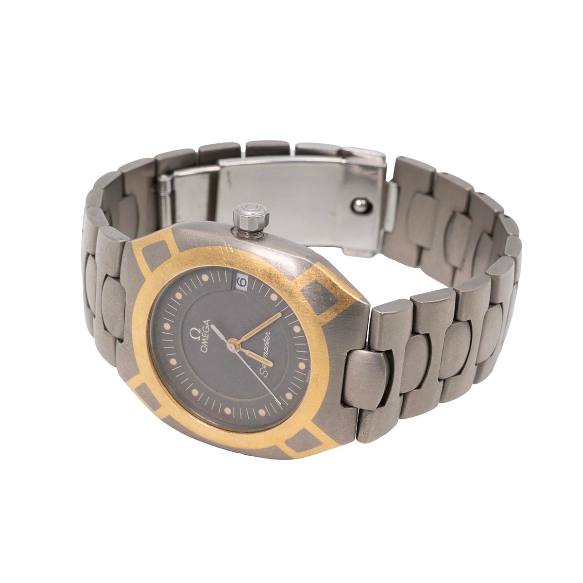 A Gents Omega Seamaster Polaris Titanium quartz movement wristwatch, circa 1980s, grey dial marked Omega with baton dot increments, gold hands and date aperture at three, with original bracelet strap, diameter of dial is 24mm, case size 31mm.
