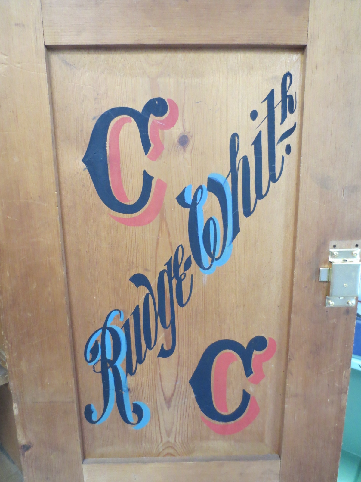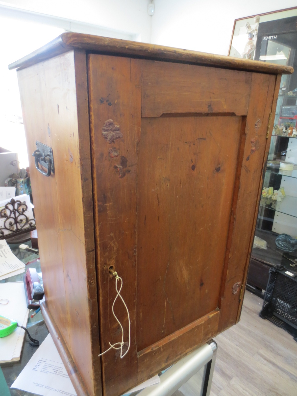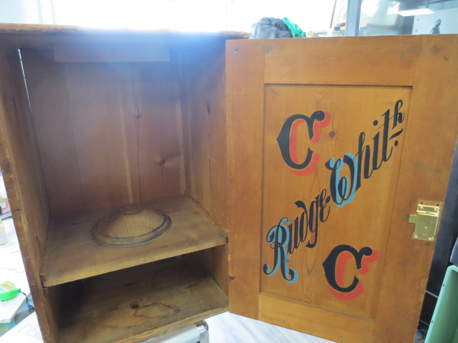 A pine trophy cabinet, the interior with a mount for a trophy and the inside of the door painted for Rudge Whitworth CC, good orverall order with some splitting to finish, measures approx 26" x 14" x 17"