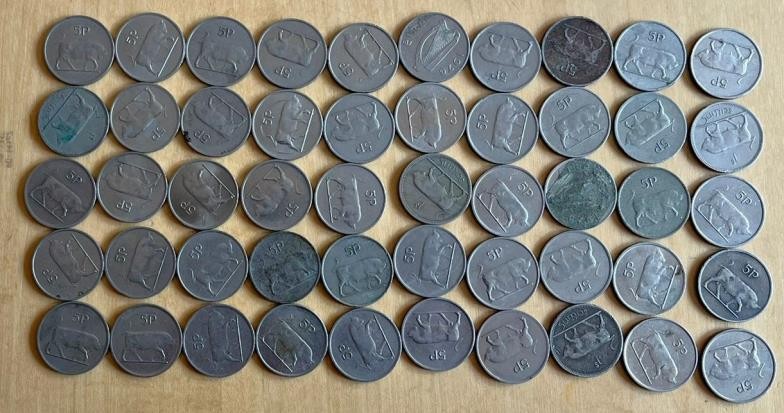 c.50 5p Decimal Irish Coins, c.1971-2000 with a bull at the front