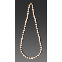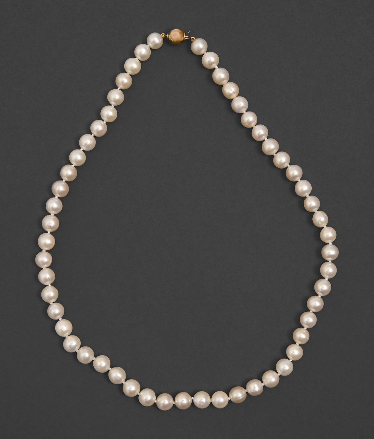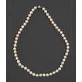 A cultured pearl necklace, of approx 7mm cultured pearls, with gold ball clasp, 44cm l, marked on clasp 375, 34g