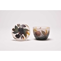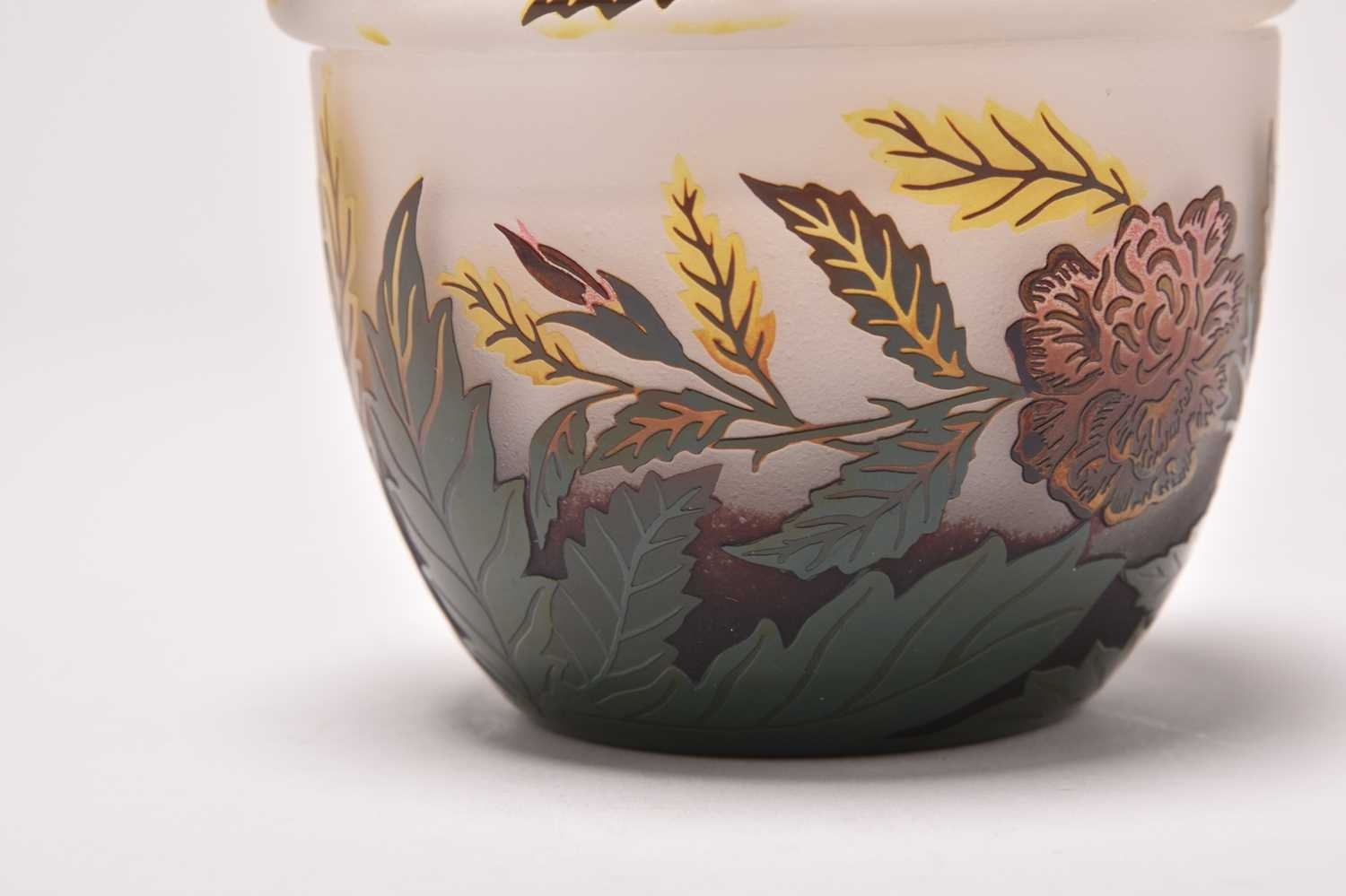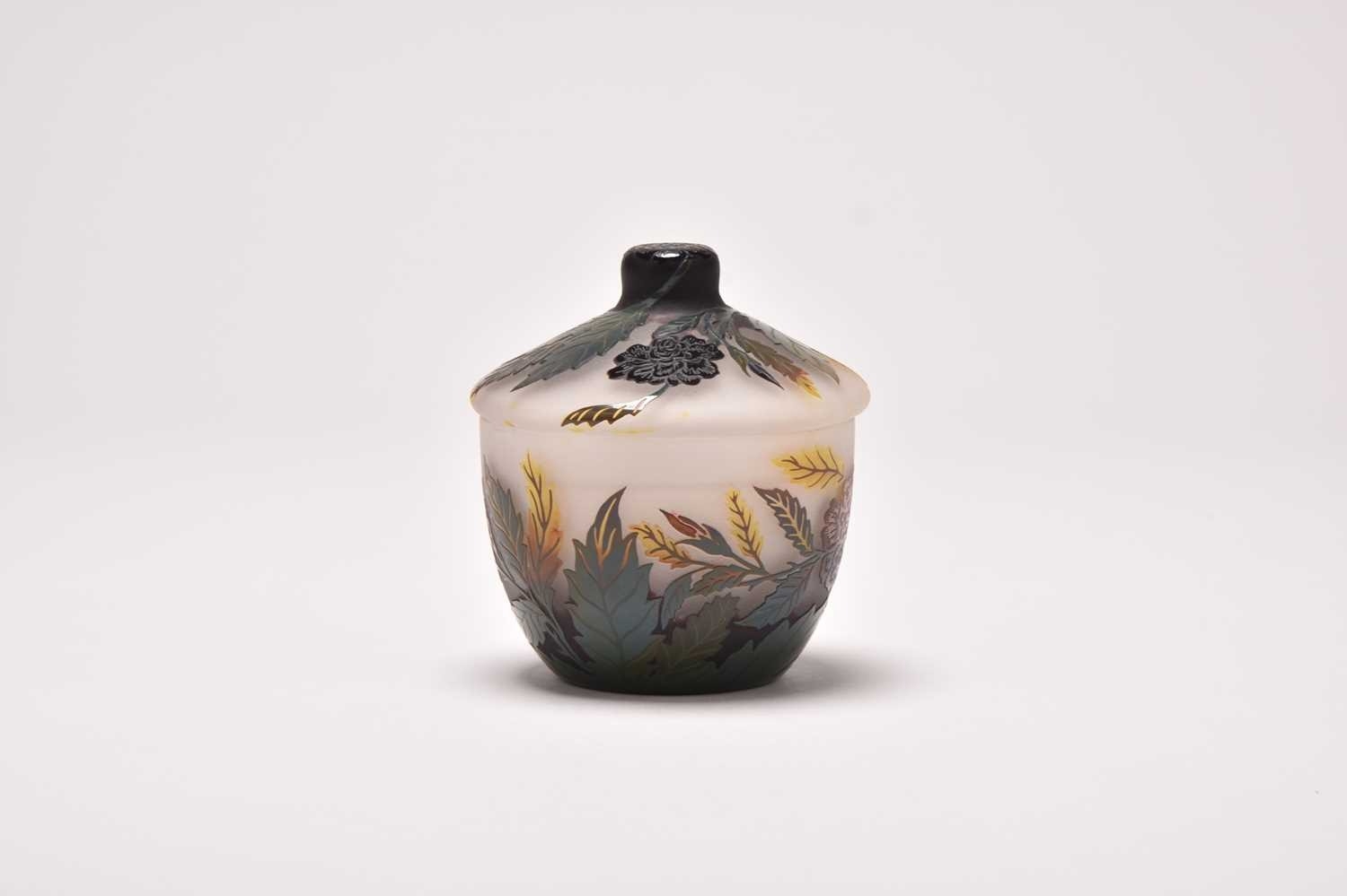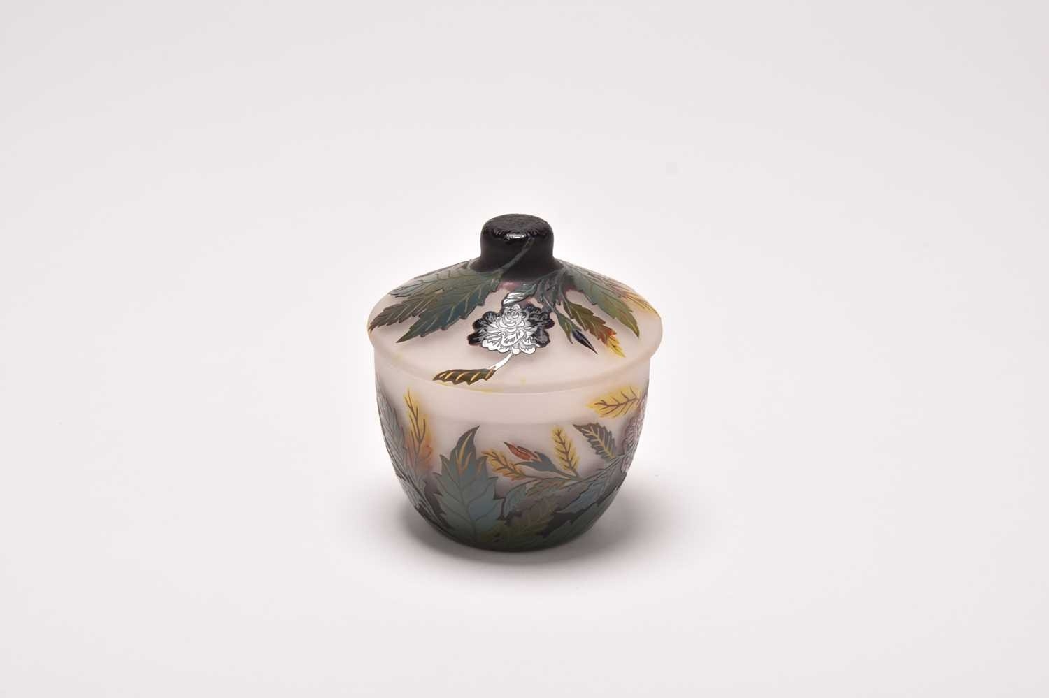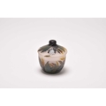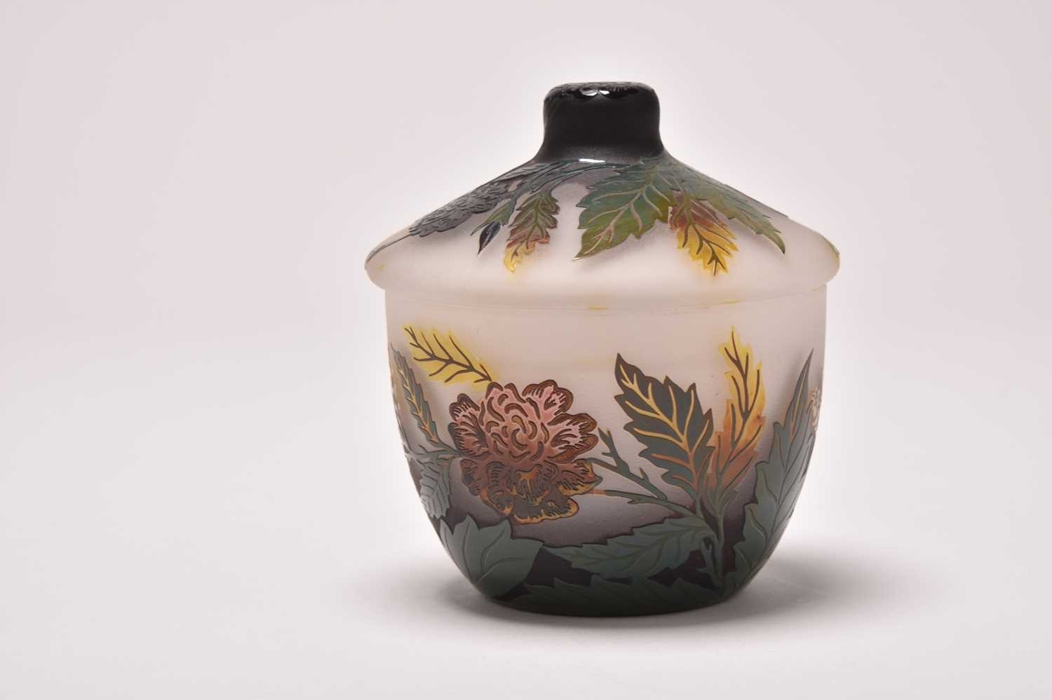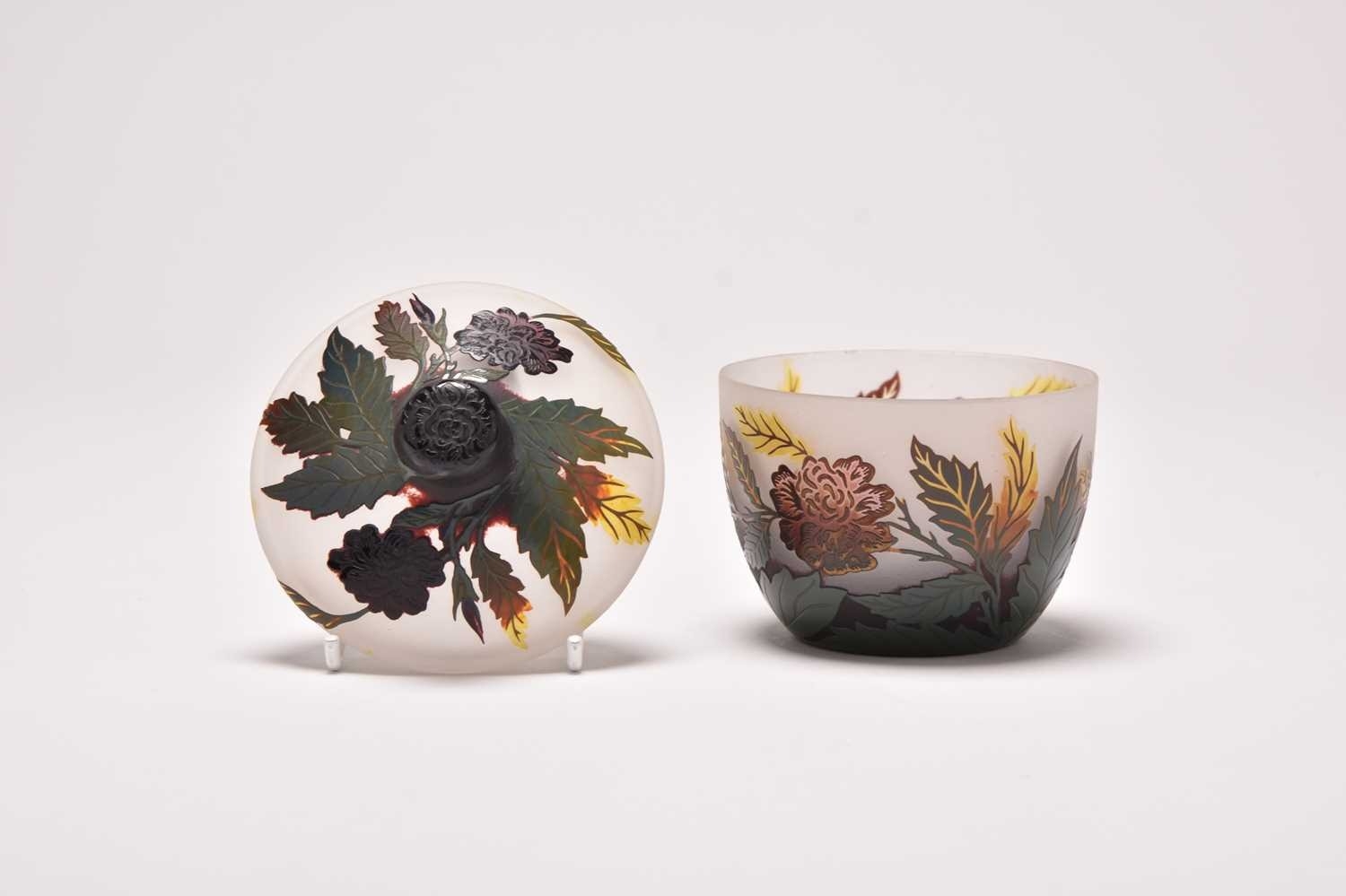 A contemporary Ryszard Ramski cameo glass bowl and cover, cased in purple and brown over mottled clear ground, decorated with flowers and foliage, signed Ramski to the base, 11cm high Condition:Good condition with no damages or repairs.