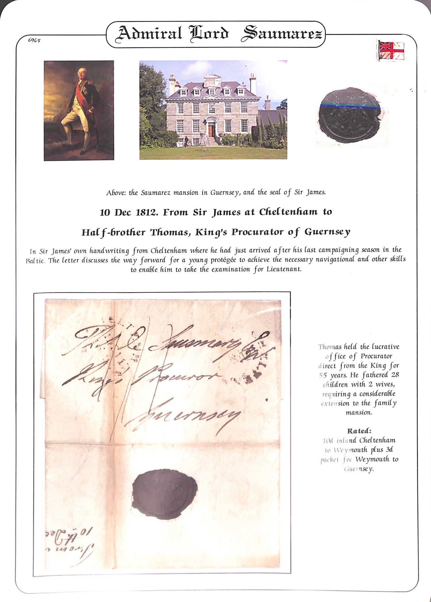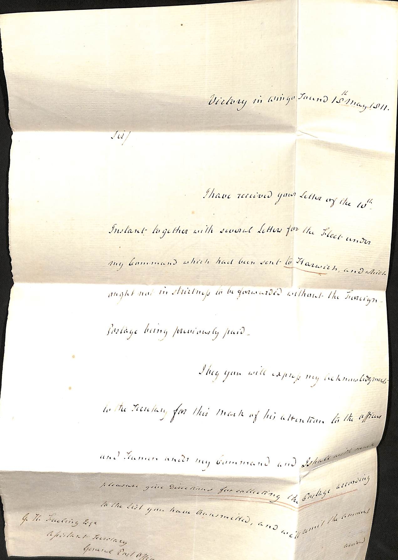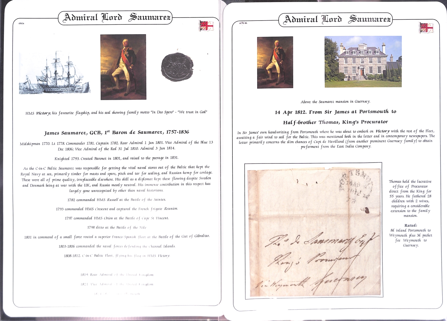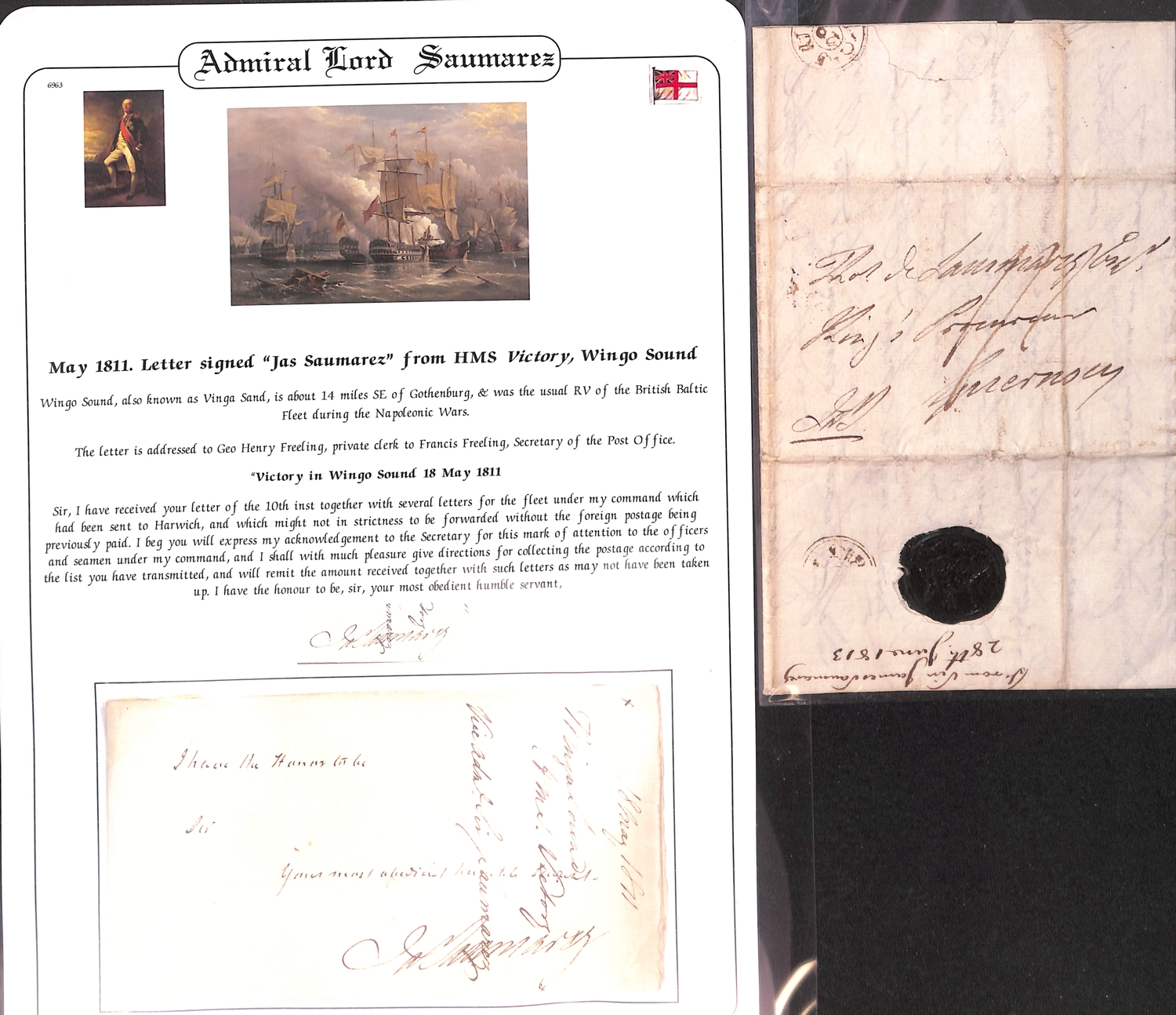 Admiral Lord Saumarez. 1811 (May 15) Letter from "Victory in Wingo Sound" to G.H Freeling at the G.P.O thanking him for sending letters for the fleet to Harwich and promising to collect the postage according to the list transmitted; and three 1812-13 letters posted from Portsmouth, Cheltenham or London all to Thomas de Saumarez in Guernsey written entirely in Saumarez hand, the first just prior to embarking on "Victory" to sail to the Baltic. Baron James de Saumarez distinguished career including captaincy of H.M.S "Orion" at the Battles of St. Vincent (1797) and the Nile (1798); he commanded the Baltic Squadron 1808-13. (4).