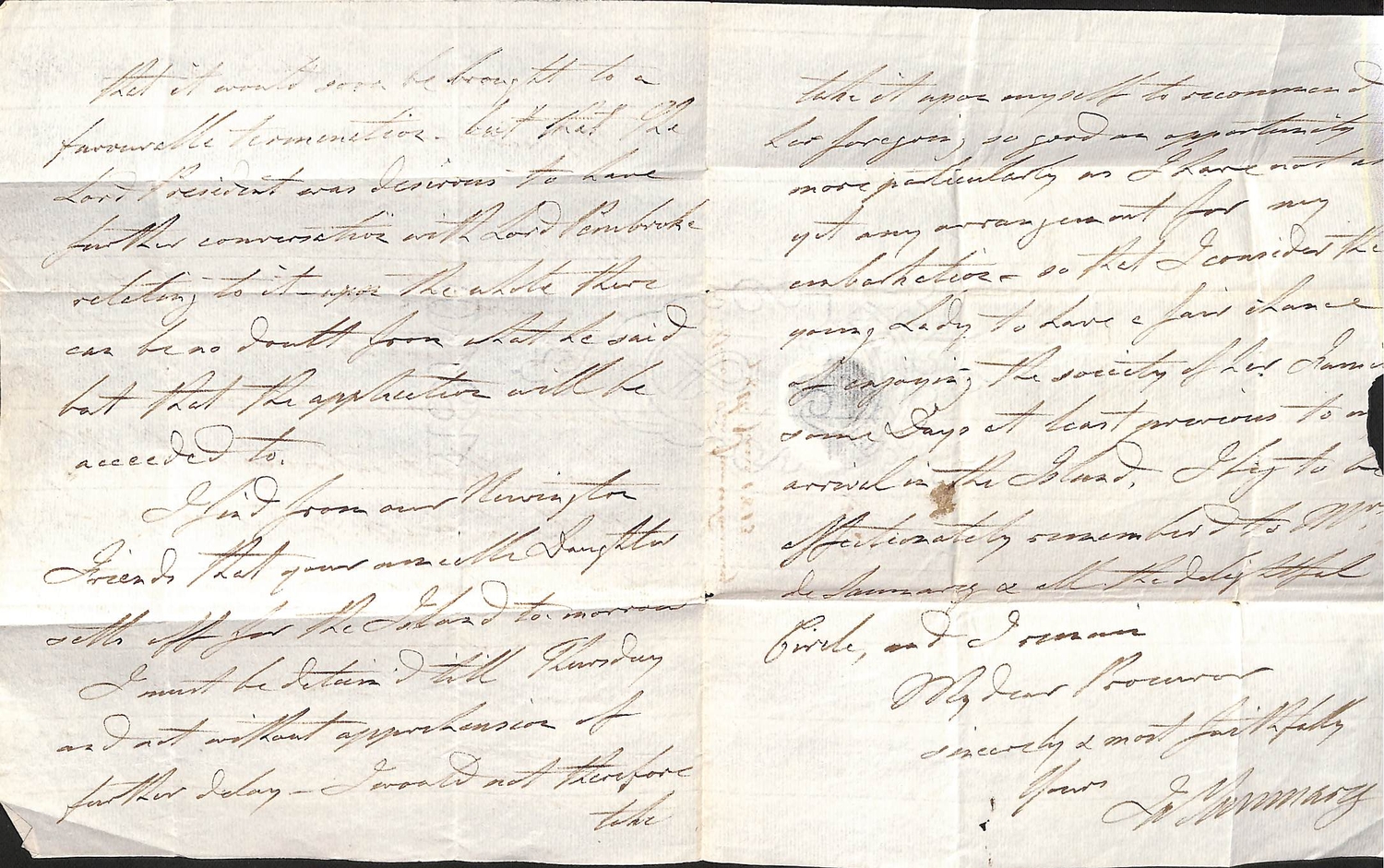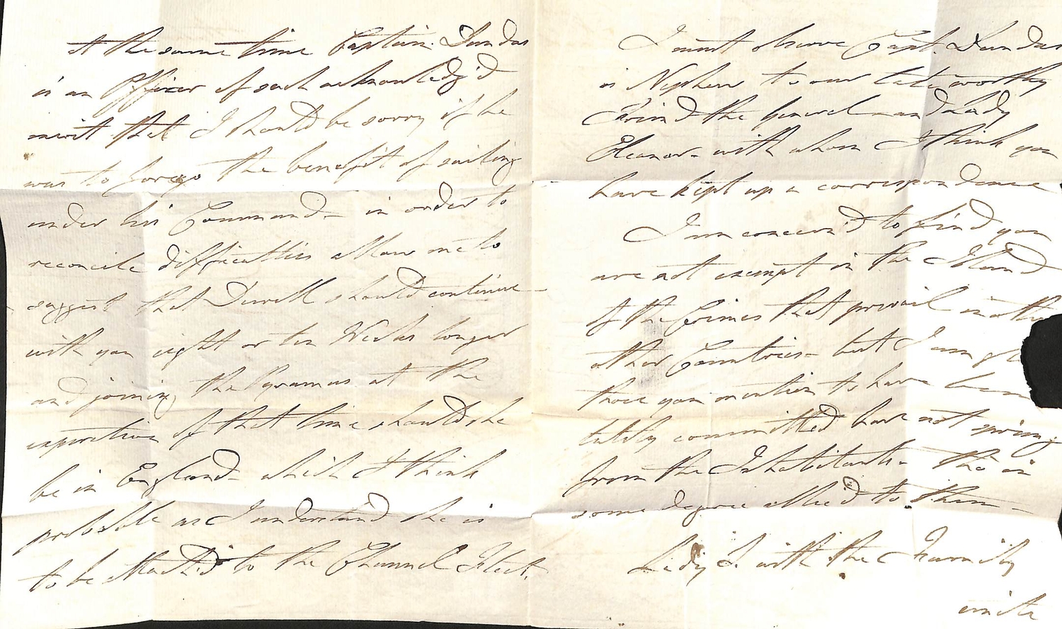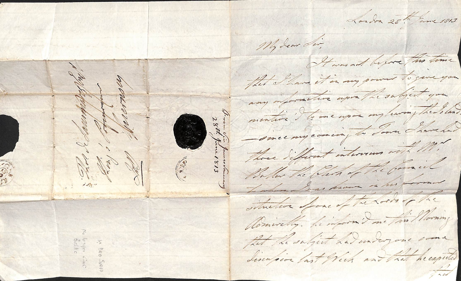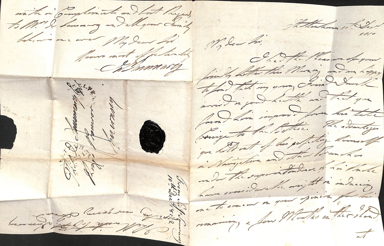 Admiral Lord Saumarez. 1811 (May 15) Letter from "Victory in Wingo Sound" to G.H Freeling at the G.P.O thanking him for sending letters for the fleet to Harwich and promising to collect the postage according to the list transmitted; and three 1812-13 letters posted from Portsmouth, Cheltenham or London all to Thomas de Saumarez in Guernsey written entirely in Saumarez hand, the first just prior to embarking on "Victory" to sail to the Baltic. Baron James de Saumarez distinguished career including captaincy of H.M.S "Orion" at the Battles of St. Vincent (1797) and the Nile (1798); he commanded the Baltic Squadron 1808-13. (4).