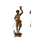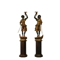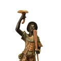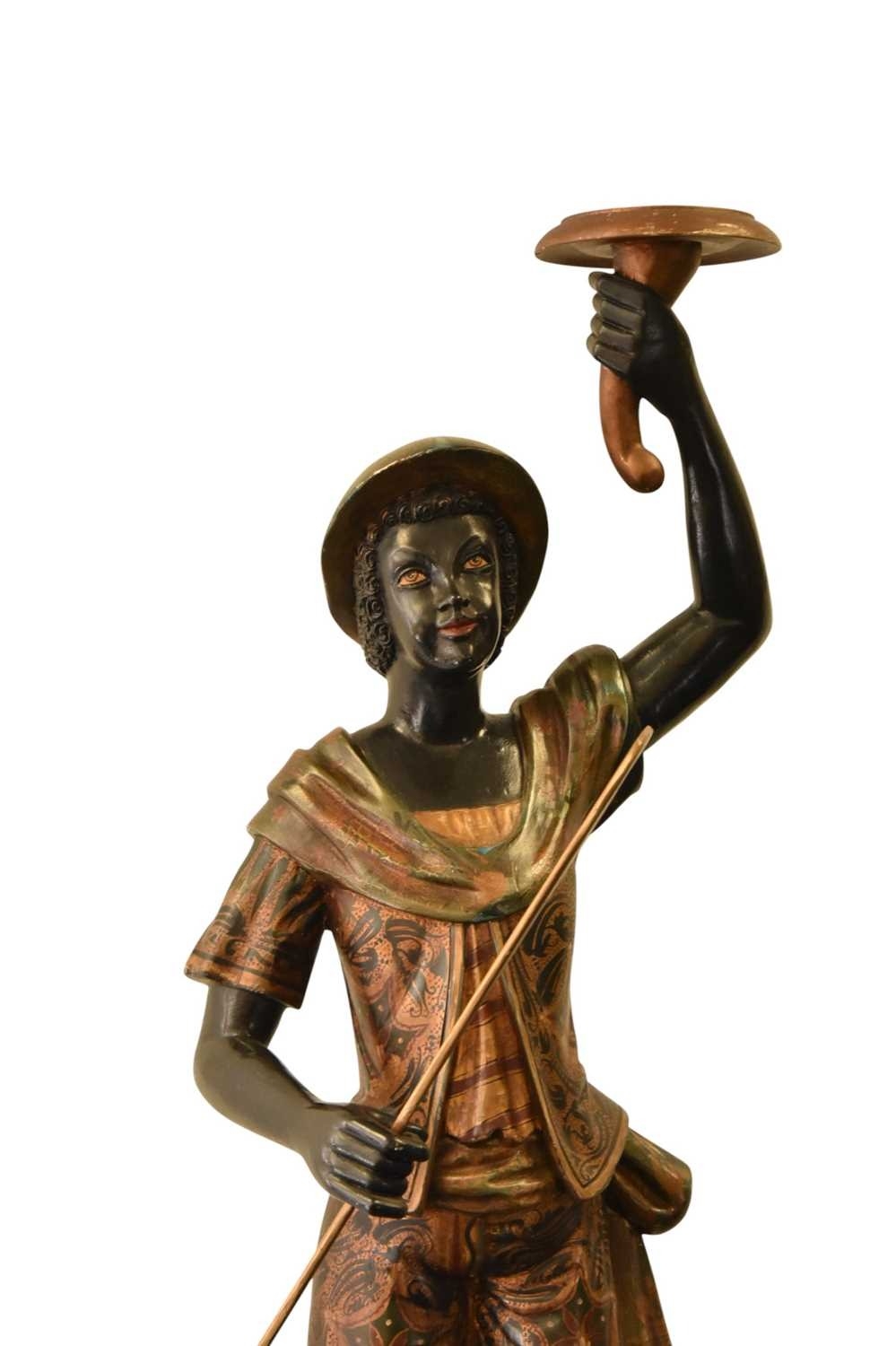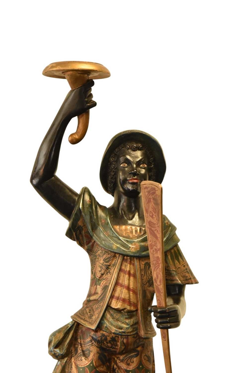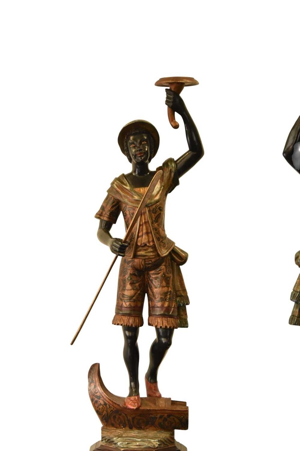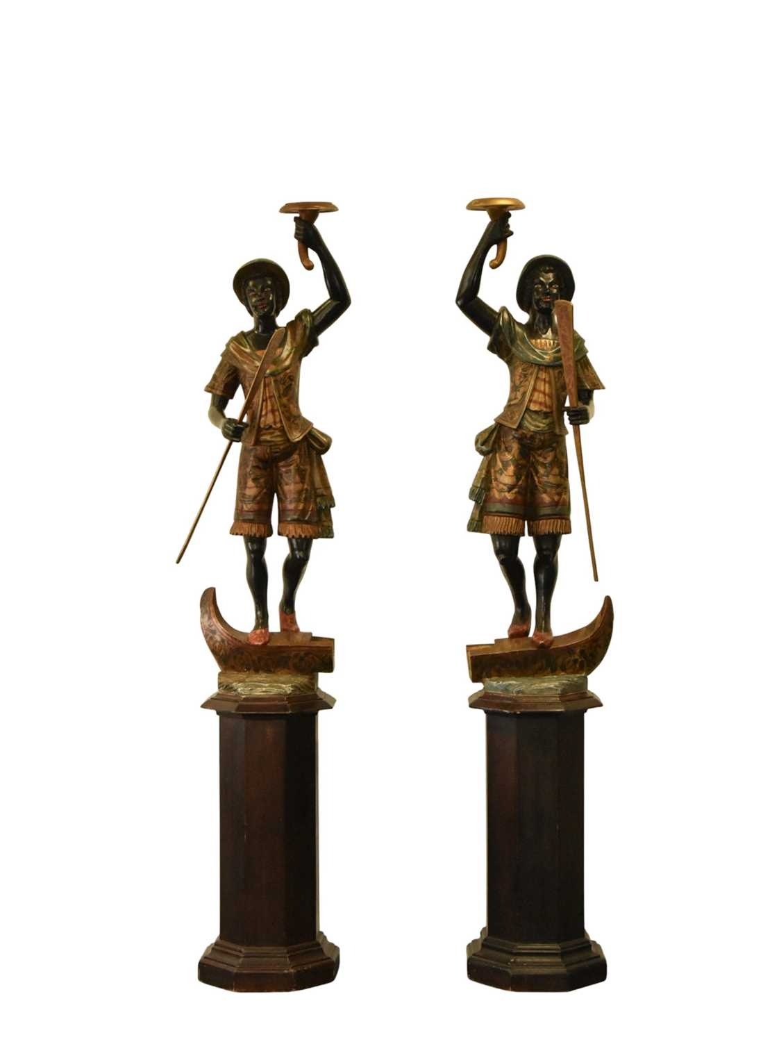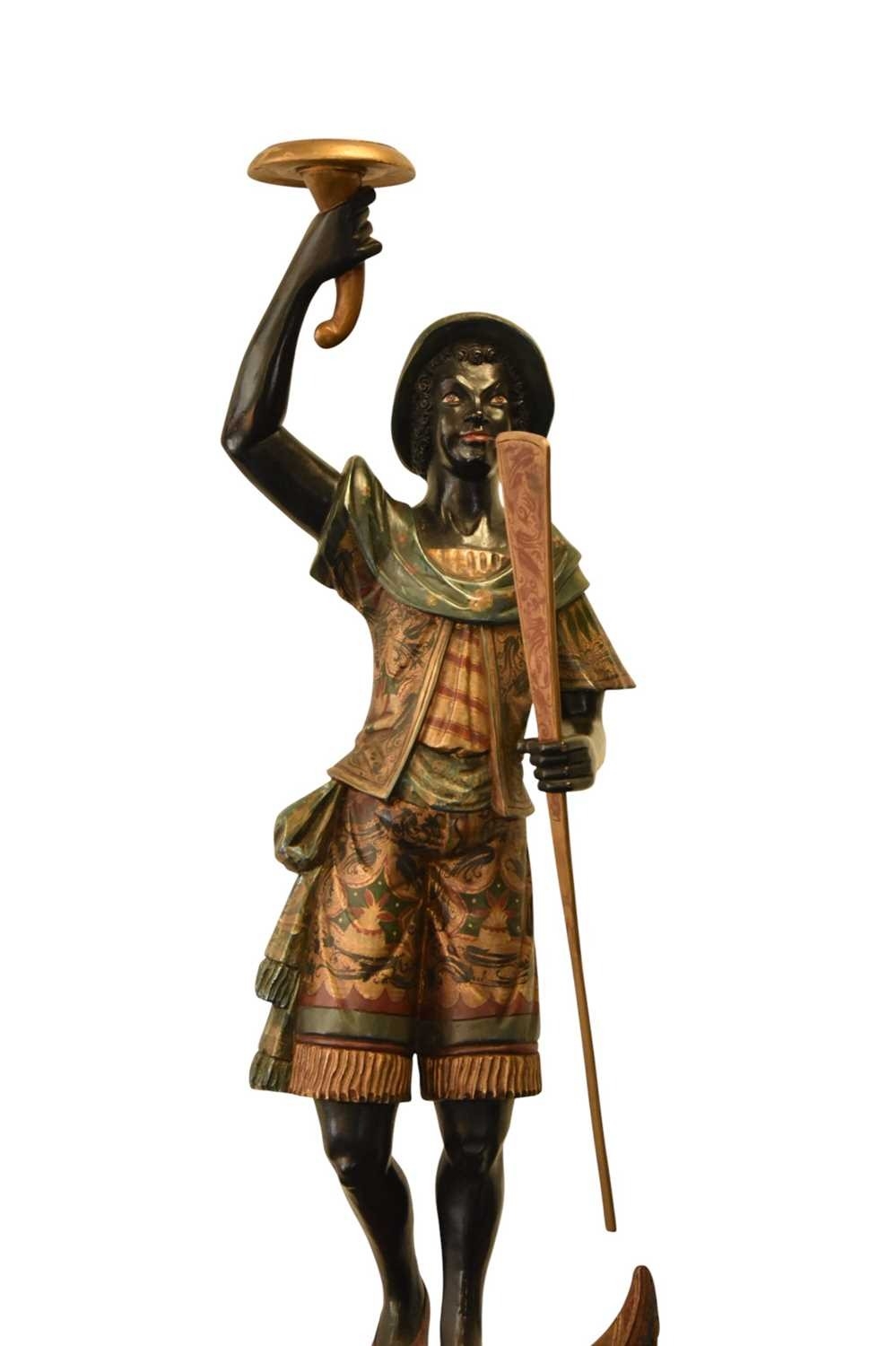 A pair of reproduction painted wood blackamoor figural torchere Each modelled standing atop gondola and holding a cornucopia aloft in one hand and a paddle in the other, wearing brightly patterned robes, raised on integral octagonal pedestal bases. 200cm high (2)