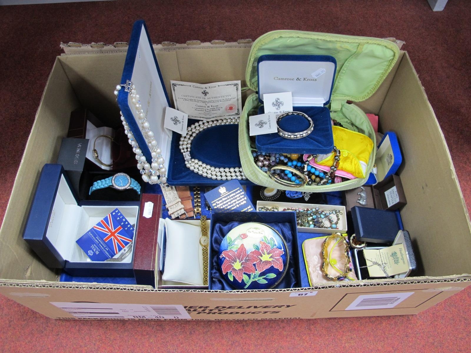 A Mixed Lot of Assorted Costume Jewellery, including Camrose & Kross Jacqueline Kennedy reproduction imitation pearl necklace, bangle, assorted bracelets, brooches, Old Tupton Ware trinket box, heart pendants, ladies wristwatches etc.