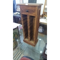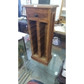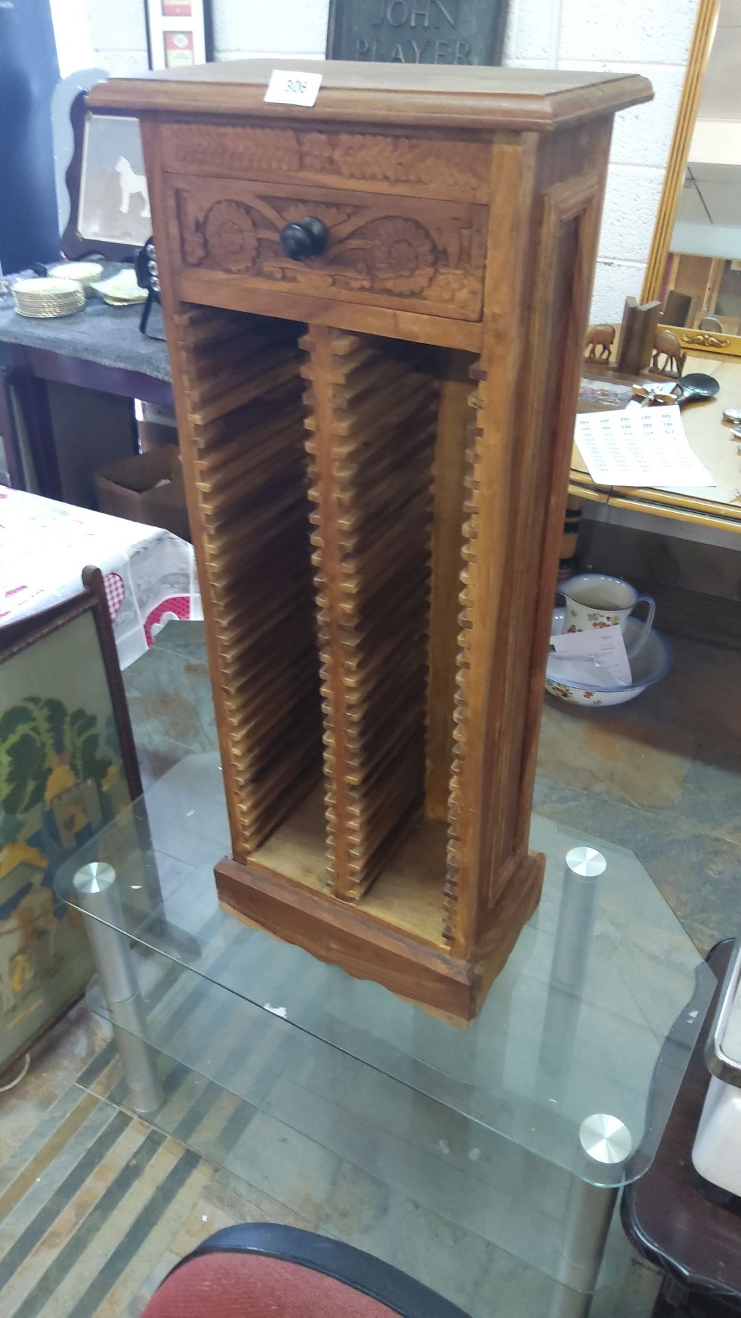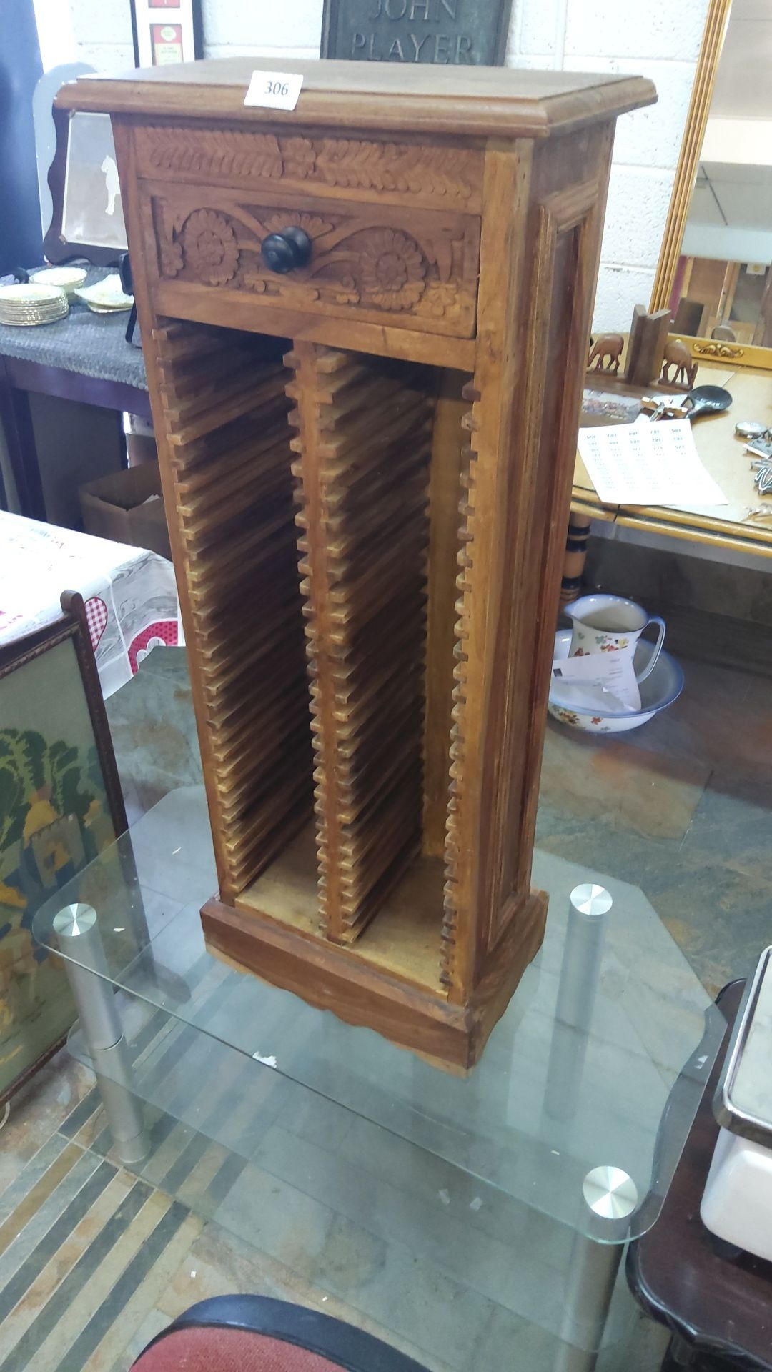 Carved wooden CD rack with single decorative drawer, featuring intricate floral motifs. Made from warm-toned wood.