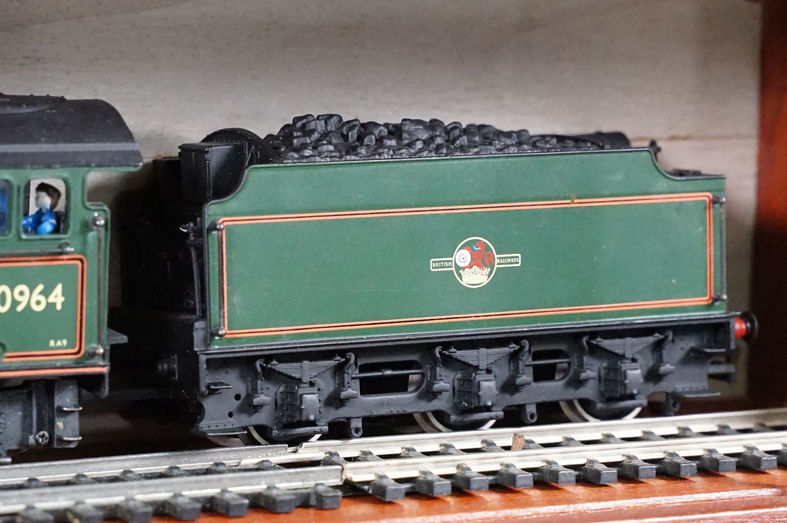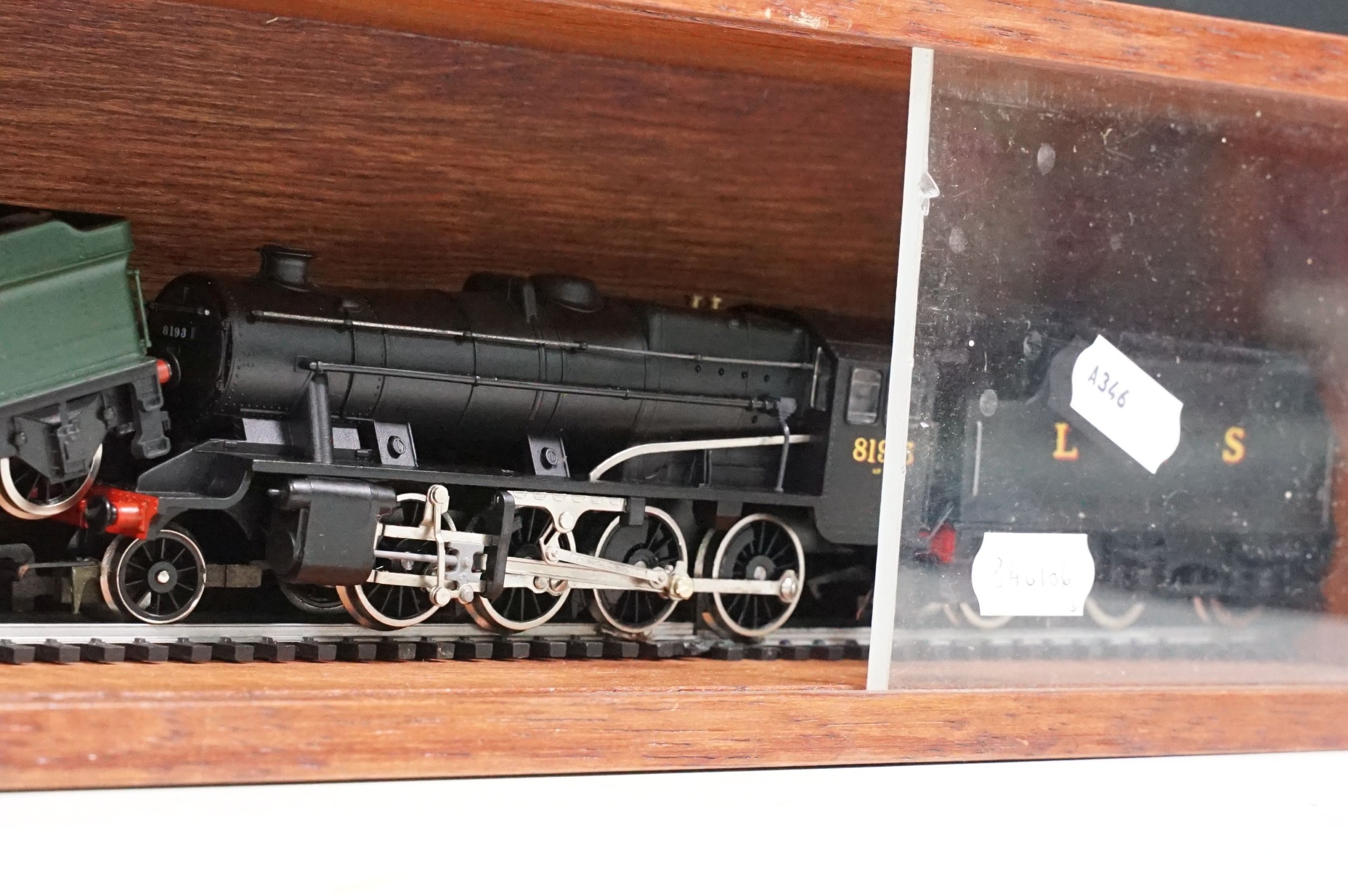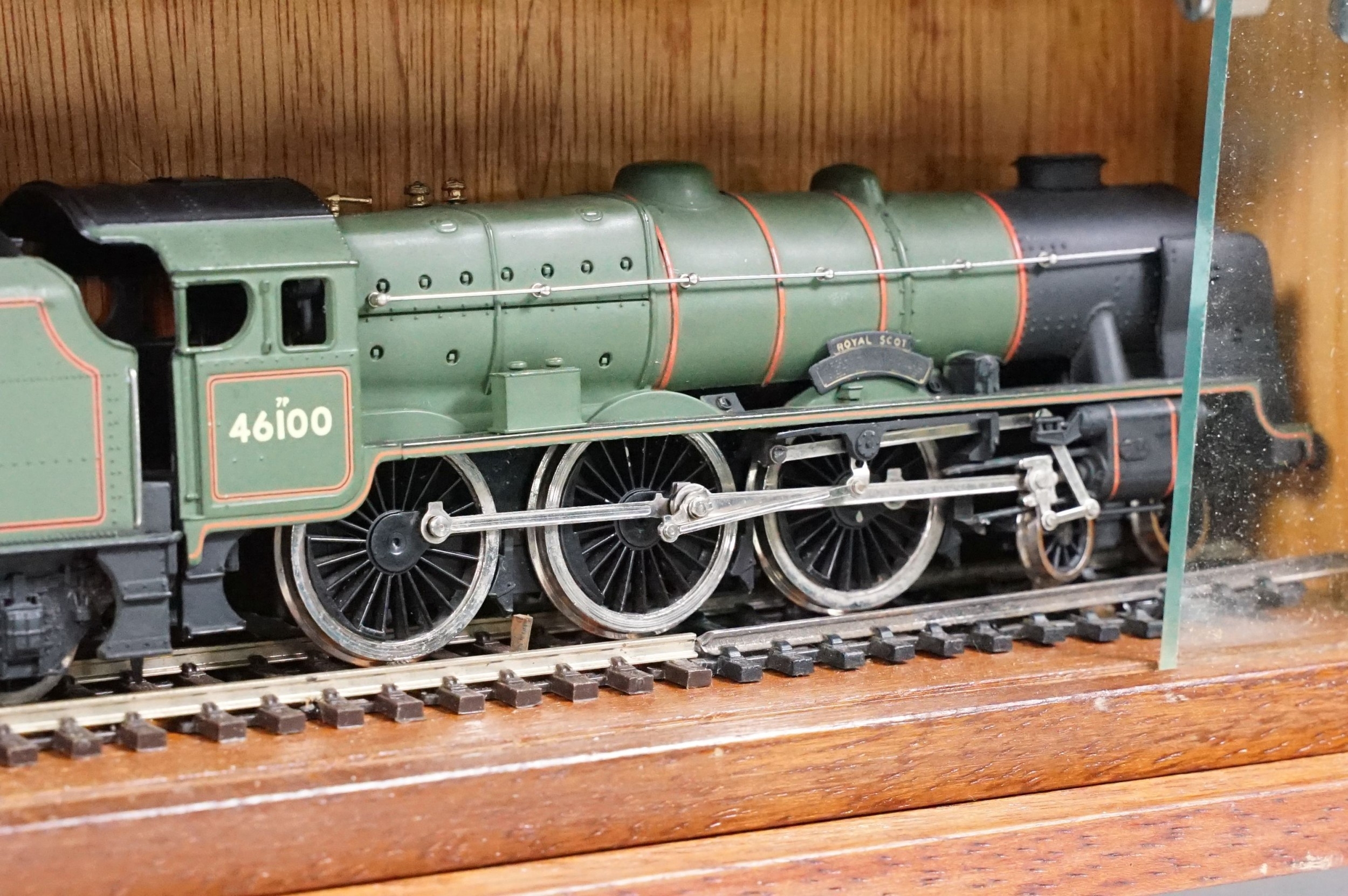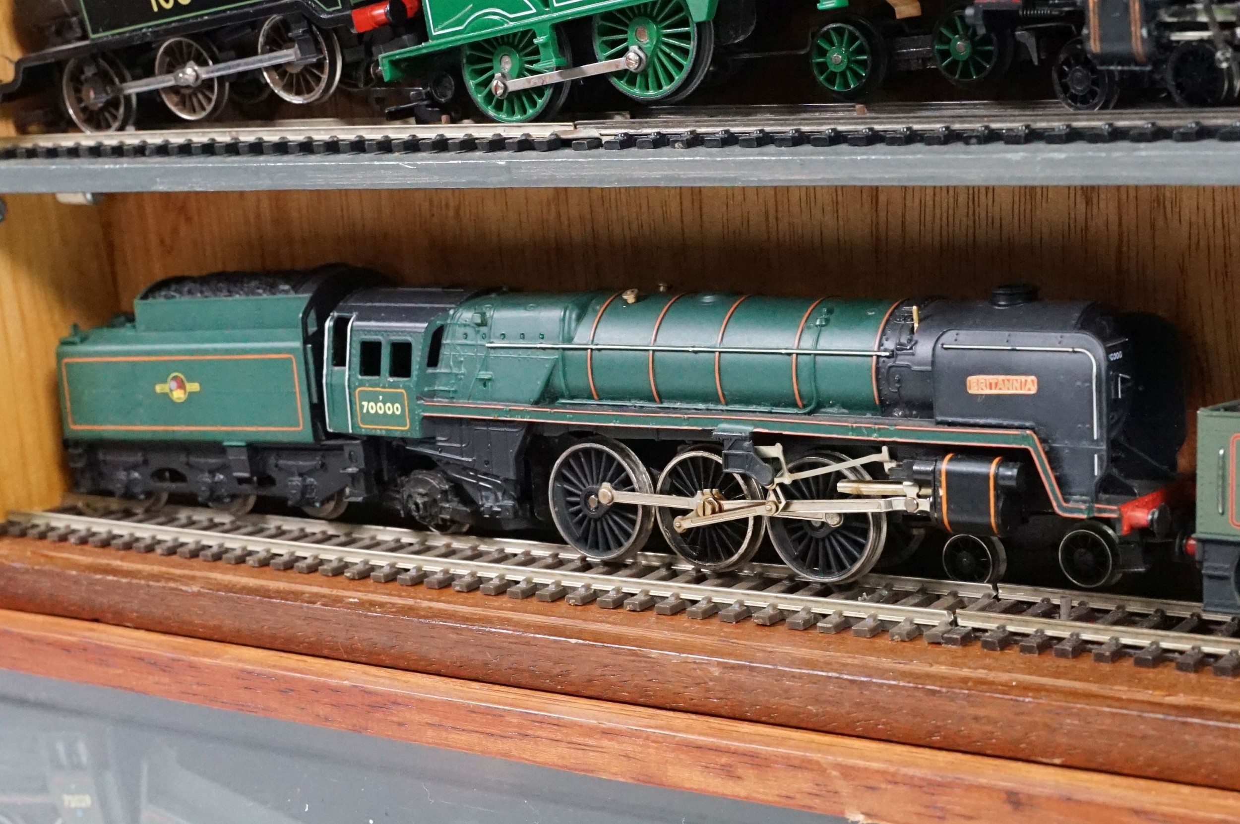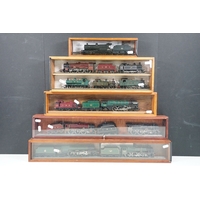 12 OO gauge locomotives to include Bachmann 75029 4-6-0, Bachmann The Durham Light Infantry, Hornby British Railways 4, Mainline Royal Scot, kit built Blue Peter (couple of loose parts), Mainline GWR 3205 0-6-0 etc, contained within 3 x display cases