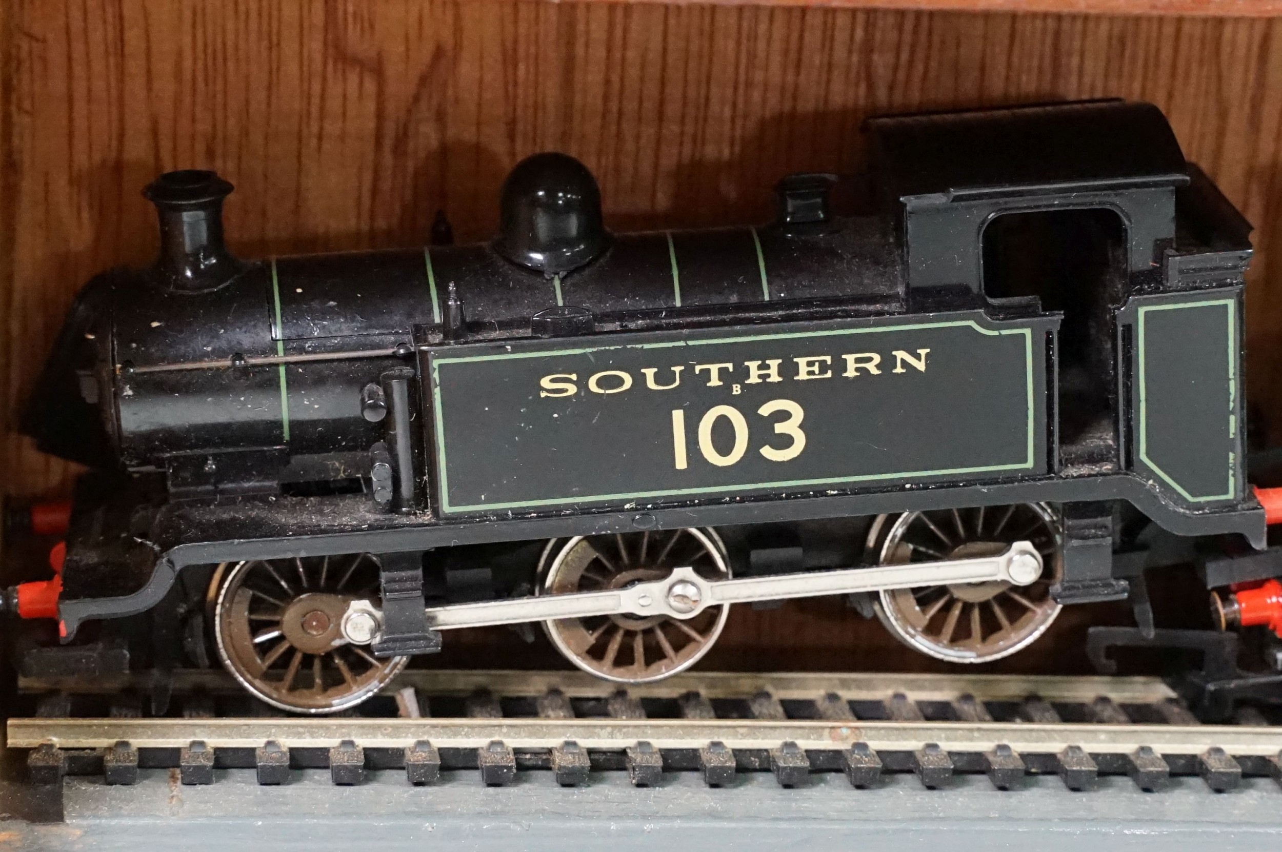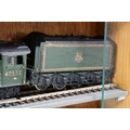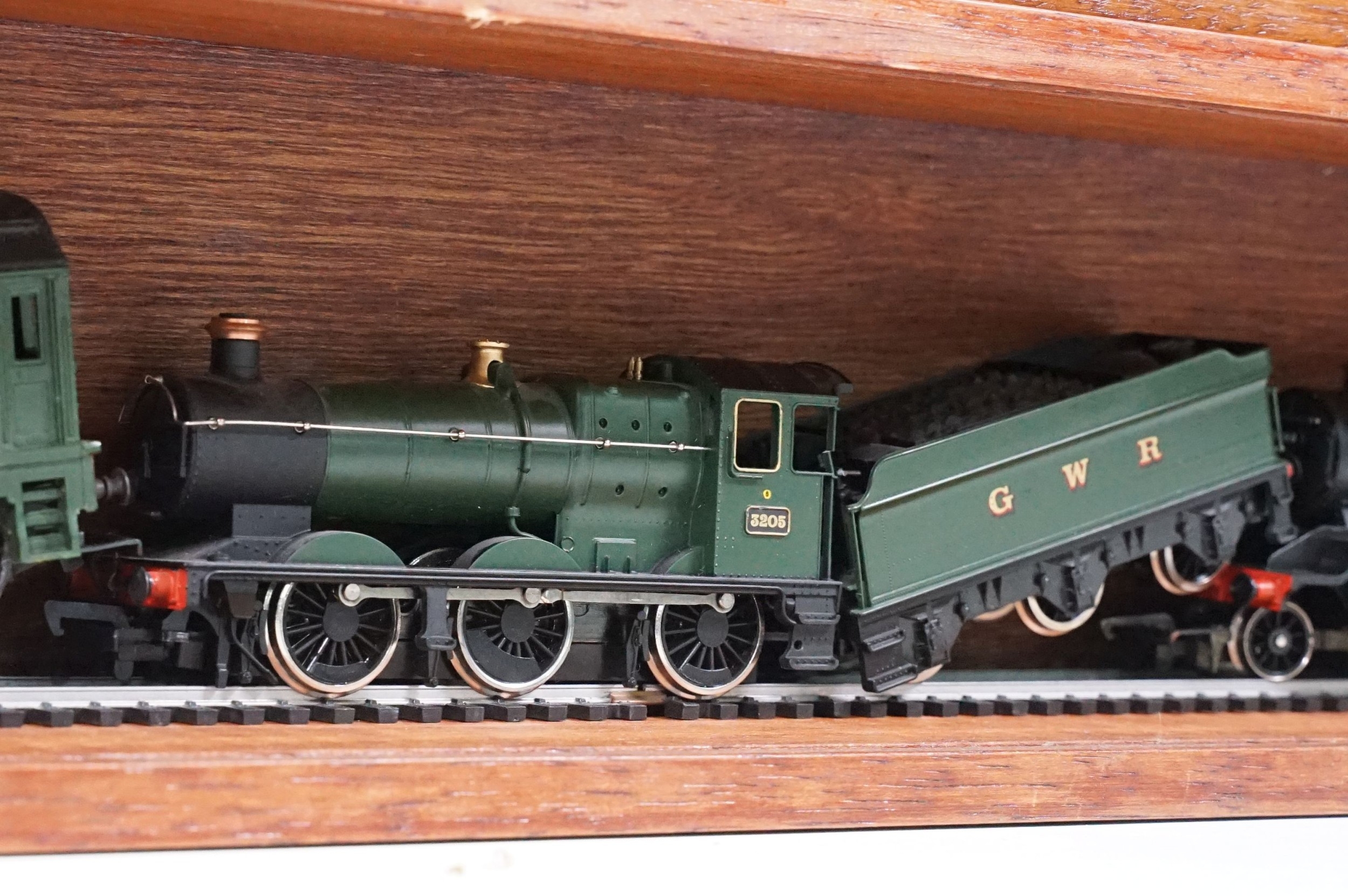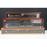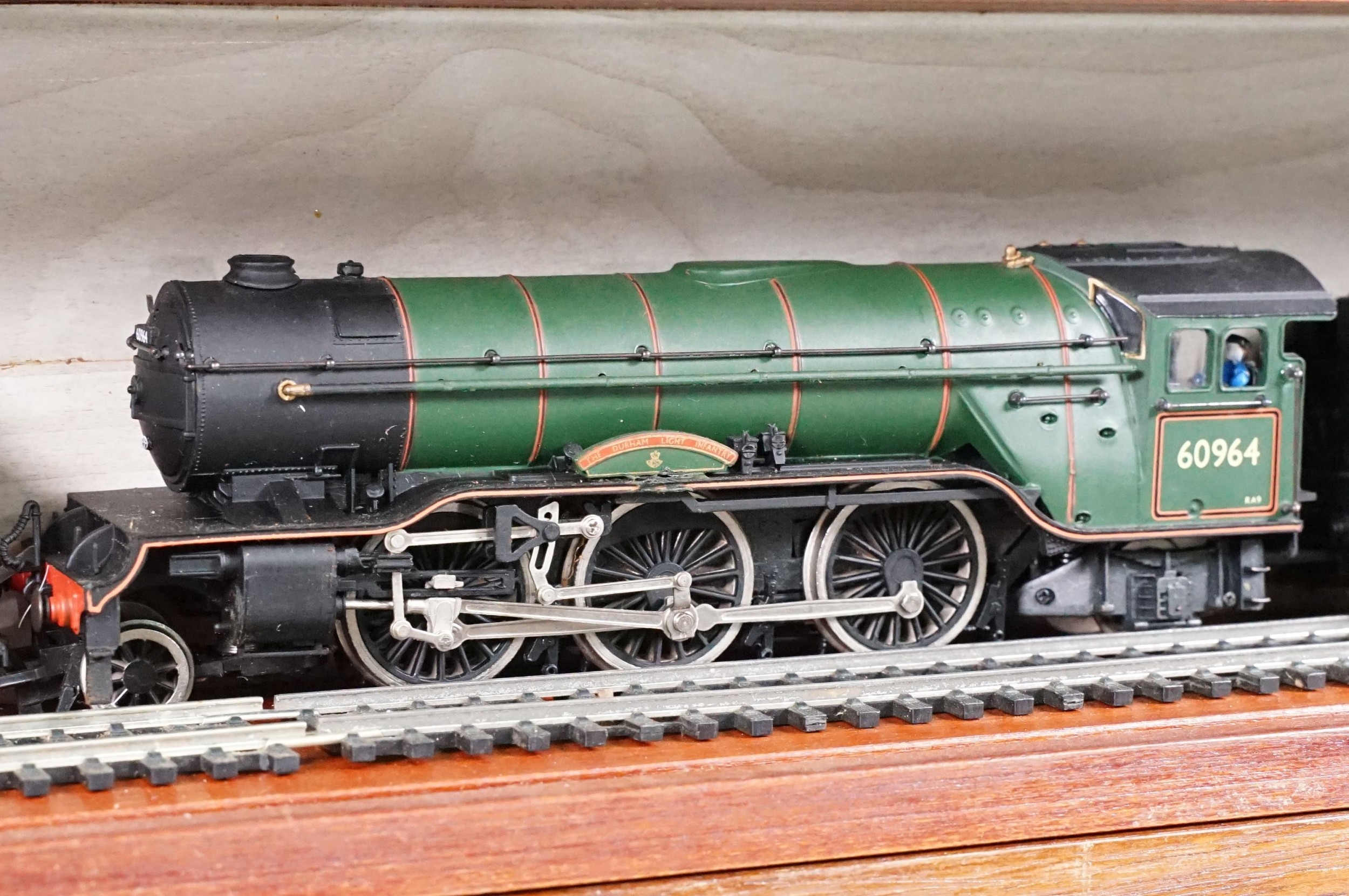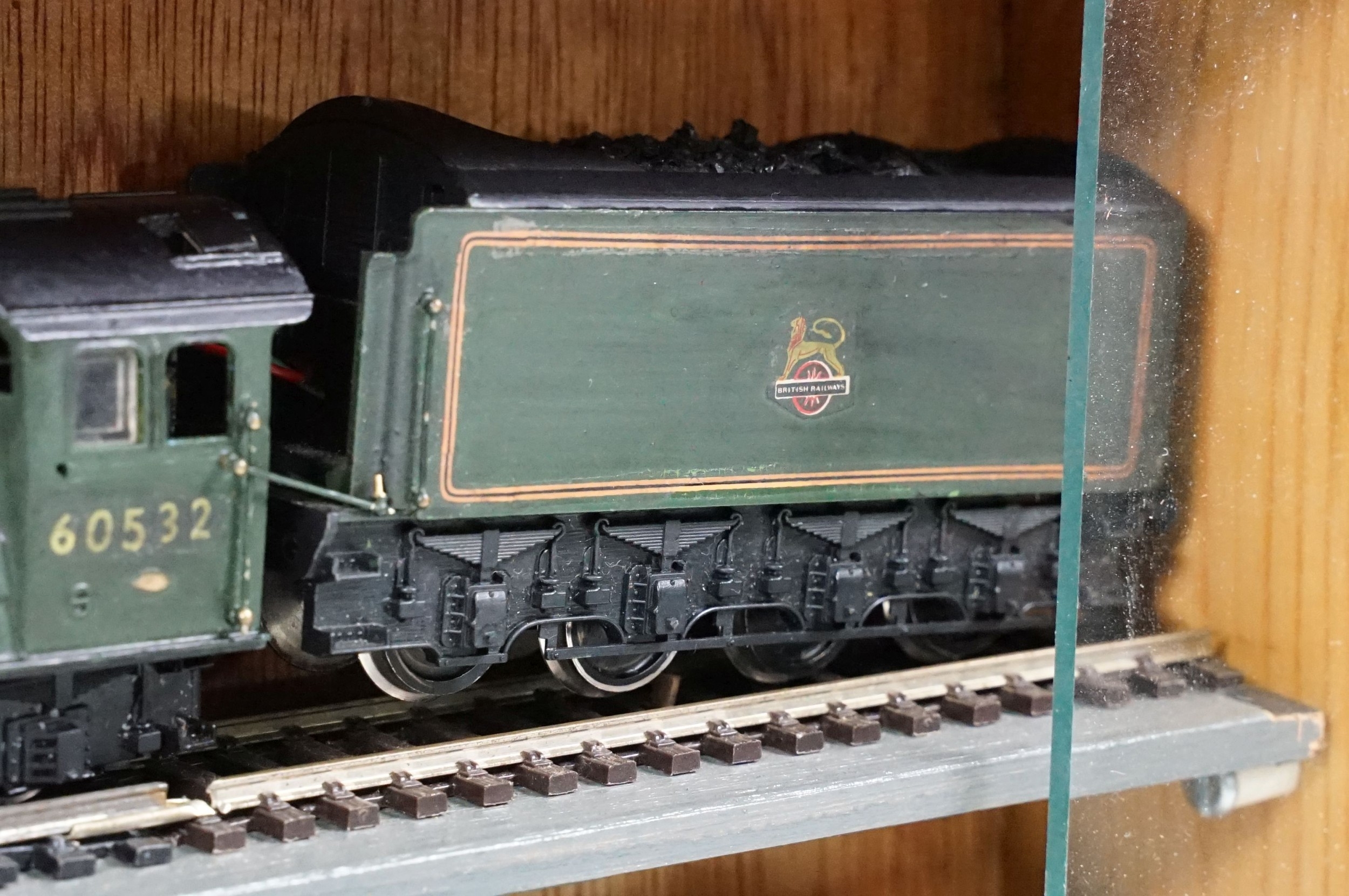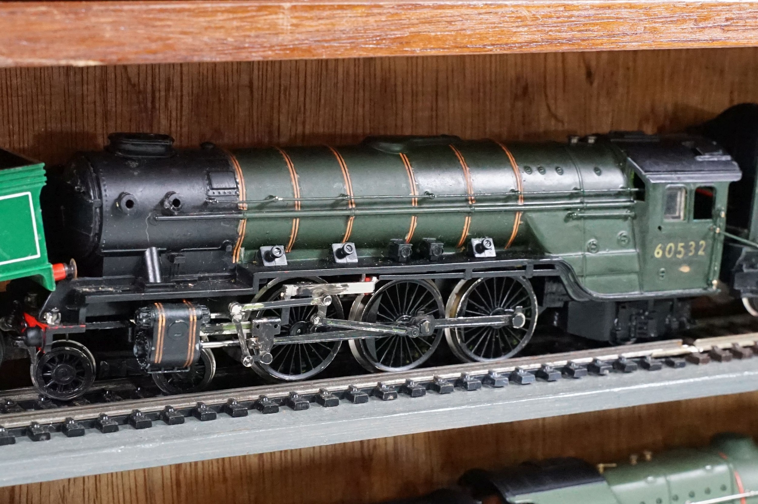 12 OO gauge locomotives to include Bachmann 75029 4-6-0, Bachmann The Durham Light Infantry, Hornby British Railways 4, Mainline Royal Scot, kit built Blue Peter (couple of loose parts), Mainline GWR 3205 0-6-0 etc, contained within 3 x display cases