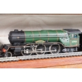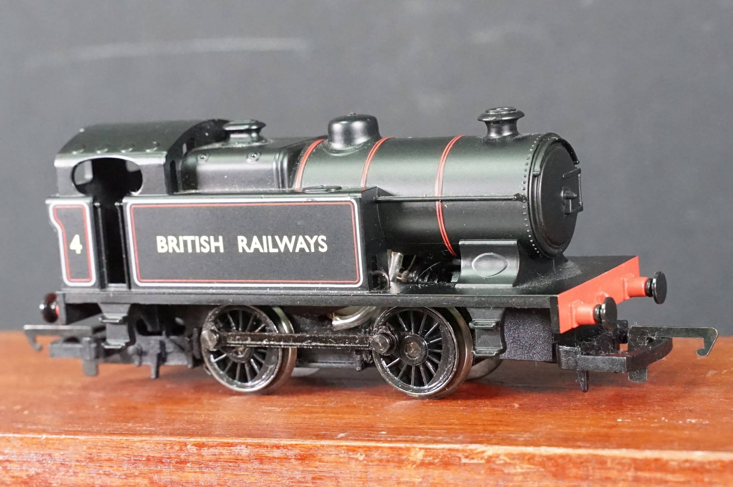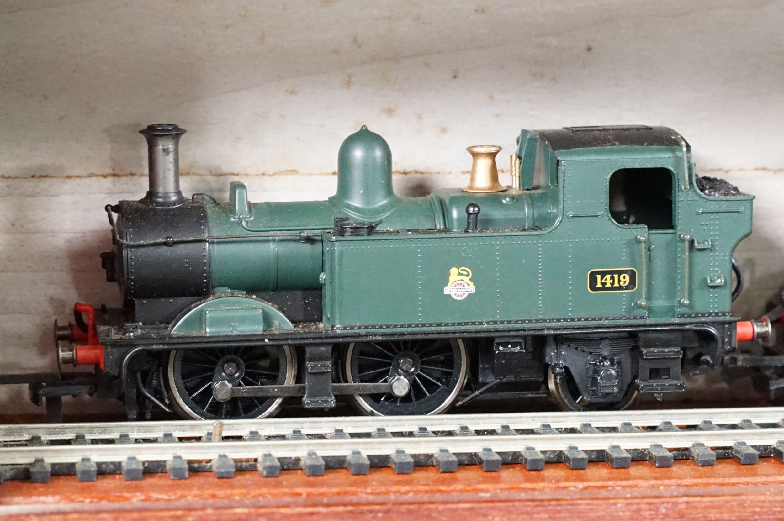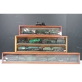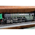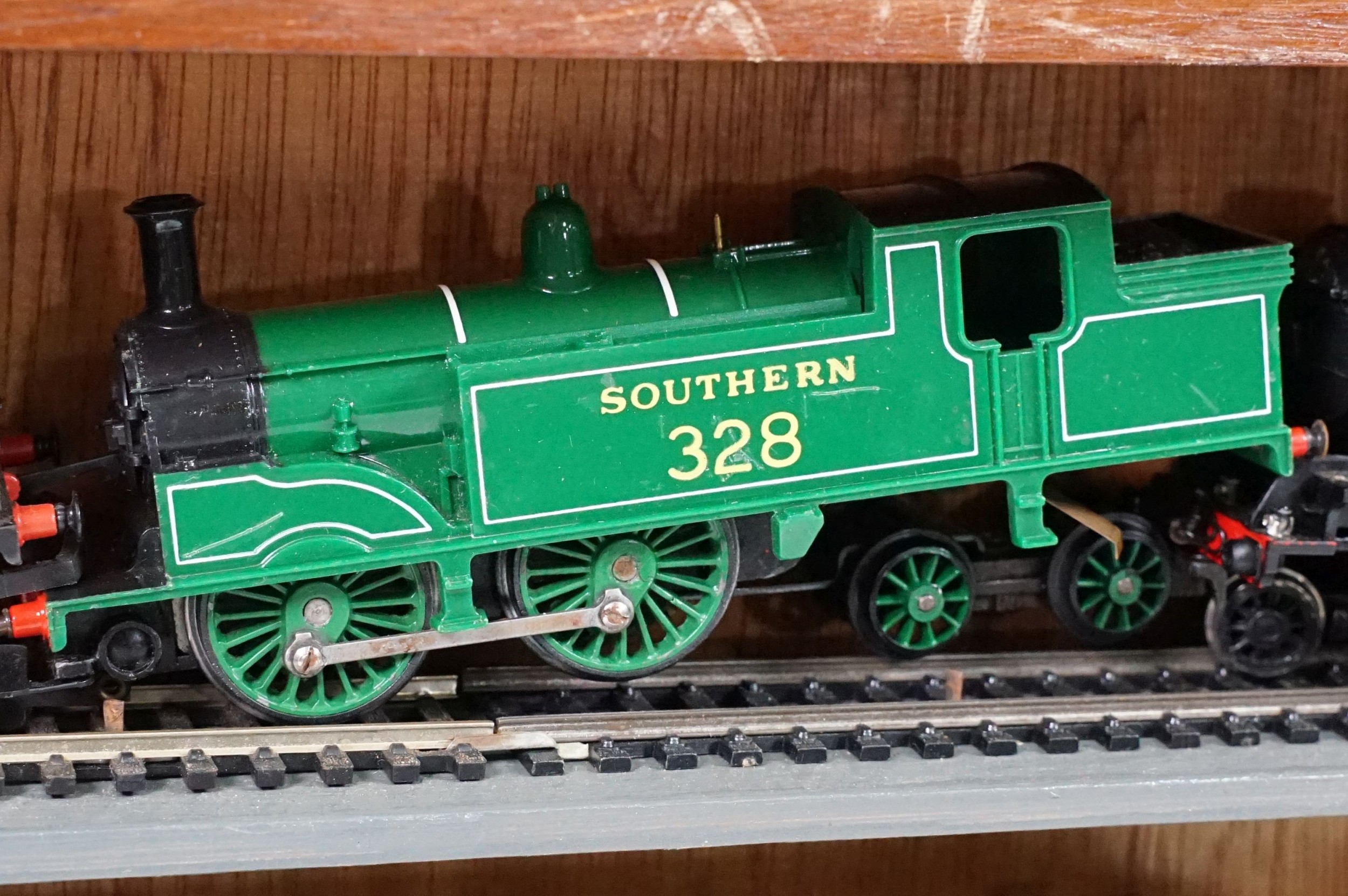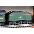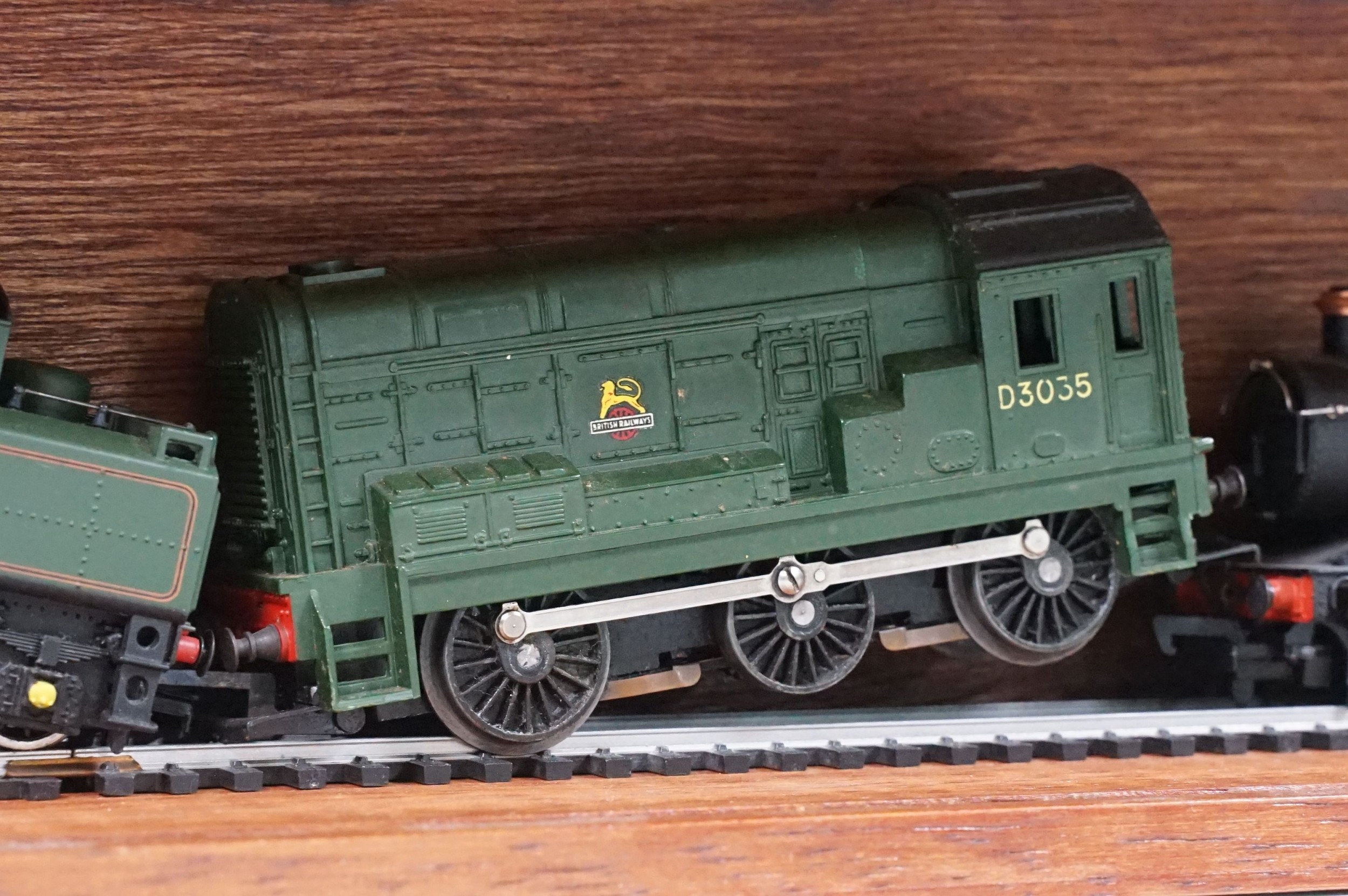 12 OO gauge locomotives to include Bachmann 75029 4-6-0, Bachmann The Durham Light Infantry, Hornby British Railways 4, Mainline Royal Scot, kit built Blue Peter (couple of loose parts), Mainline GWR 3205 0-6-0 etc, contained within 3 x display cases