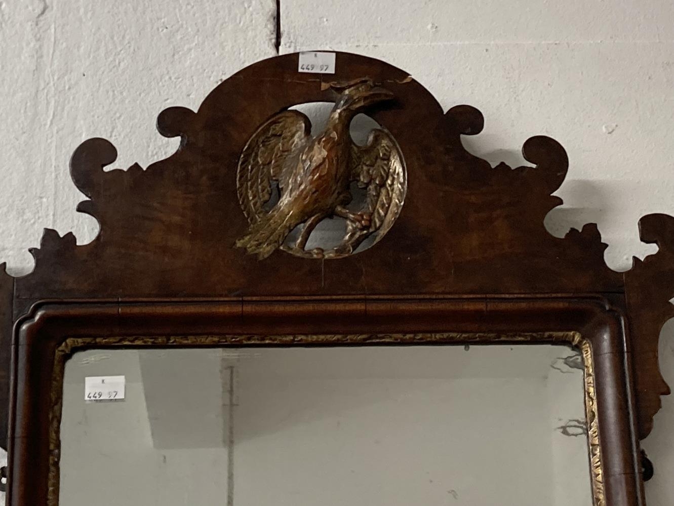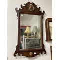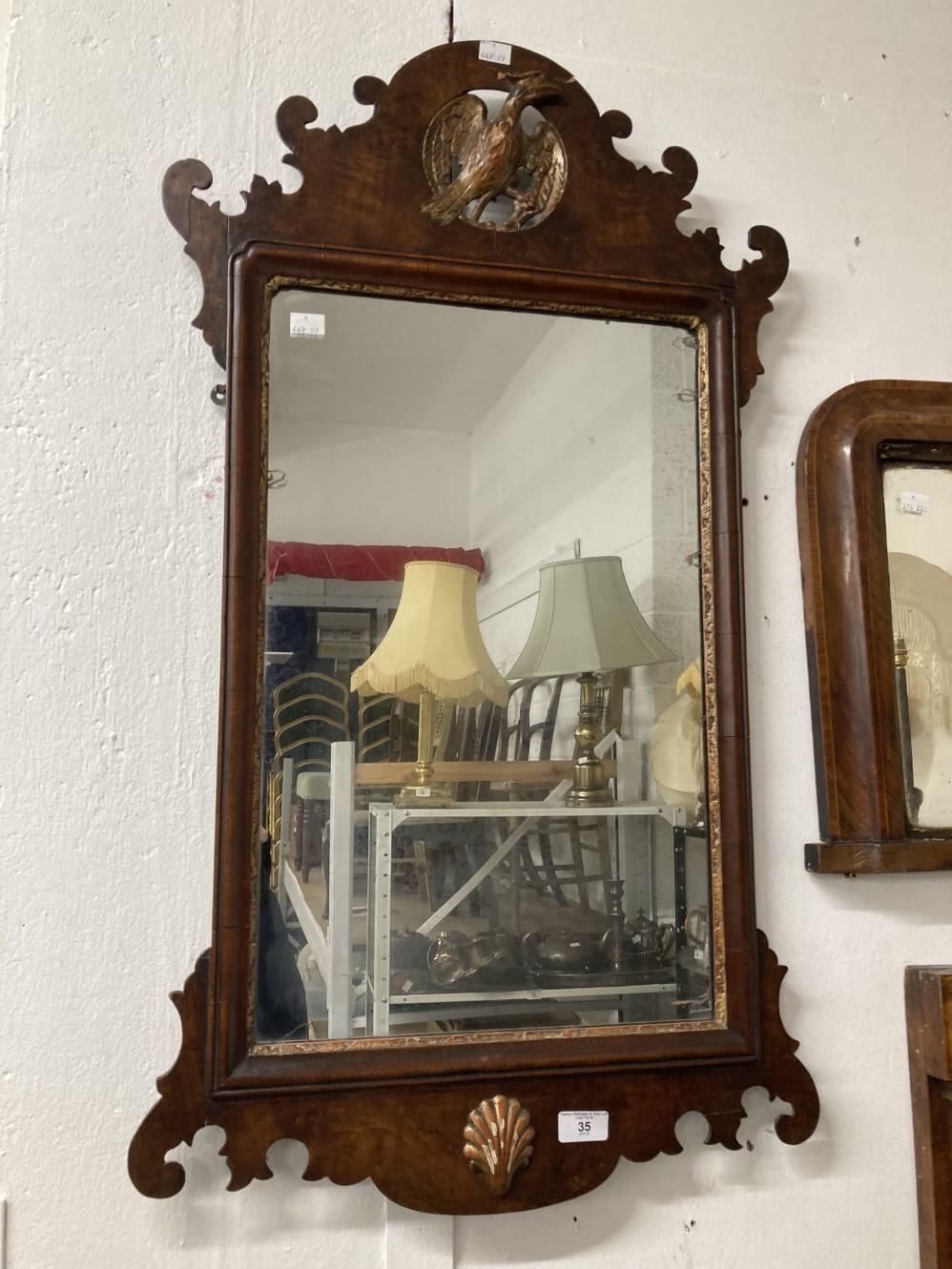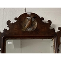 Early 19th cent. Mahogany mirror, shaped top with carved gilded ha ha bird and shaped bottom with gilded shell. 36ins. x 20ins.