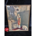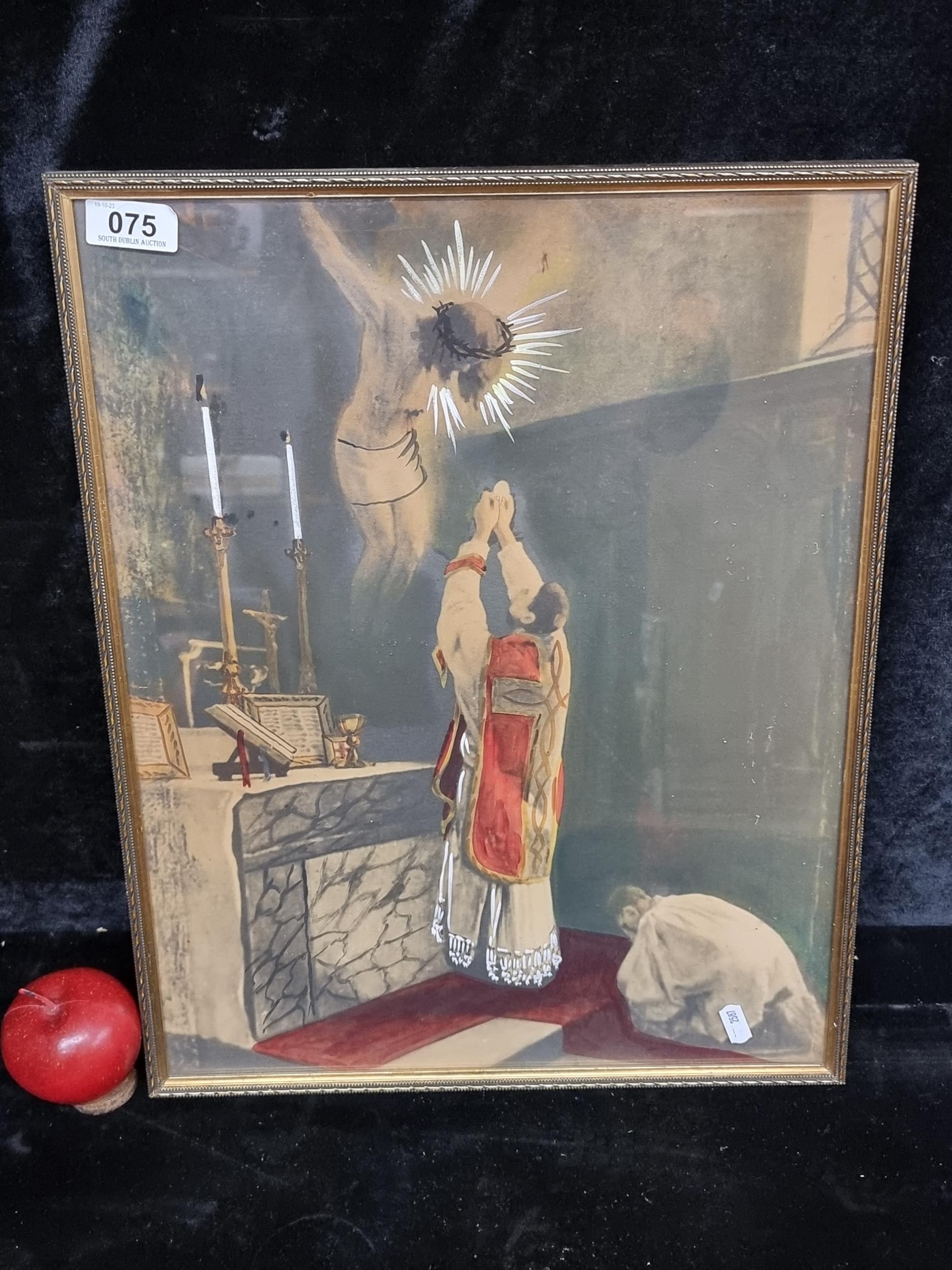 A vintage handcoloured photographic print of a religious scene with priests making an offering to Christ's crucified body. Housed in a gilt frame