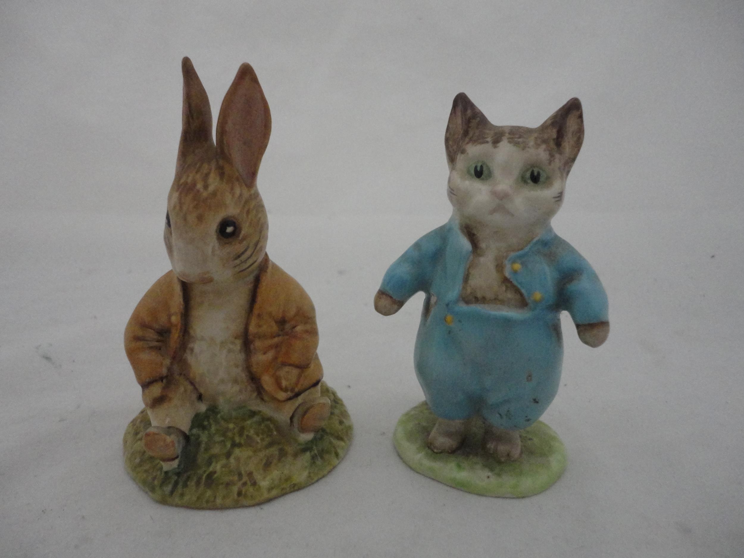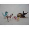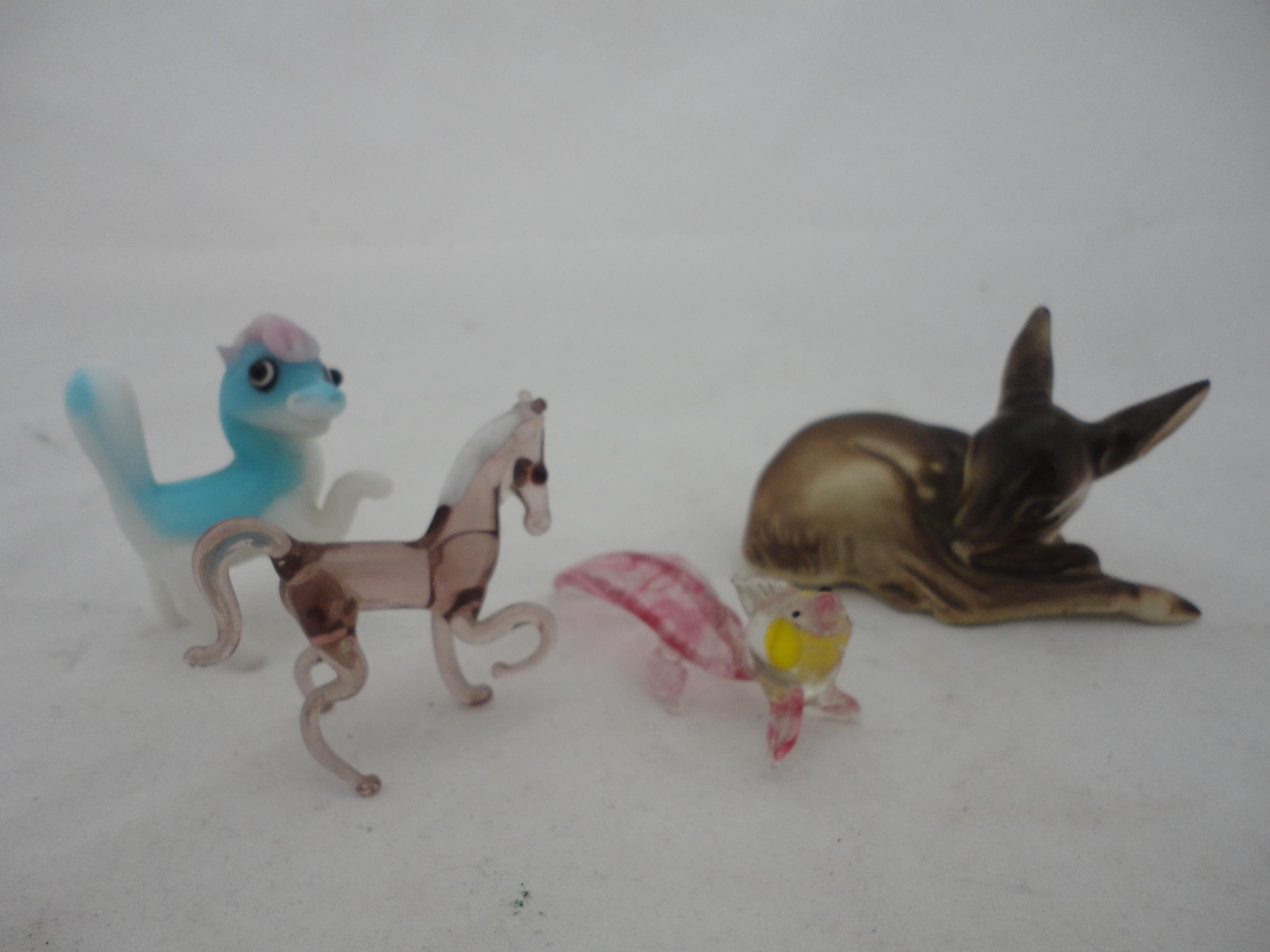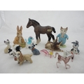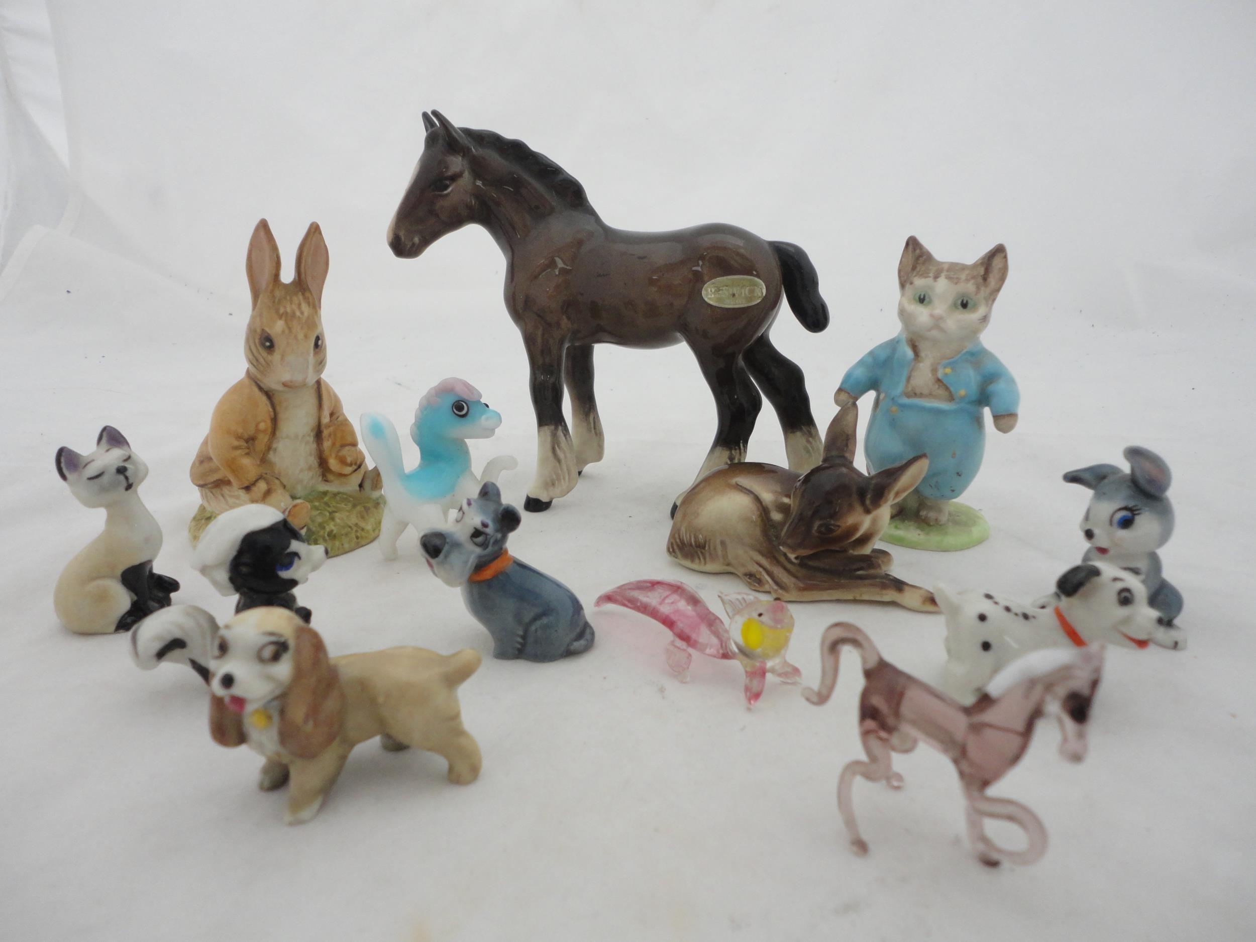Group of Wade Whimsies, glass animal figures, Beswick 'Tom Kitten' figure, Beswick 'Benjamin Bunny' figure, Beswick pony and a figure of a fawn.