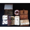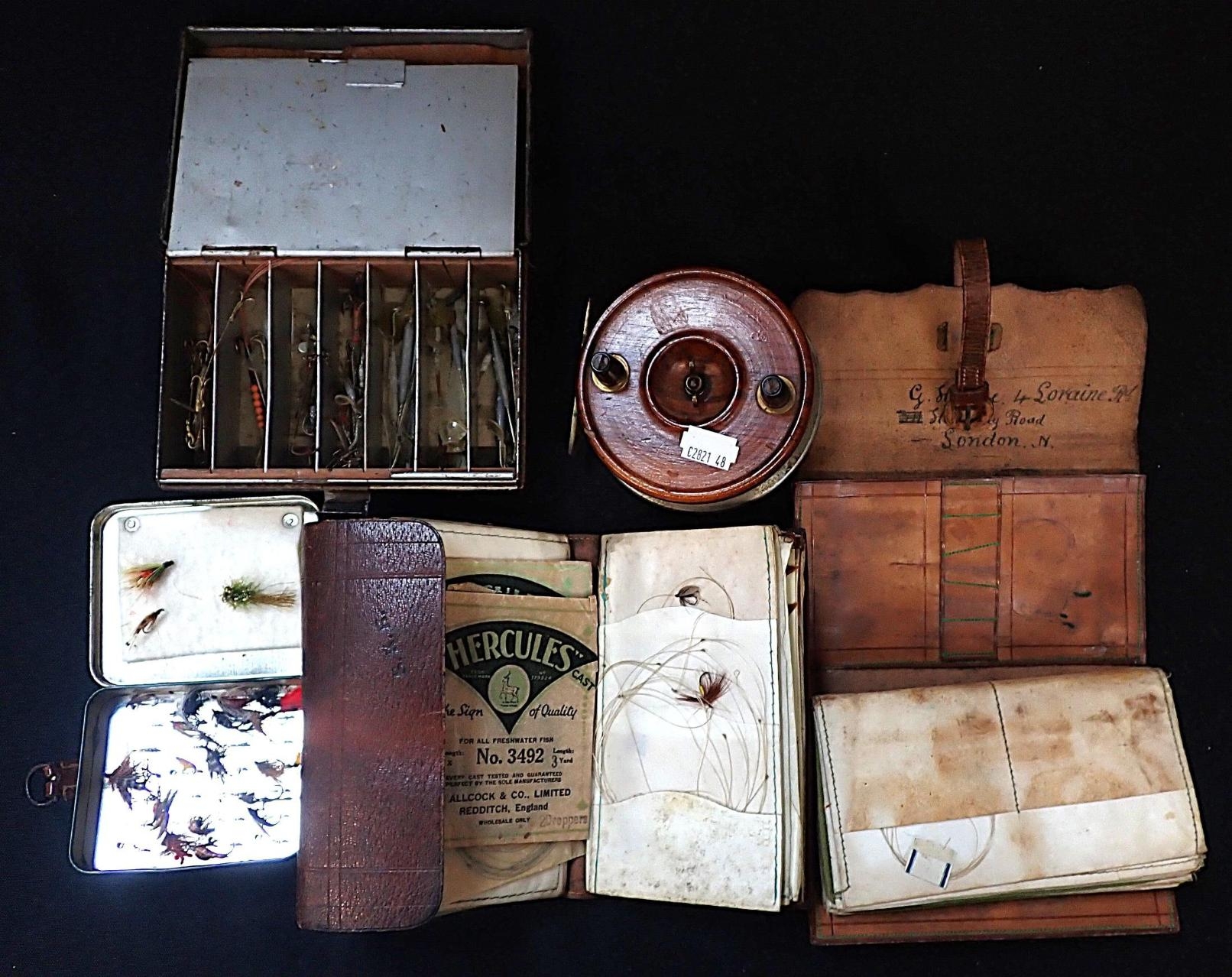 TWO VINTAGE BROWN LEATHER FLY WALLETStogether with a vintage lure tin with various lures; a walnut and metal trotting reel; and a Lock Levan Eyed Fly Box (5)