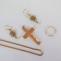 A selection of jewellery, including a 9ct gold cross pendant, 5cm long, a 9ct gold fancy link chain, a yellow metal ring, indistinctly stamped, ring size J, and further gold coloured jewellery, gross weight of yellow metal pieces 6gms (5) (at fault)