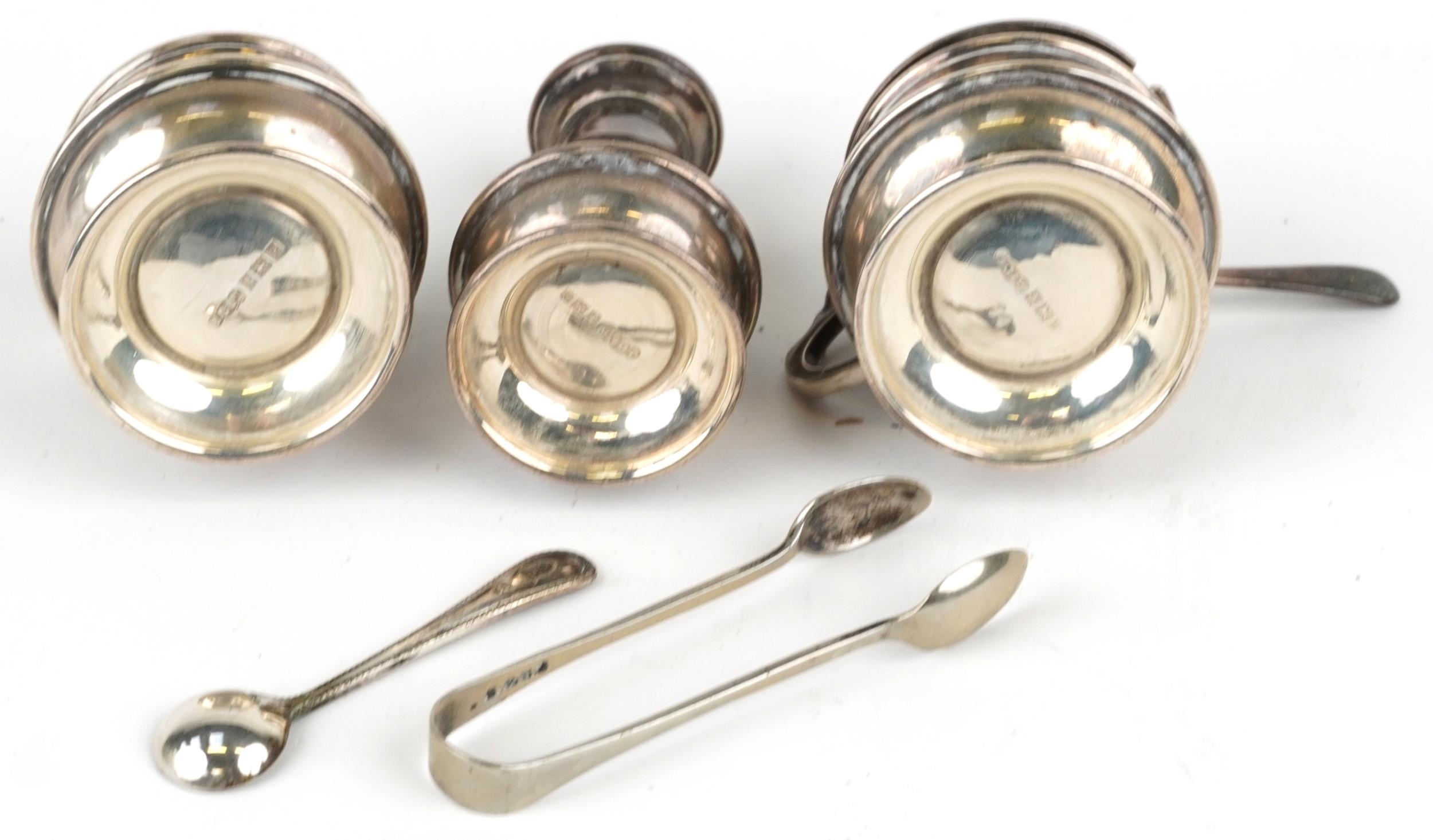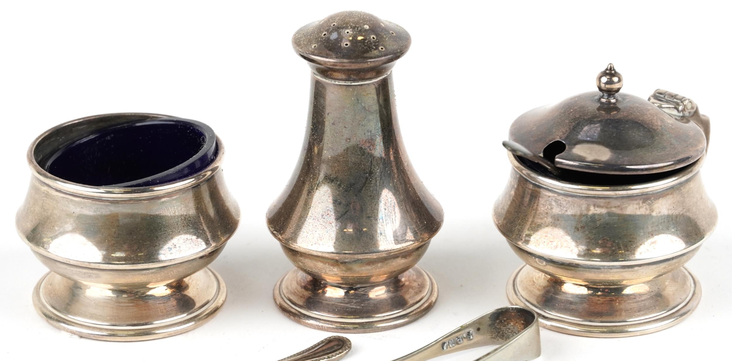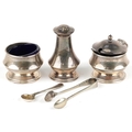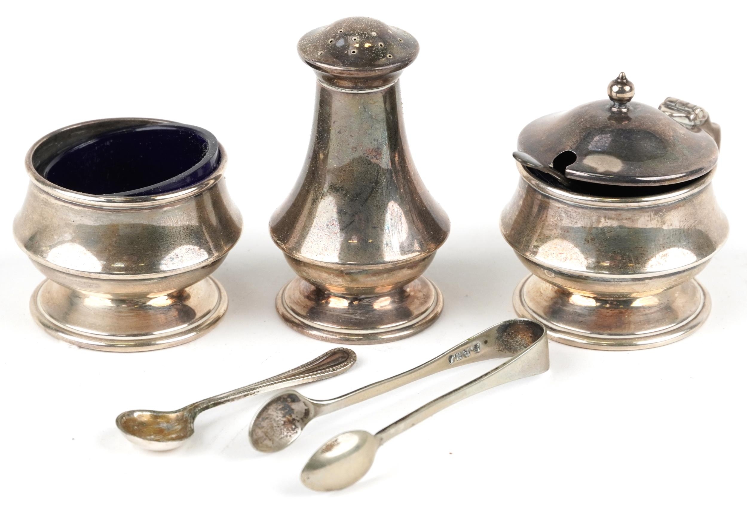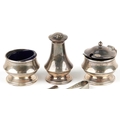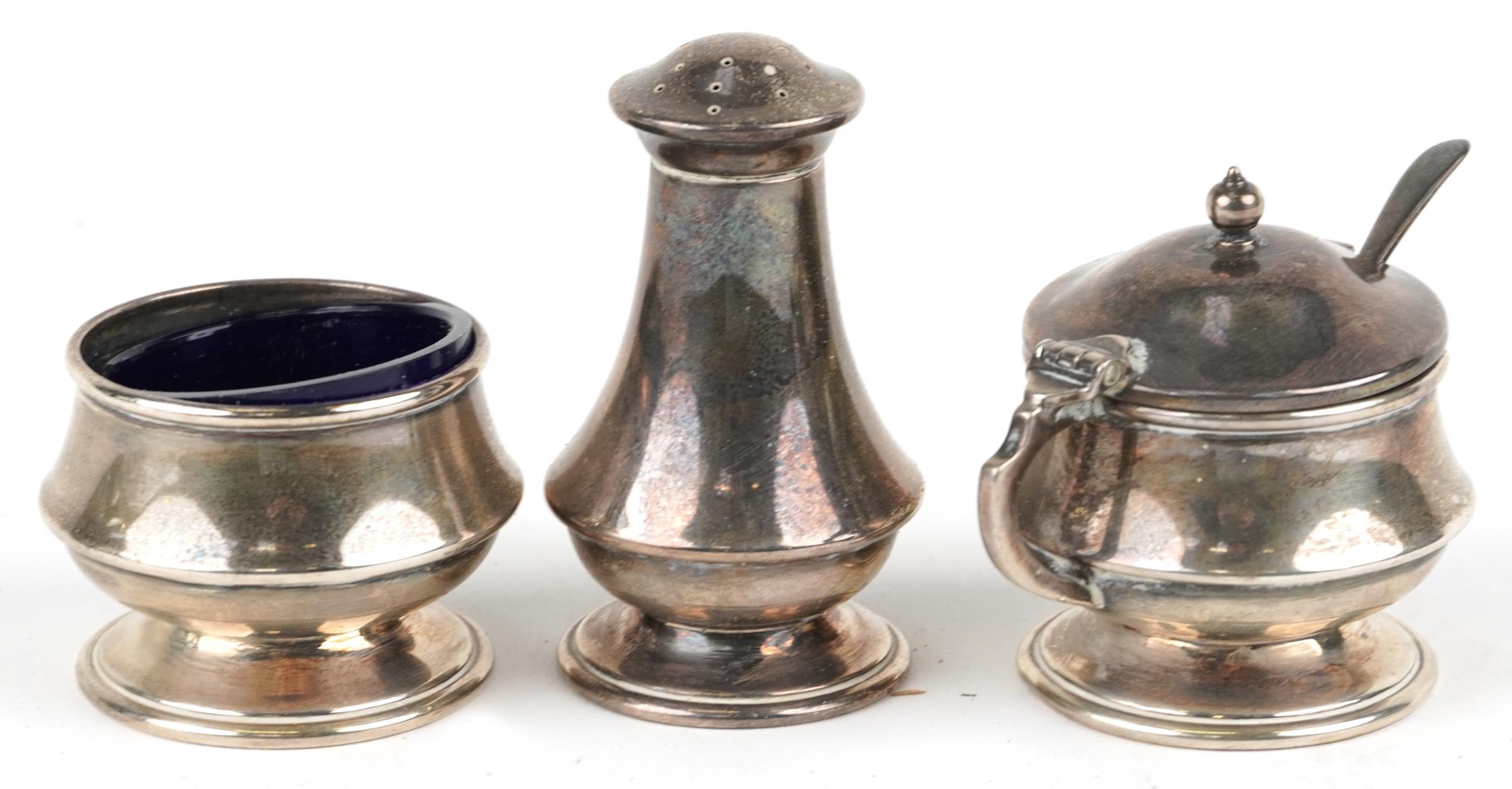 A silver three piece cruet set including a salt, pepper and mustard, with blue glass liners, Birmingham, by Joseph Gloster Ltd, the largest 6.5cm high, weighable silver 94.4g