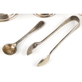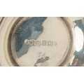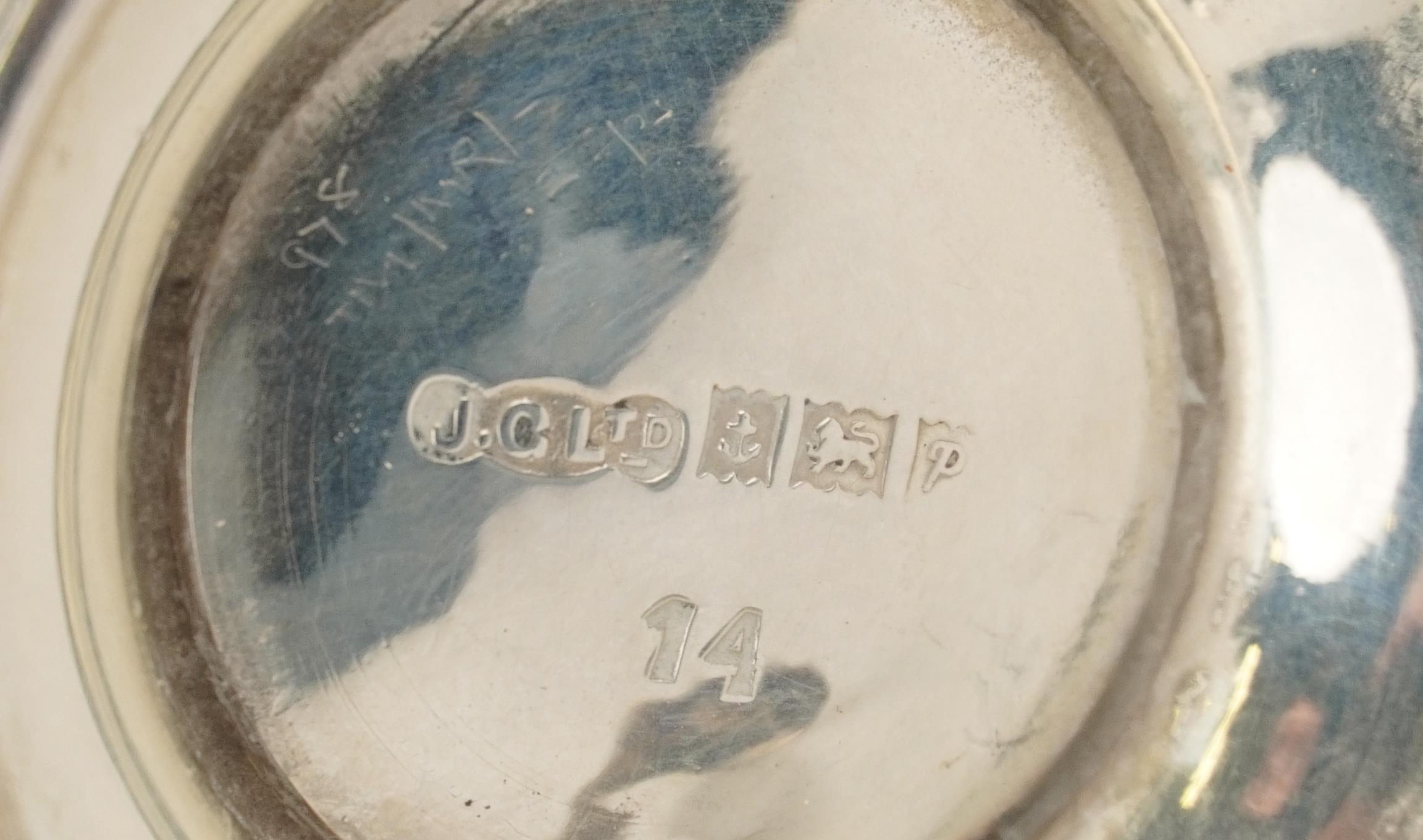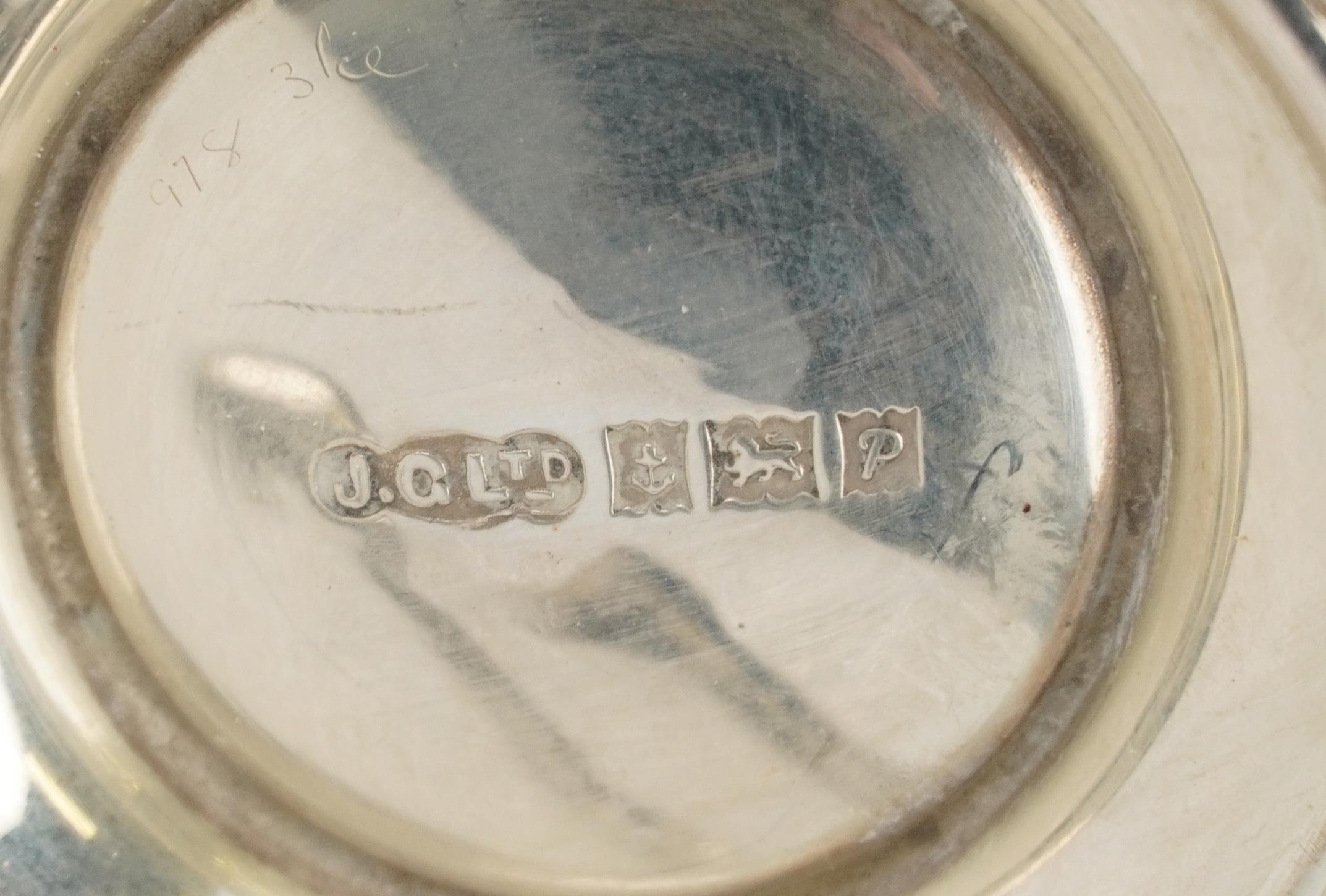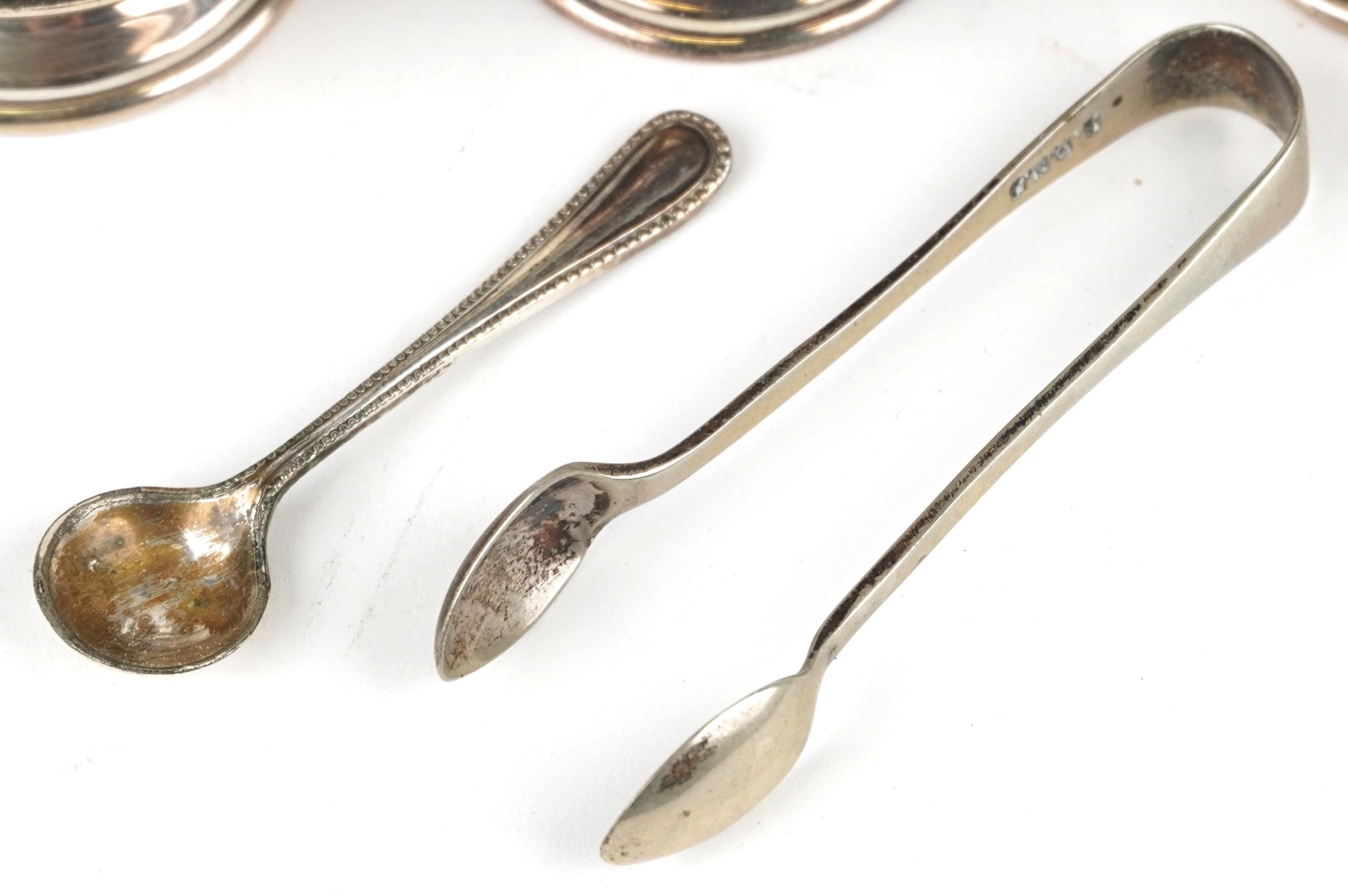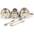 A silver three piece cruet set including a salt, pepper and mustard, with blue glass liners, Birmingham, by Joseph Gloster Ltd, the largest 6.5cm high, weighable silver 94.4g