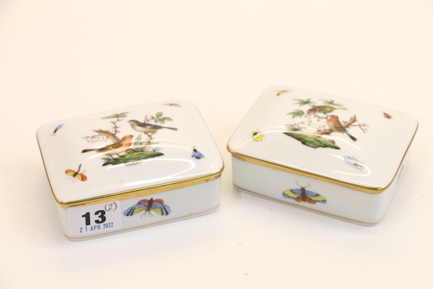 Two Herend ceramic trinket boxes decorated with birds and insects, 7973/RO to base, 10cm wide.