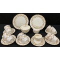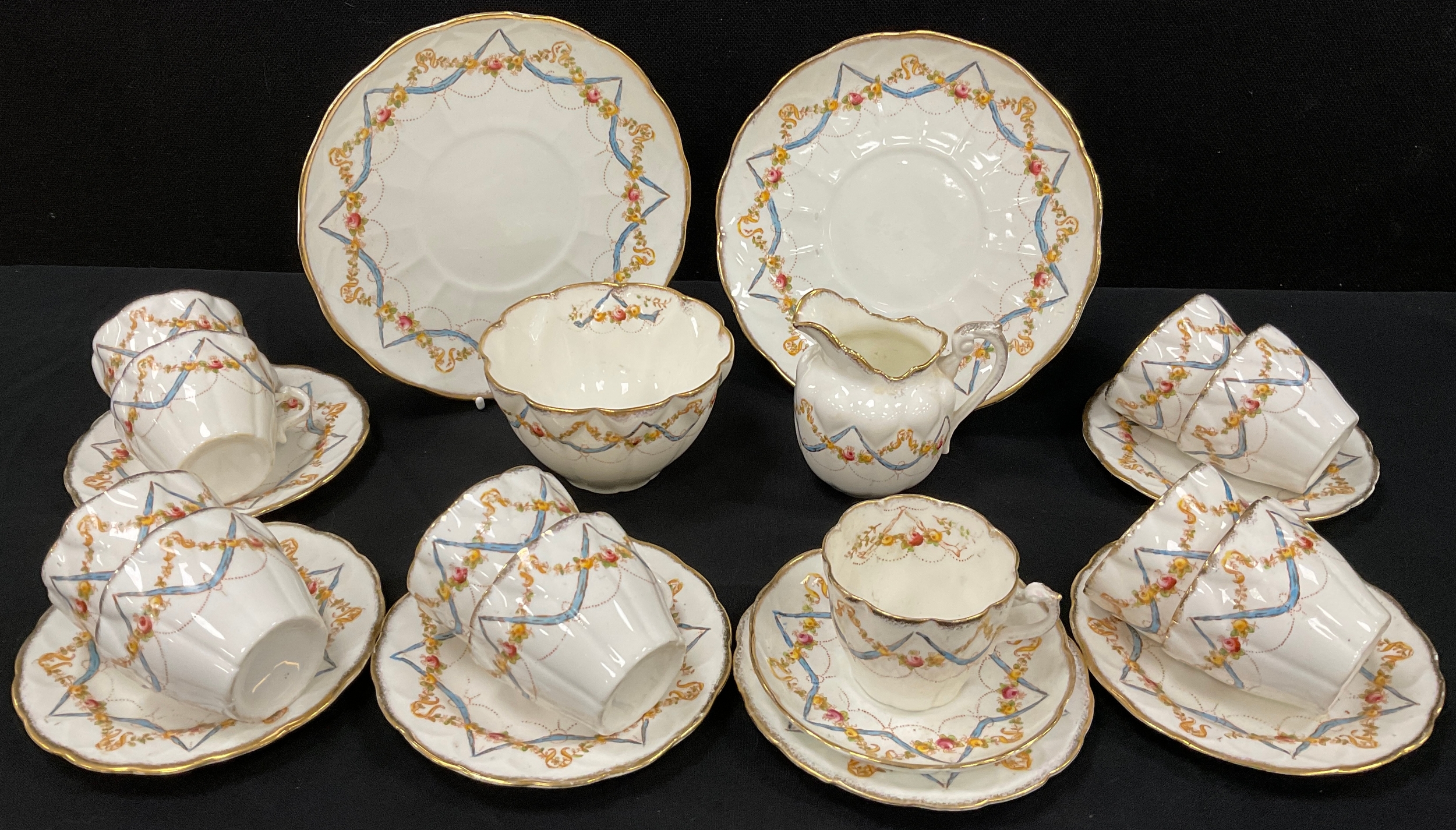 An early 20th century tea set, decorated with roses and ribbon swags comprised of, two picnic plates, milk jug, sugar bowl, eleven tea cups, six side plates, one saucer, c.1905.