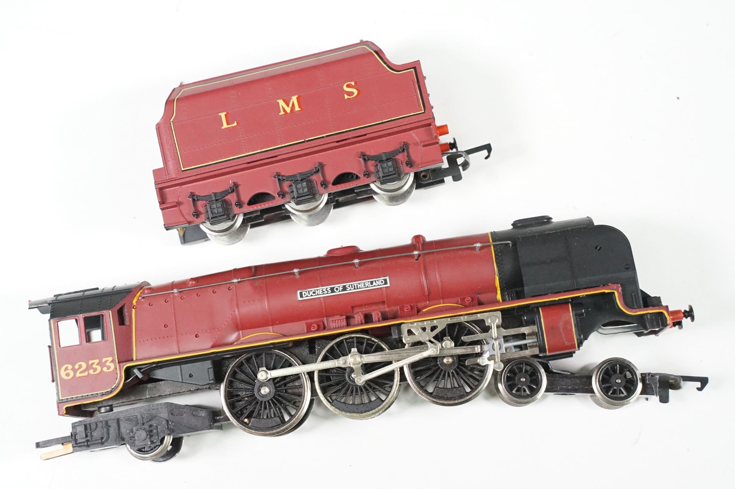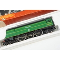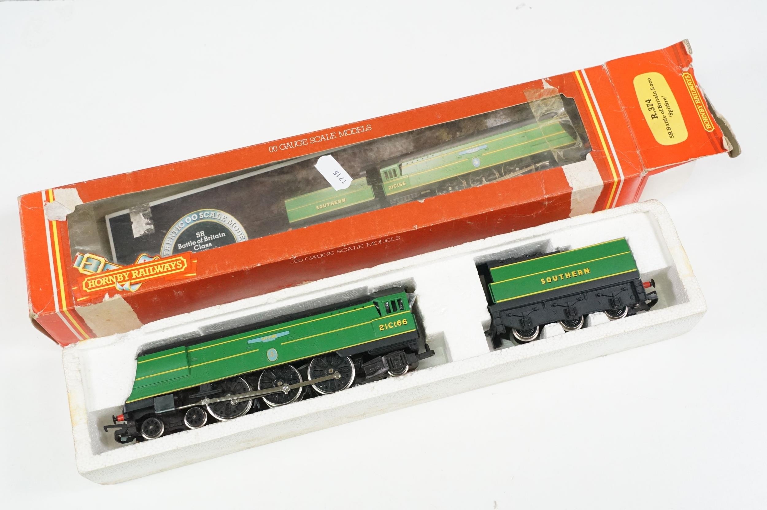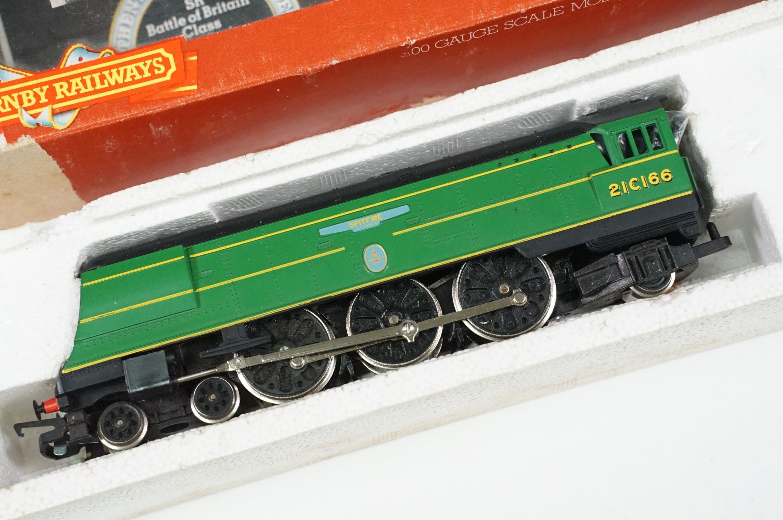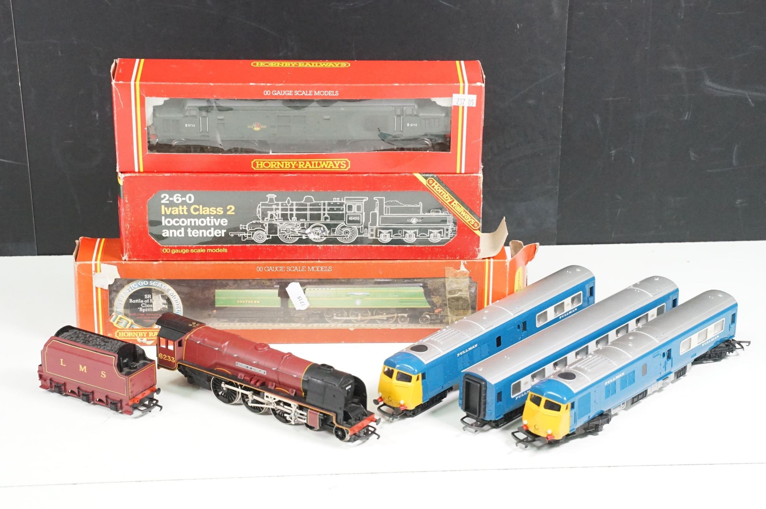 Three boxed Hornby OO gauge locomotives to include R374 SR Battle of Britain Loco Spitfire, R284 BR Co Co Diesel Class 37 green and 2-6-0 Ivatt Class 2 locomotive and tender plus a Hornby Duchess of Sutherland locomotive and Triang Pullman 3 Car DMU set, boxes showing some wear (7 items)