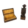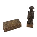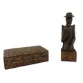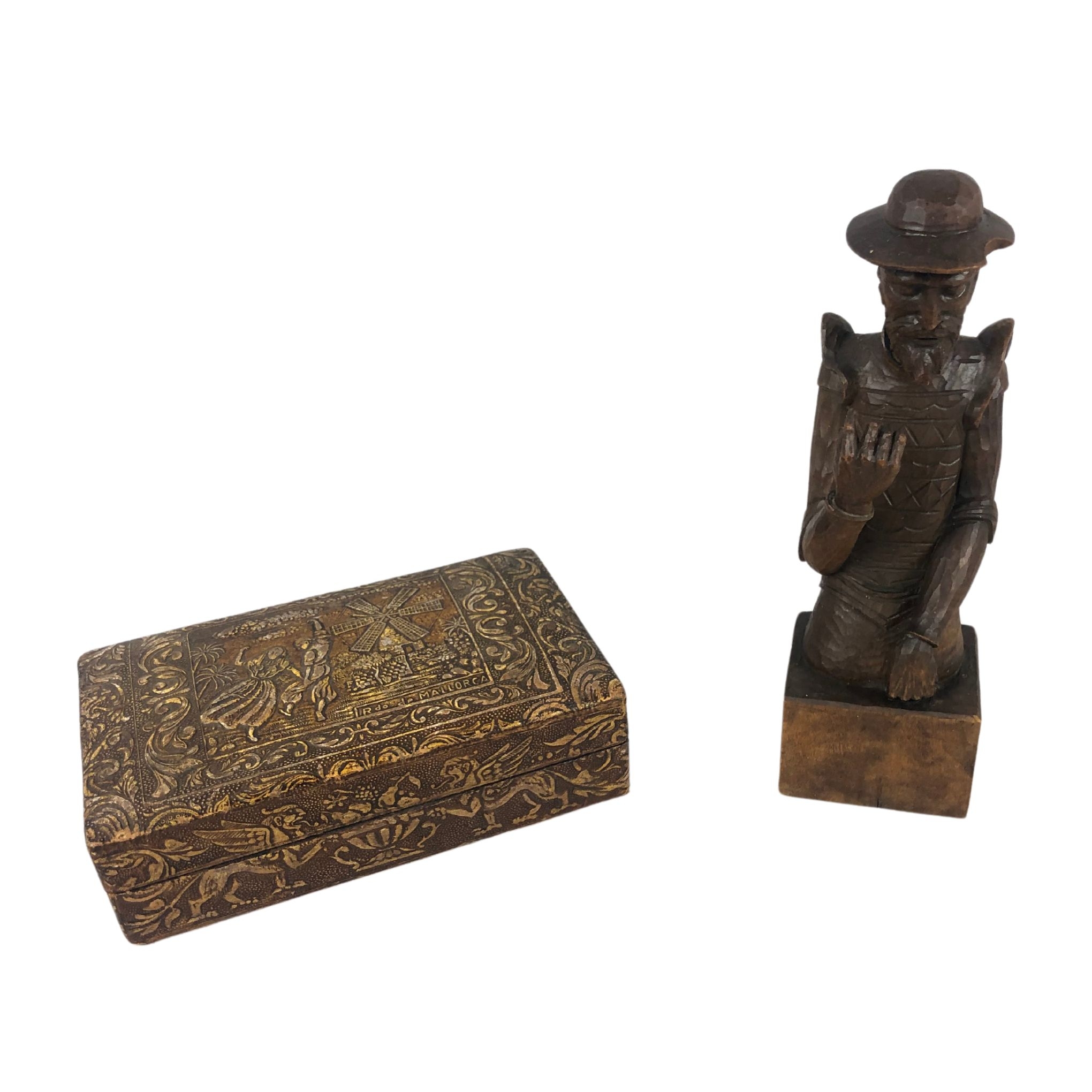 Vintage Cigarette Box of Tooled Leather Covered Wood Made in Spain and a Wooden Figurine of Don Quixote.