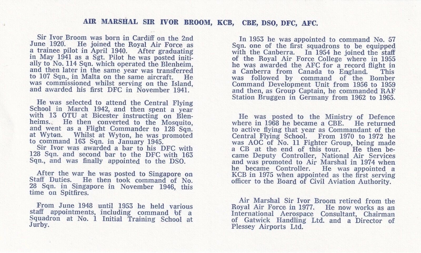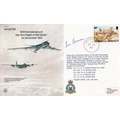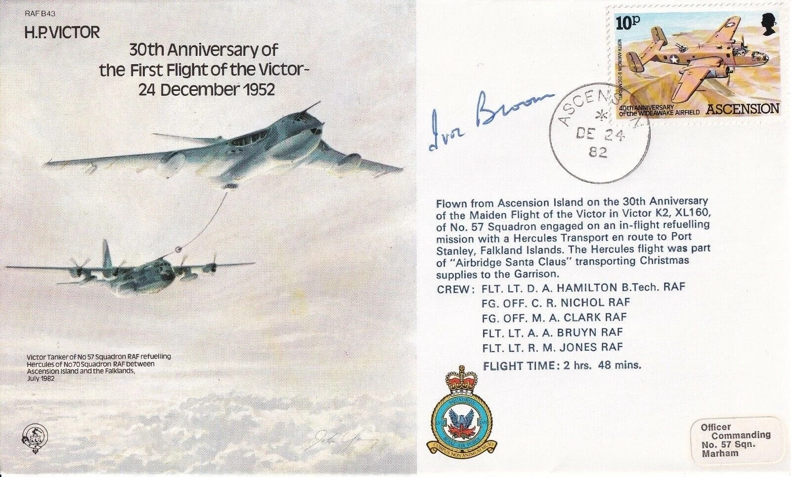 B43c 30th Anniv 1st Flight Victor Signed Air Vice Marshal I G Broom Pilot in WW11. 24 De 82 Ascension Postmark on 10p B25c Ascension Stamp. Black flown cachet flown from Ascension Island on the 30th Anniversary of the maiden flight of the Victor in Victor K2 XL160 of No 57 Sqn engaged on an in - flight refuelling mission with a Hercules Transport en route to Port Stanley Falkland Islands. The Hercules flight was part of Airbridge Santa Claus transporting Christmas supplies to the Garrison. Picture cachet of Victor Tanker of No 57 Sqn refuelling Hercules of No 70 Sqn between Ascension Island and the Falklands July 1982. Personally Signed by Air Vice Marshal I G Broom. Ivor joined the Royal Air Force as a trainee pilot in early 1940 at the age of 19. Eleven months later, he was a sergeant pilot on 114 Squadron undertaking low-level daylight bombing raids in Blenheim aircraft. He flew similar operations from Malta in 1941 with Nos 105 and 107 Squadrons and while there was commissioned after No. 107 Squadron had lost all their officers. In 1943, he became an instructor on Mosquitos and by the time World War Two had ended was a 24 year-old wing commander in charge of No. 163 Mosquito bomber squadron in the Pathfinder Force. He completed over a 100 bombing missions, was awarded the distinguished flying cross and two bars and also made a member of the distinguish service order. Certified Copy No 940 of 1460 Signed. Single Vendor RAF cover collection. Good condition. All autographs come with a Certificate of Authenticity. We combine postage on multiple winning lots and can ship worldwide. UK postage from £5.99, EU from £7.99, Rest of World from £9.99