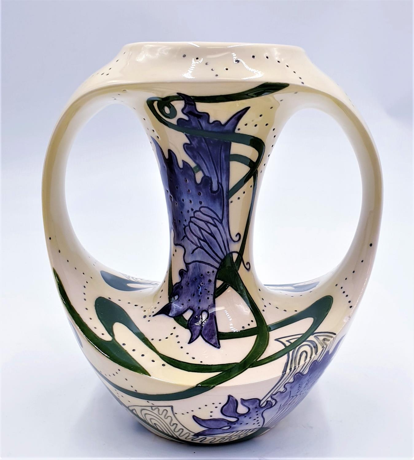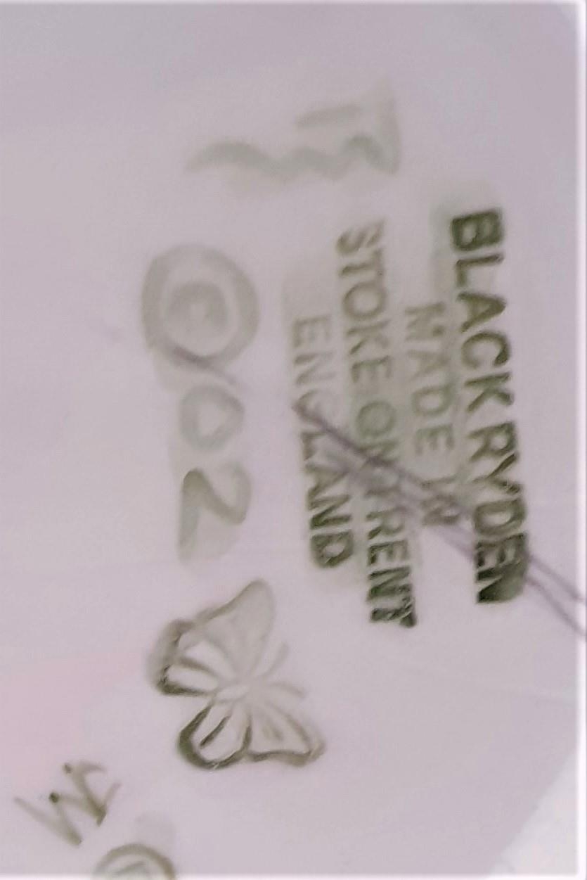 Black Ryden was the second new art pottery to emerge from the Moorcroft stable, the first having been Cobridge Stoneware in 1998. Original design work and shape prototypes for Black Ryden were first developed on earthenware bodies within Cobridge Stoneware. Experimentation and research married together two old techniques of surface decoration, the first being the art of sgraffito and the second being 'upbrush'. Upbrush is a means of applying powdered colour derived from metallic oxides mixed with water.