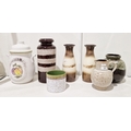 Group of West German pottery comprising a 1960's globular vase with everted rim in mottled brown and green glazes, a pair of tapering oviform bottle vases, a jug, a cylindrical vase with striped cream and brown glazes and a cylindrical flower pot, tallest vase 29.5cm high and a storage jar and cover of baluster reeded form, inscribed Rumtopf (7)