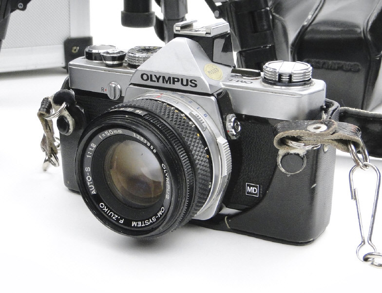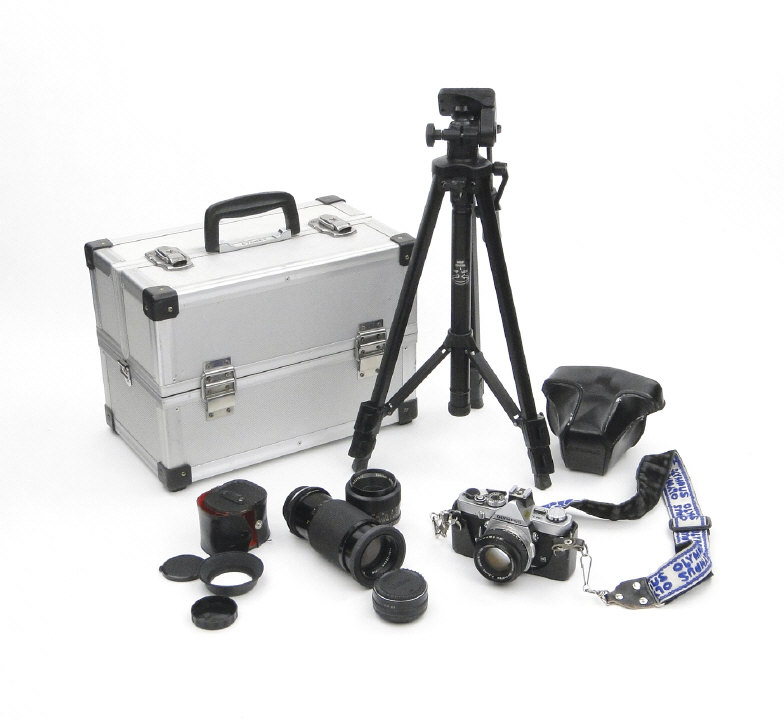 Olympus OM1 camera body, a selection of lenses, tripod and accessories