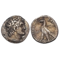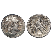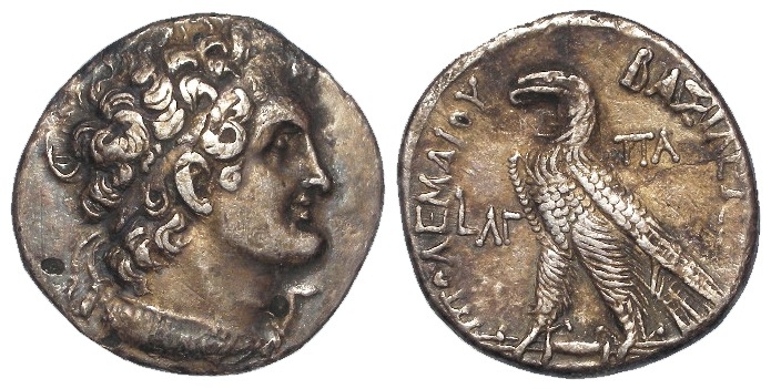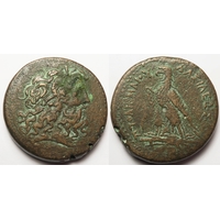 Ancient Greek: Ptolemaic Egypt, Ptolemy VIII Euergetes II (Physcon), second reign 145-116 BC silver Tetradrachm, Alexandria, regnal year 33 (149/8BC). Diademed head of Ptolemy I to right, wearing aegis. / ΒΑΣΙΛΕΩΣ - ΠΤΟΛΕΜΑΙΟΥ Eagle, with closed wings, standing to left on thunderbolt; in the field to left, LΛΓ; in the field to right, ΠA. 12.74g. Toned VF, hairline crack, a few surface pits. A little light(?) i.e. possible fourrée.