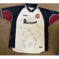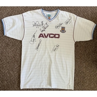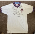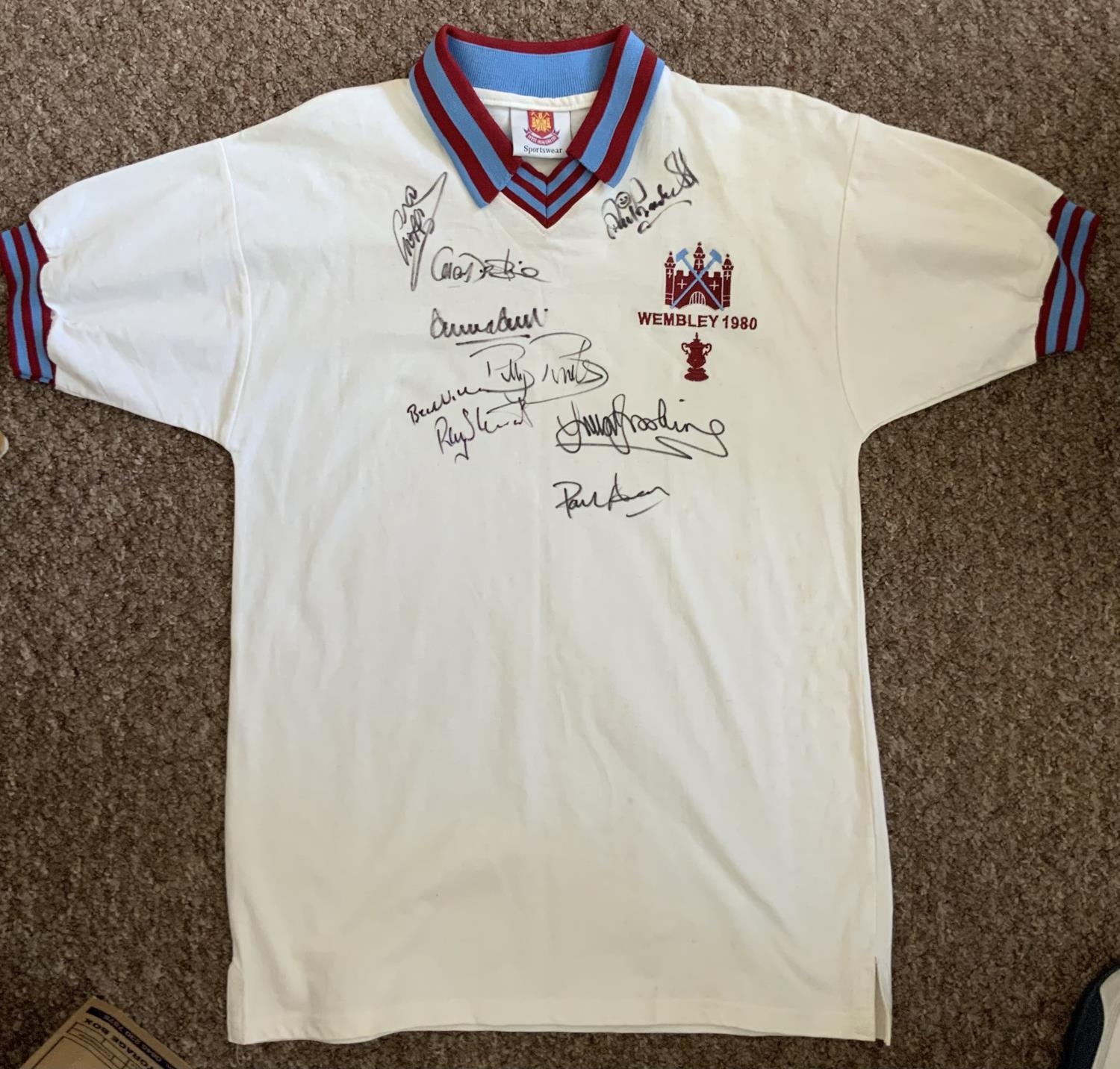 West Ham 1980 FA Cup Final Signed Football Shirt: White retro shirt in size medium signed by 8 including Bonds and Brooking.