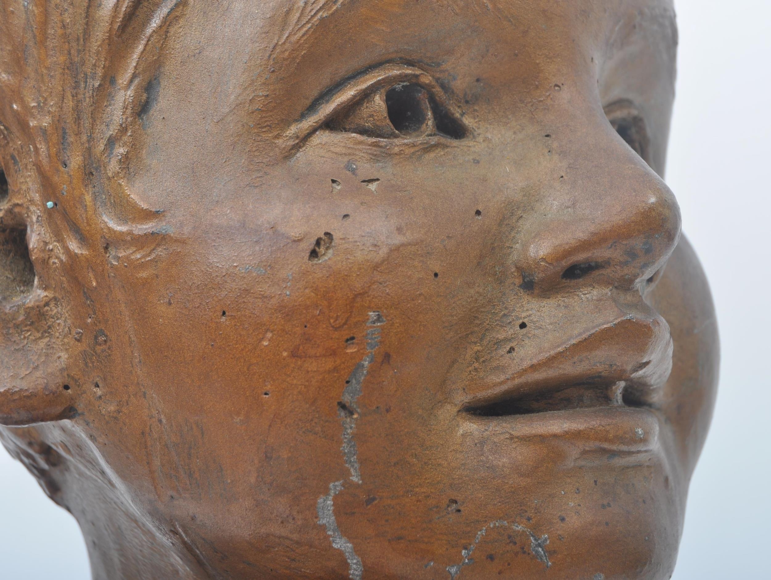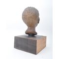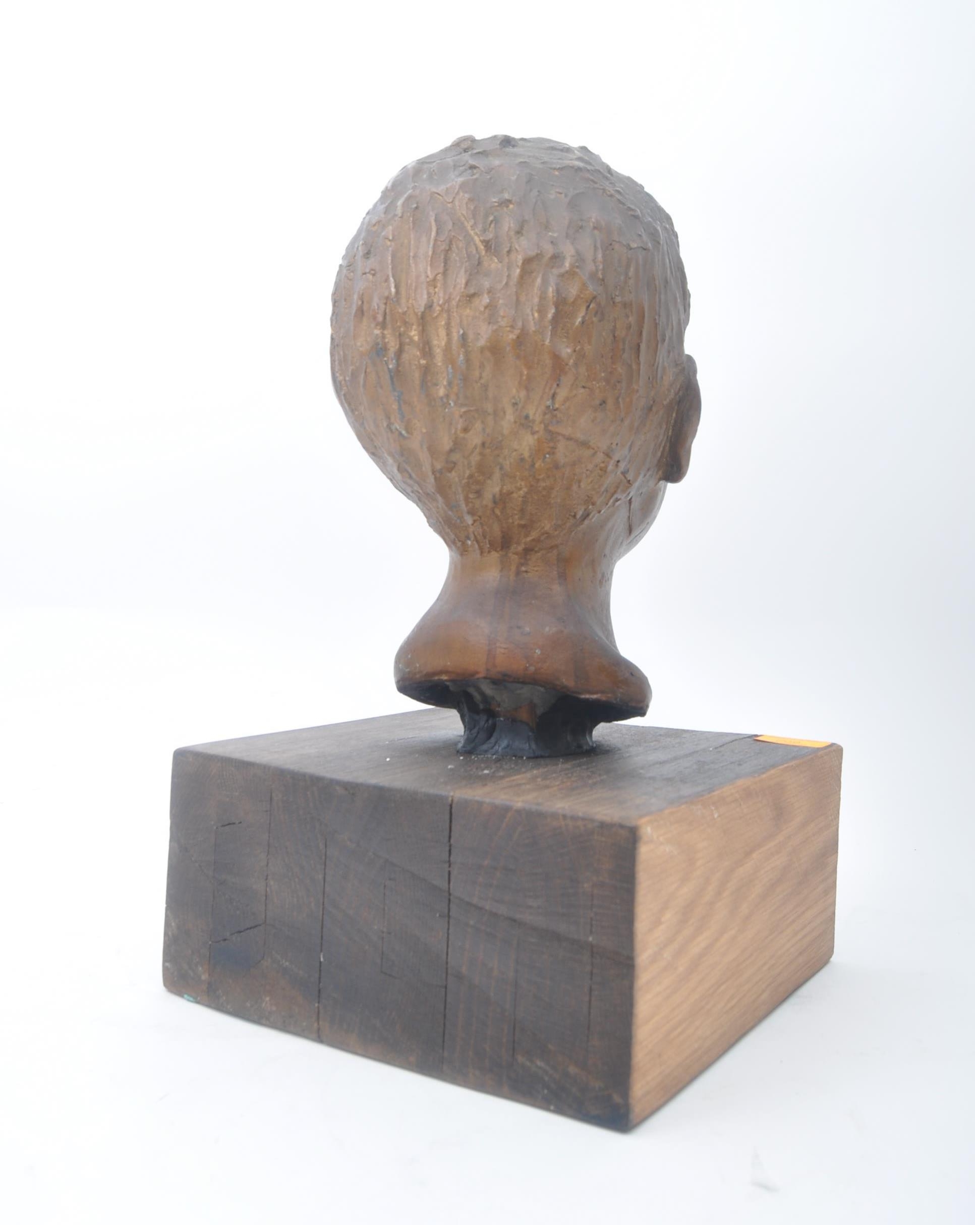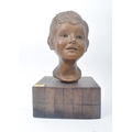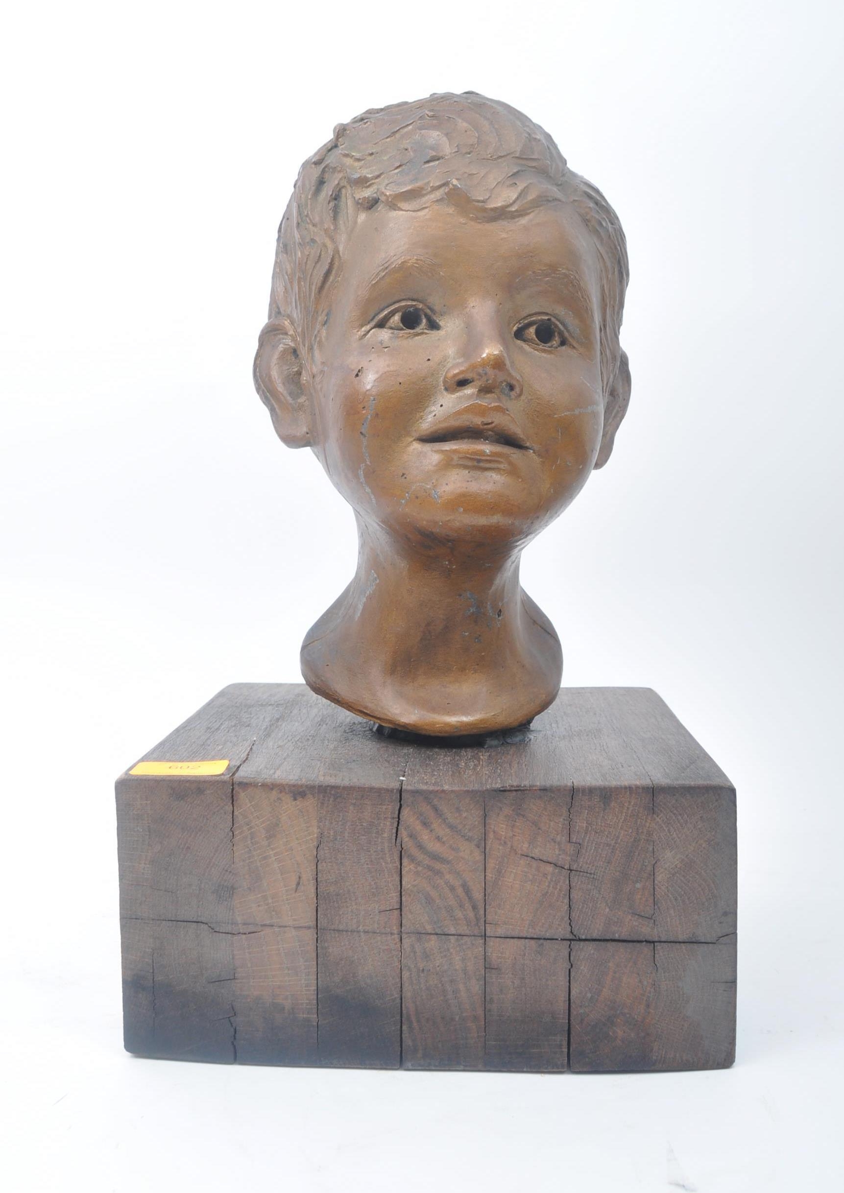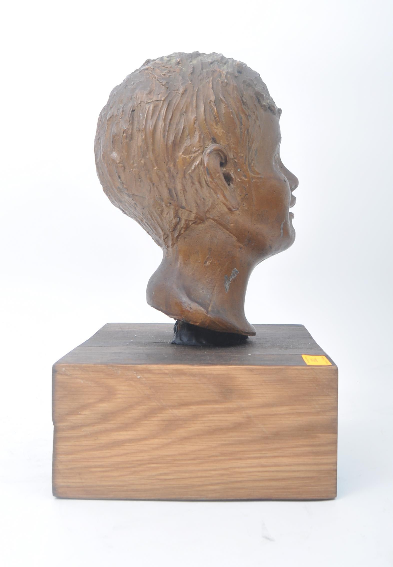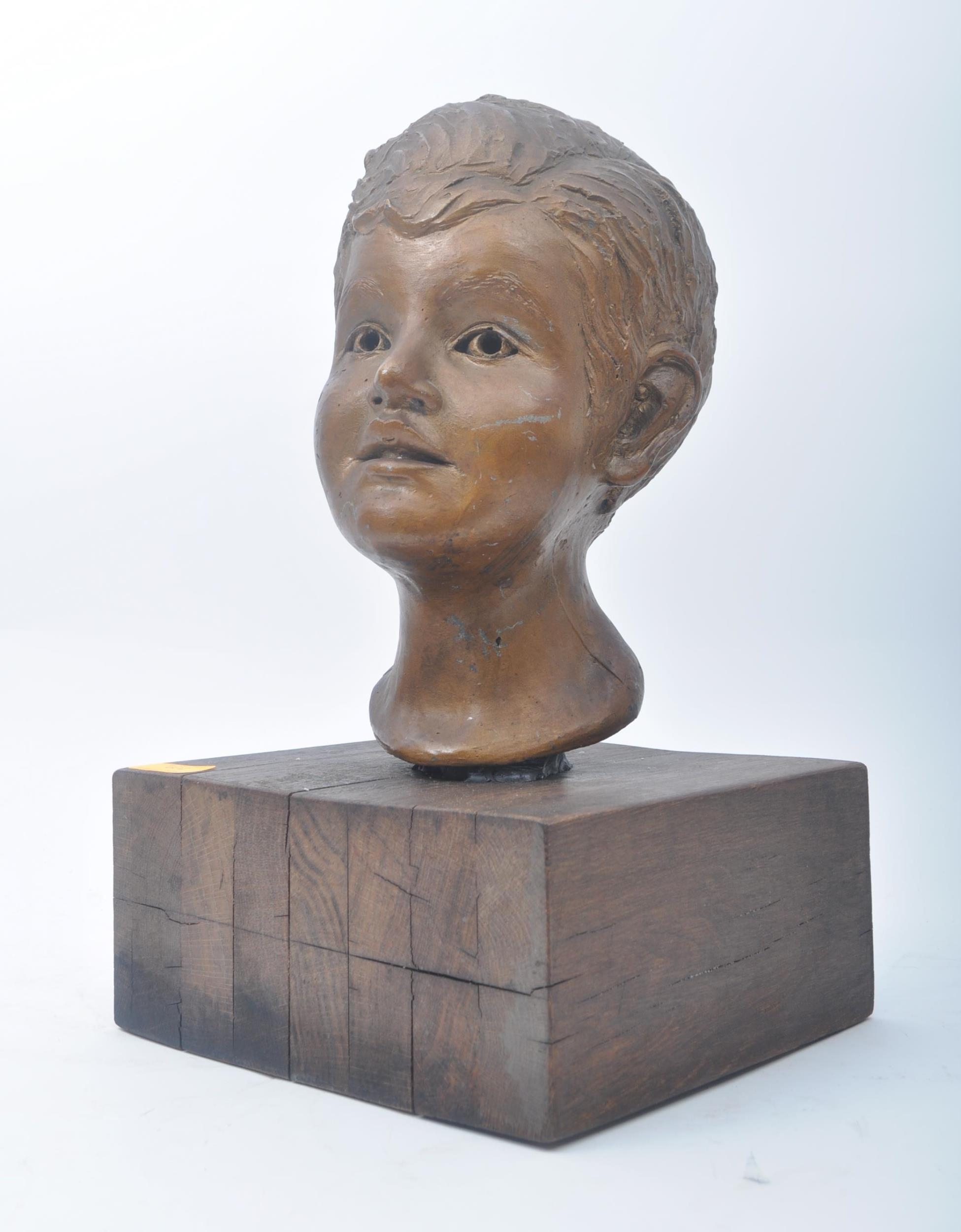 A vintage 20th century plaster hand sculpted head figure of boy's head. The head painted in bronze like effect. Raised on wooden plinth base. Measures approx. 45 x 25 x 25cm