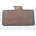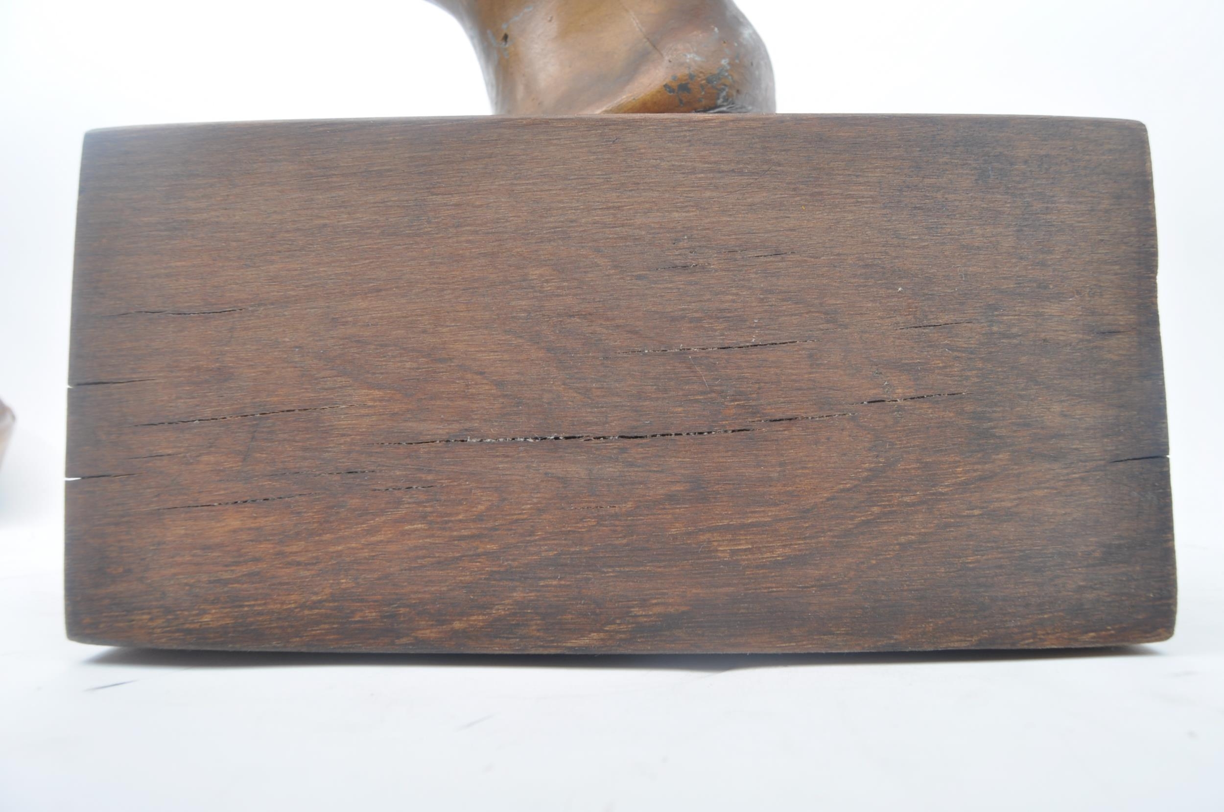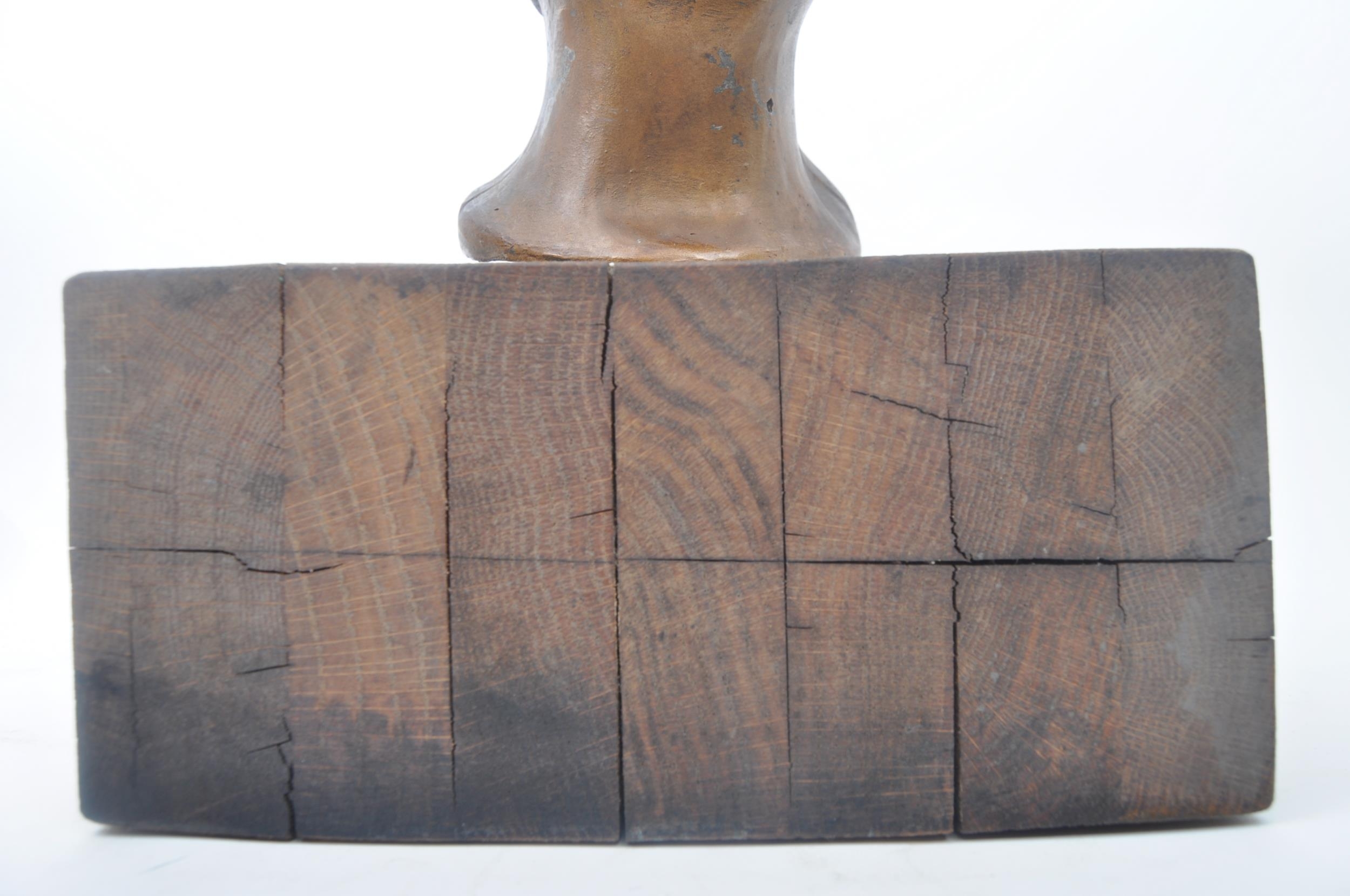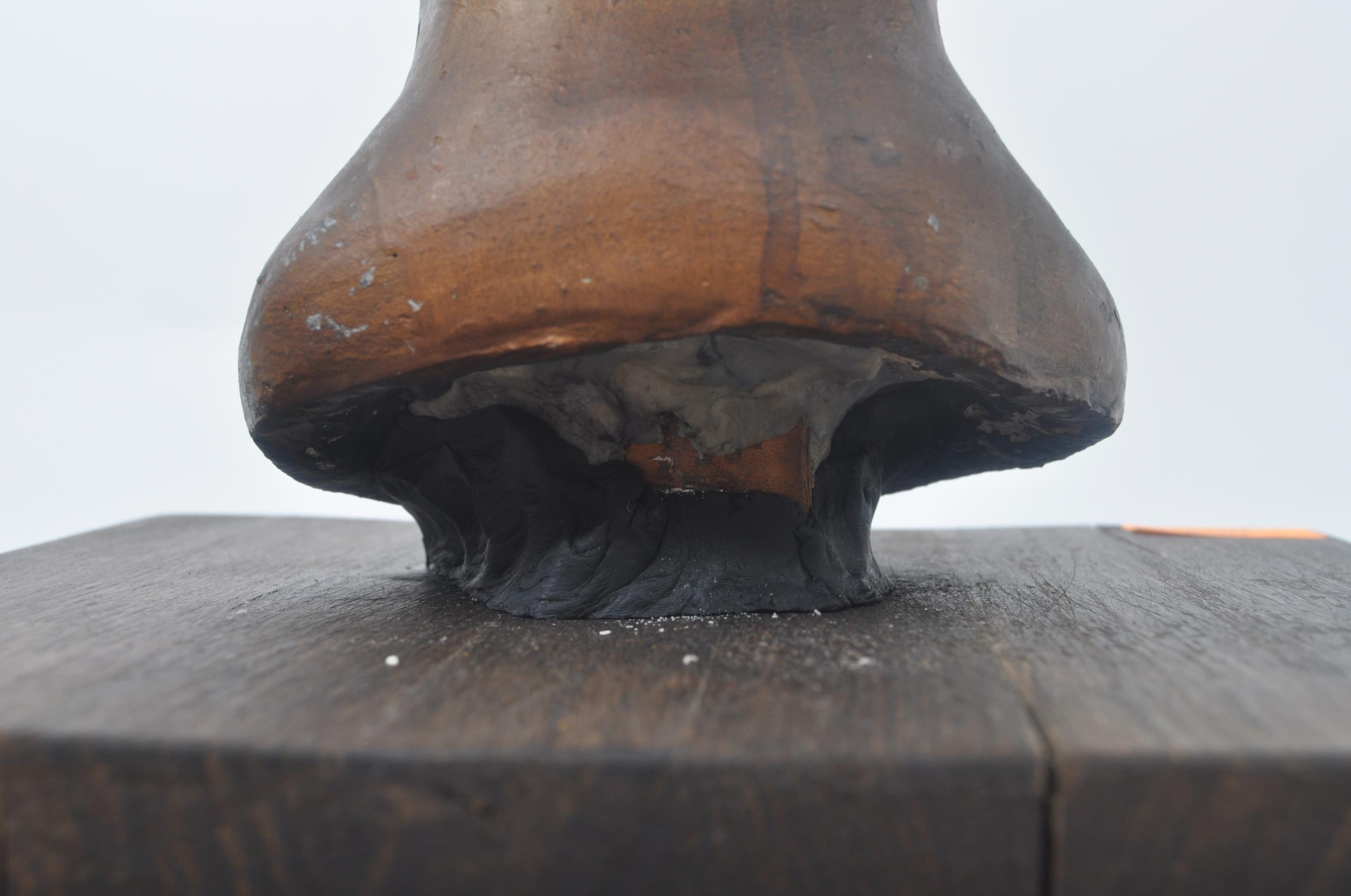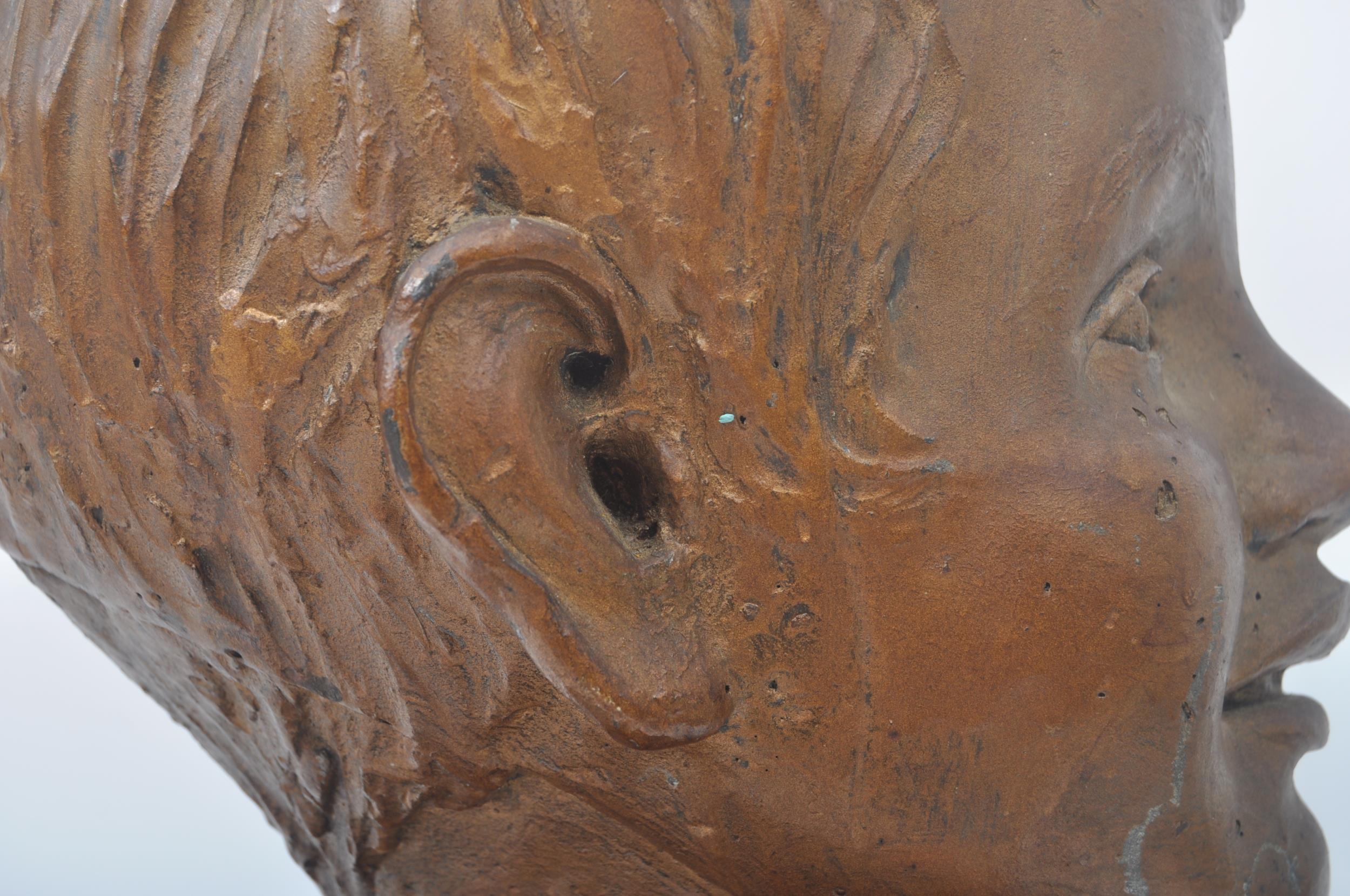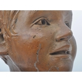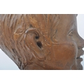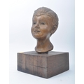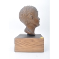 A vintage 20th century plaster hand sculpted head figure of boy's head. The head painted in bronze like effect. Raised on wooden plinth base. Measures approx. 45 x 25 x 25cm