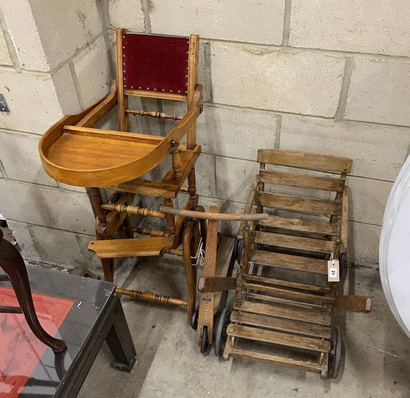 An early 20th century French pull along child's chair, a metamorphic child's chair and a scooter