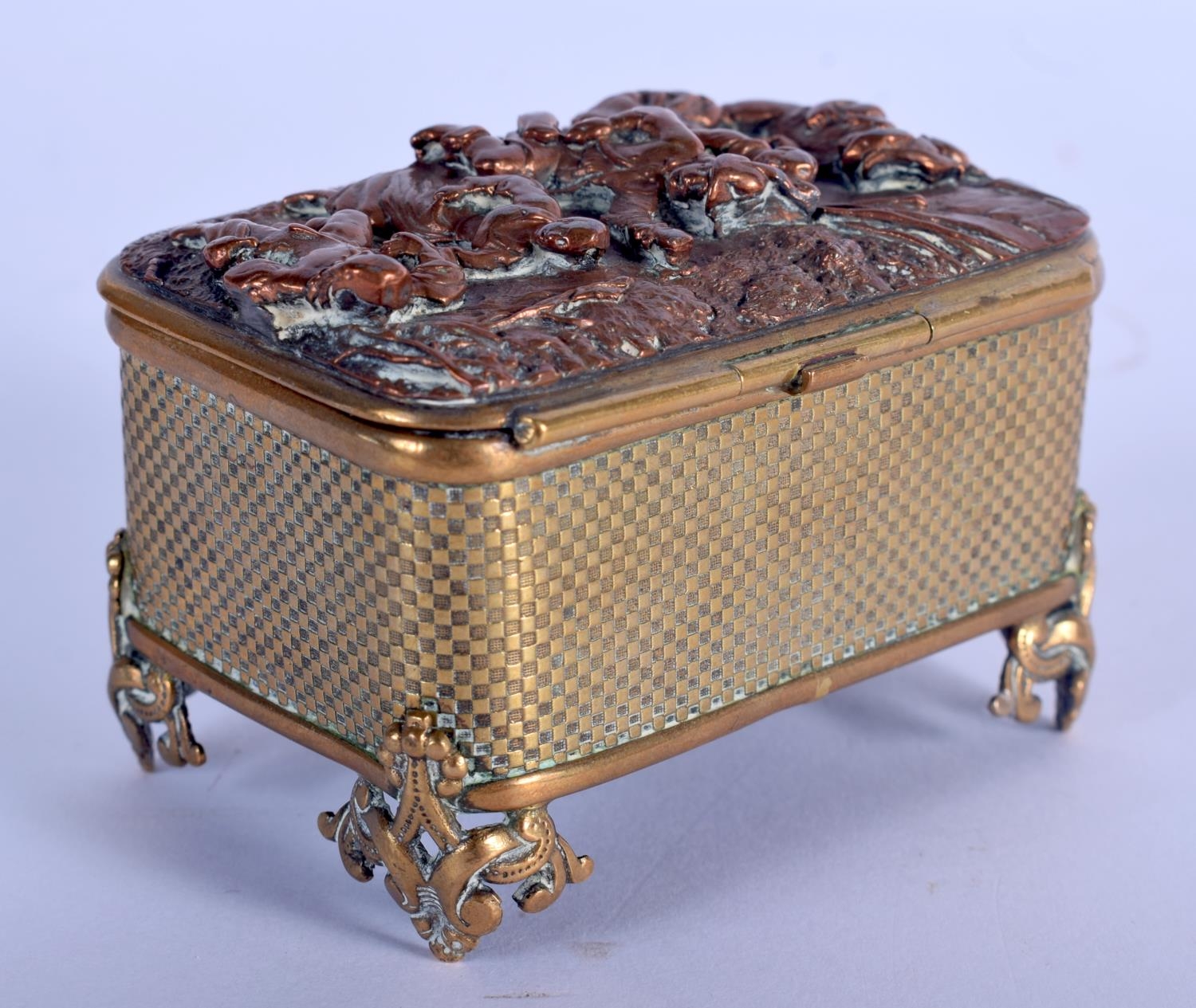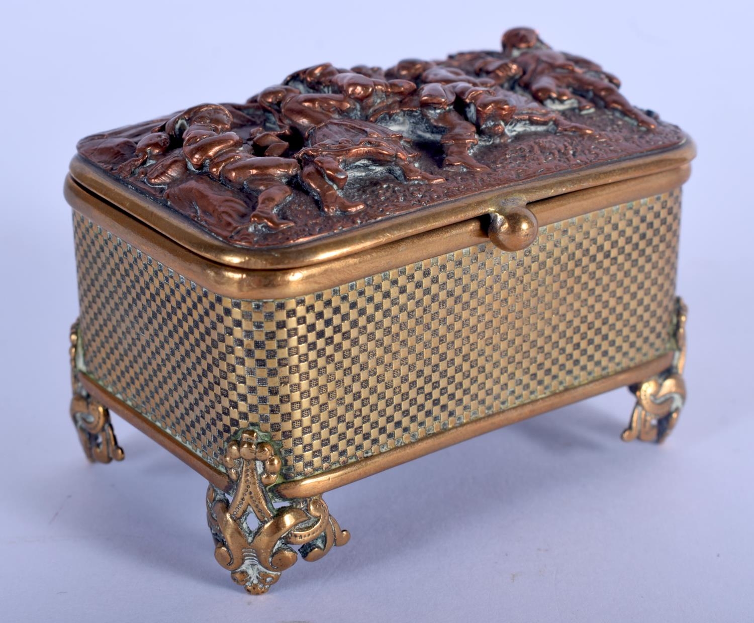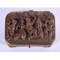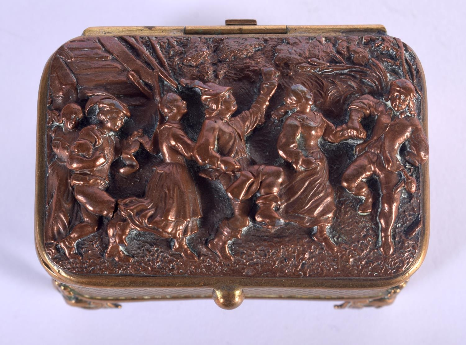 A MID 19TH CENTURY EUROPEAN MIXED METAL ELKINGTON TYPE CASKET decorated with figures merry making. 7.5 cm x 4 cm.