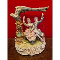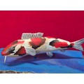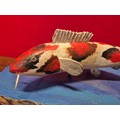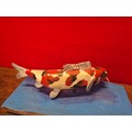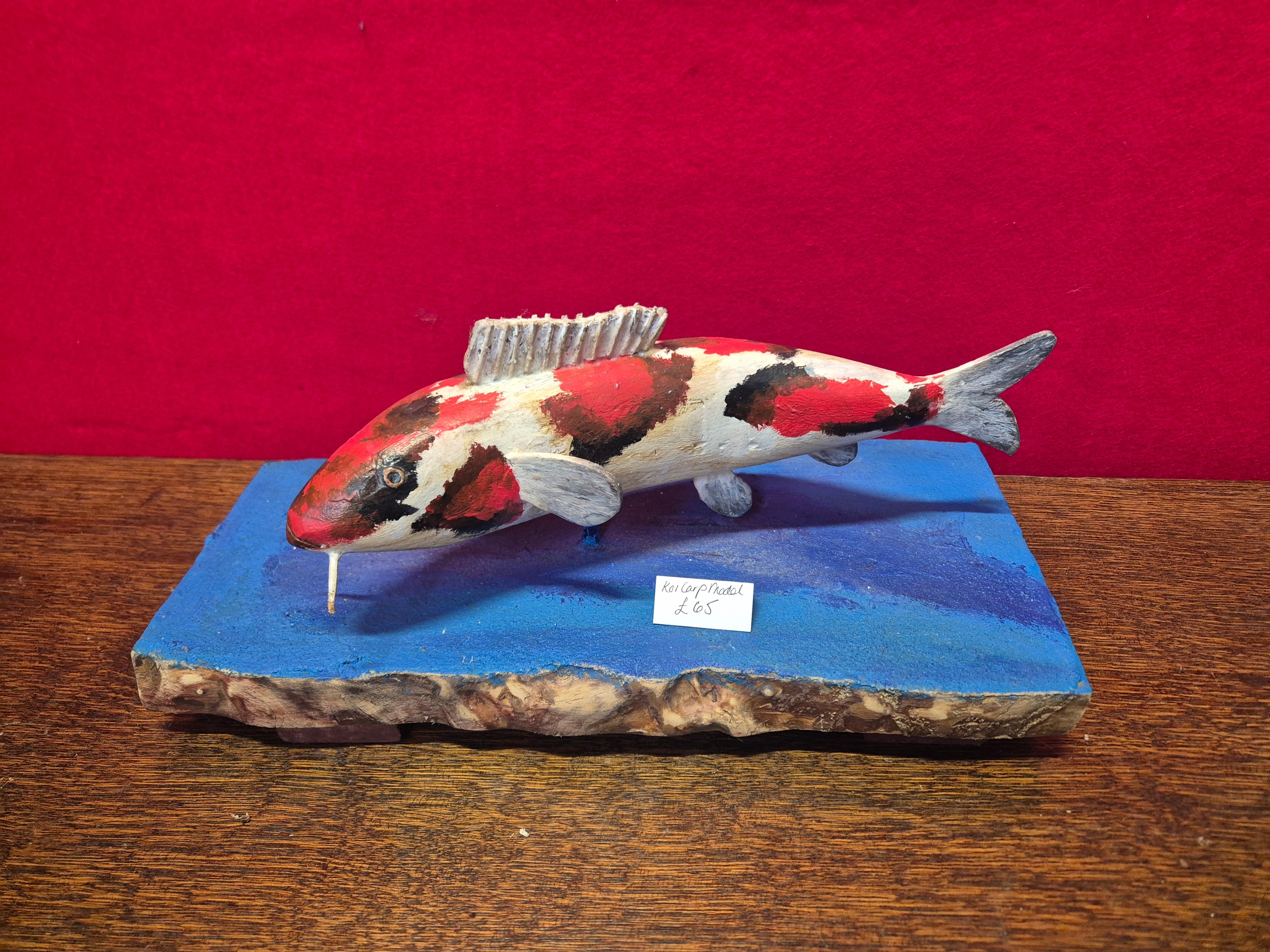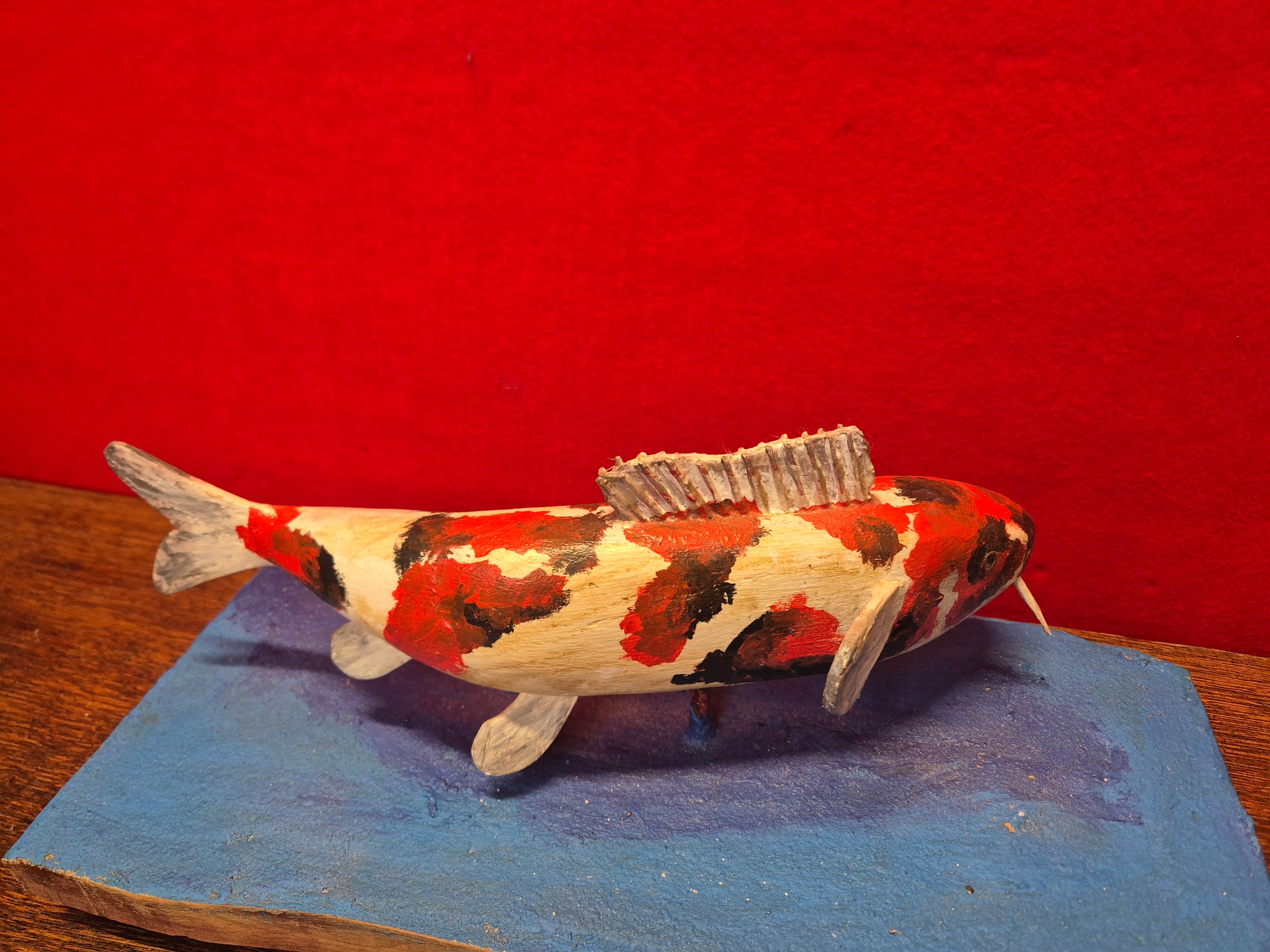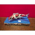 Hand carved and painted Koi Carp model on heavy wooden base.